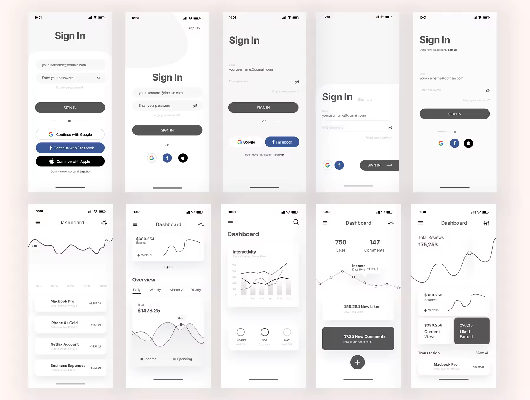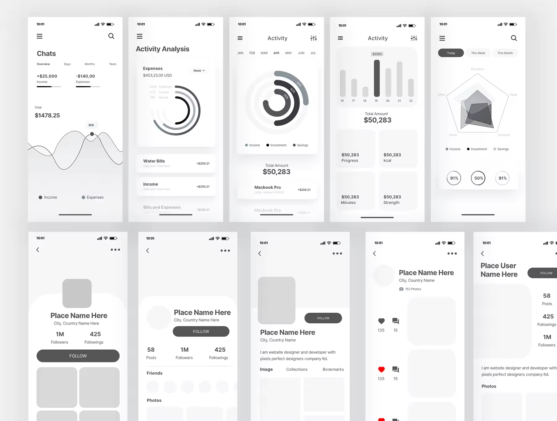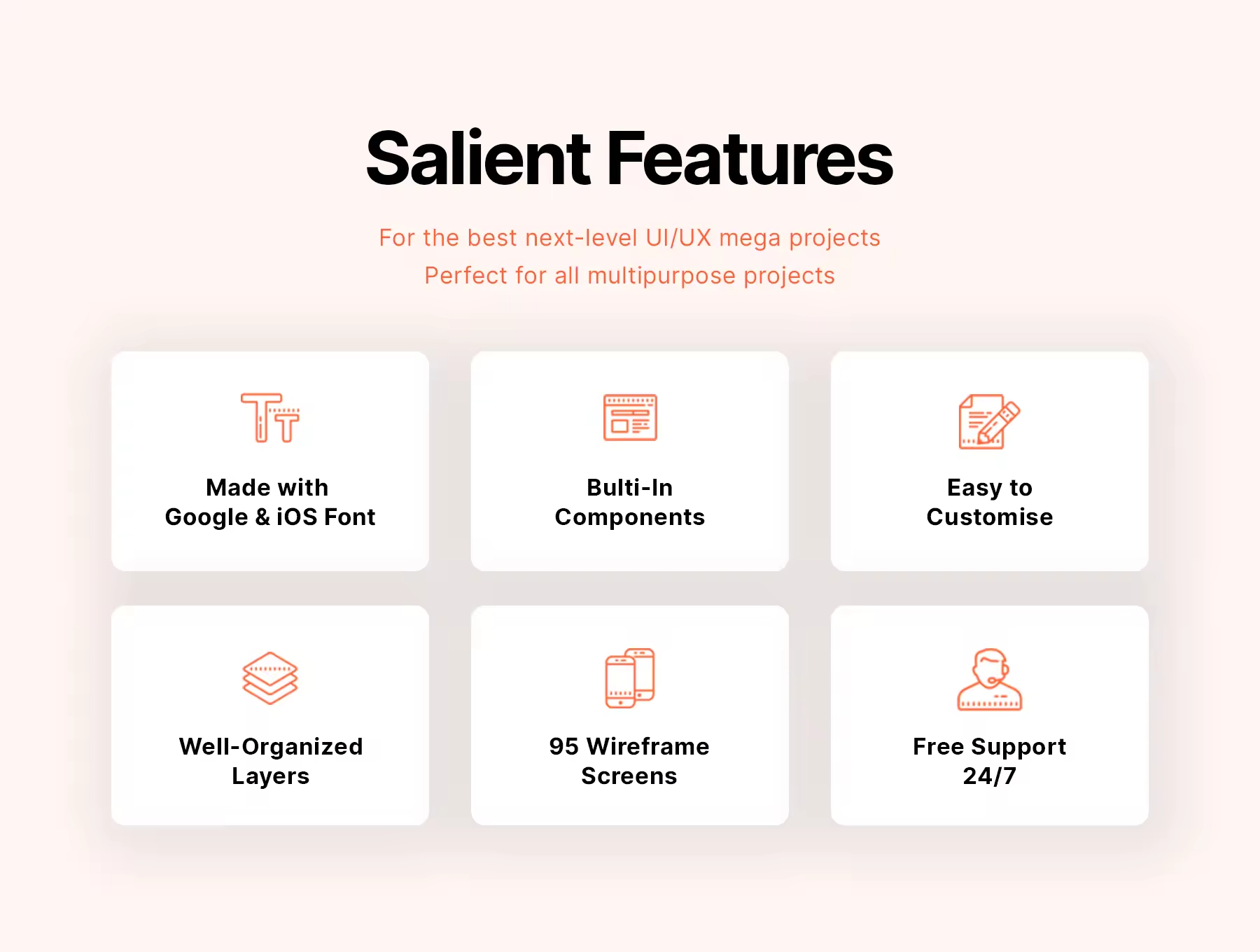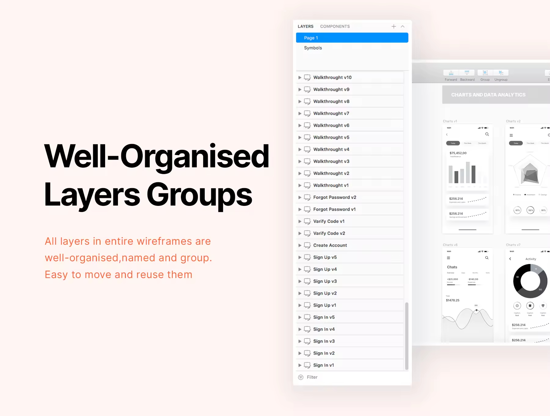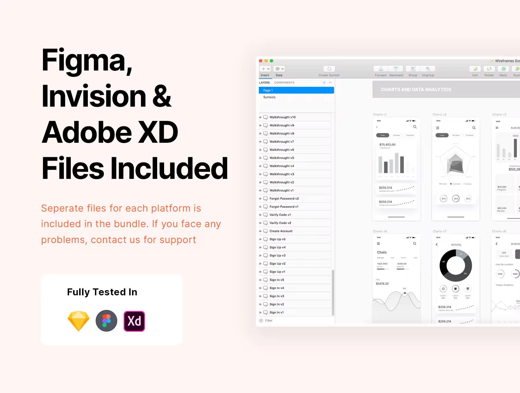 多功能的95个App线框图设计屏幕,原型设计,具有最终组件,可在数秒钟内完成原型制作,从仪表板,登录到配置文件和图表的95个app屏幕,可在几分钟内从包含95个布局和组件的库中构建应用APP线框。结构良好的符号和样式指南,拖放设计组件以满足各种设计需求。适用于应用程序设计上任何类型的9个惊人的最常用类别(签名,注册,OPT代码,演练,菜单,个人资料,仪表板,搜索,聊天,电子商务,图表,数据分析)。