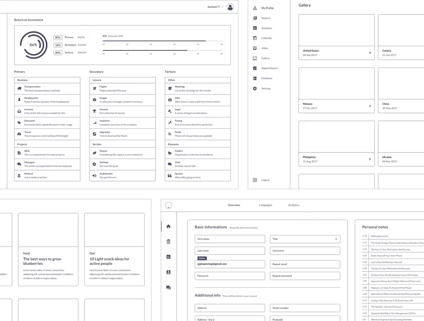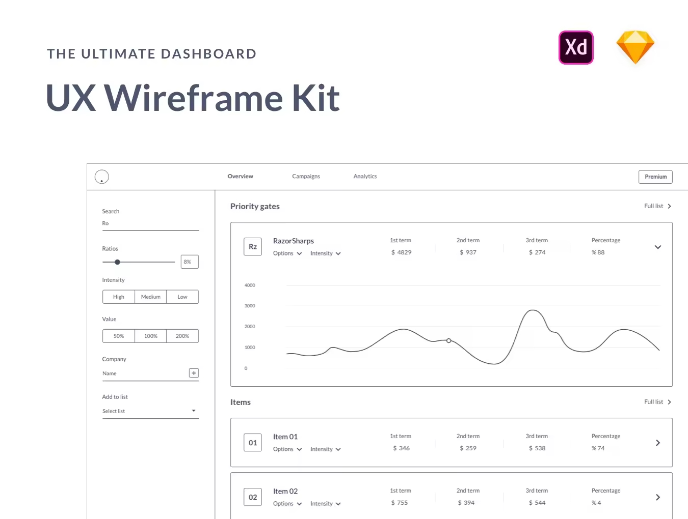 该线框图模板包括符号和图层样式,因此您只需单击几下即可轻松更改整个UX工具包的版式和某些组件!大多数组件和组还具有响应性和可调整大小,因此您可以快速轻松地将这些屏幕调整为自己的自定义仪表板。请注意,Adobe XD文件当前不包括符号,图层样式和响应功能。