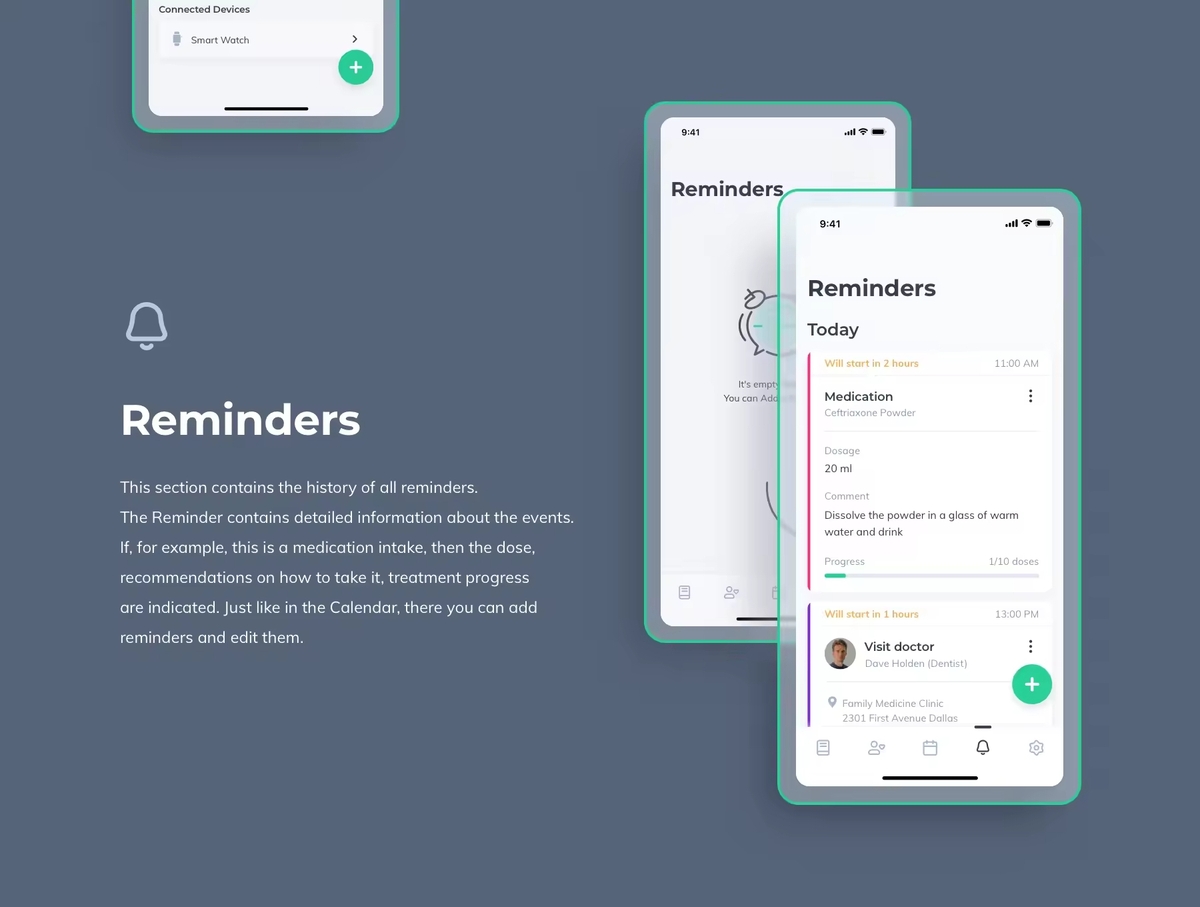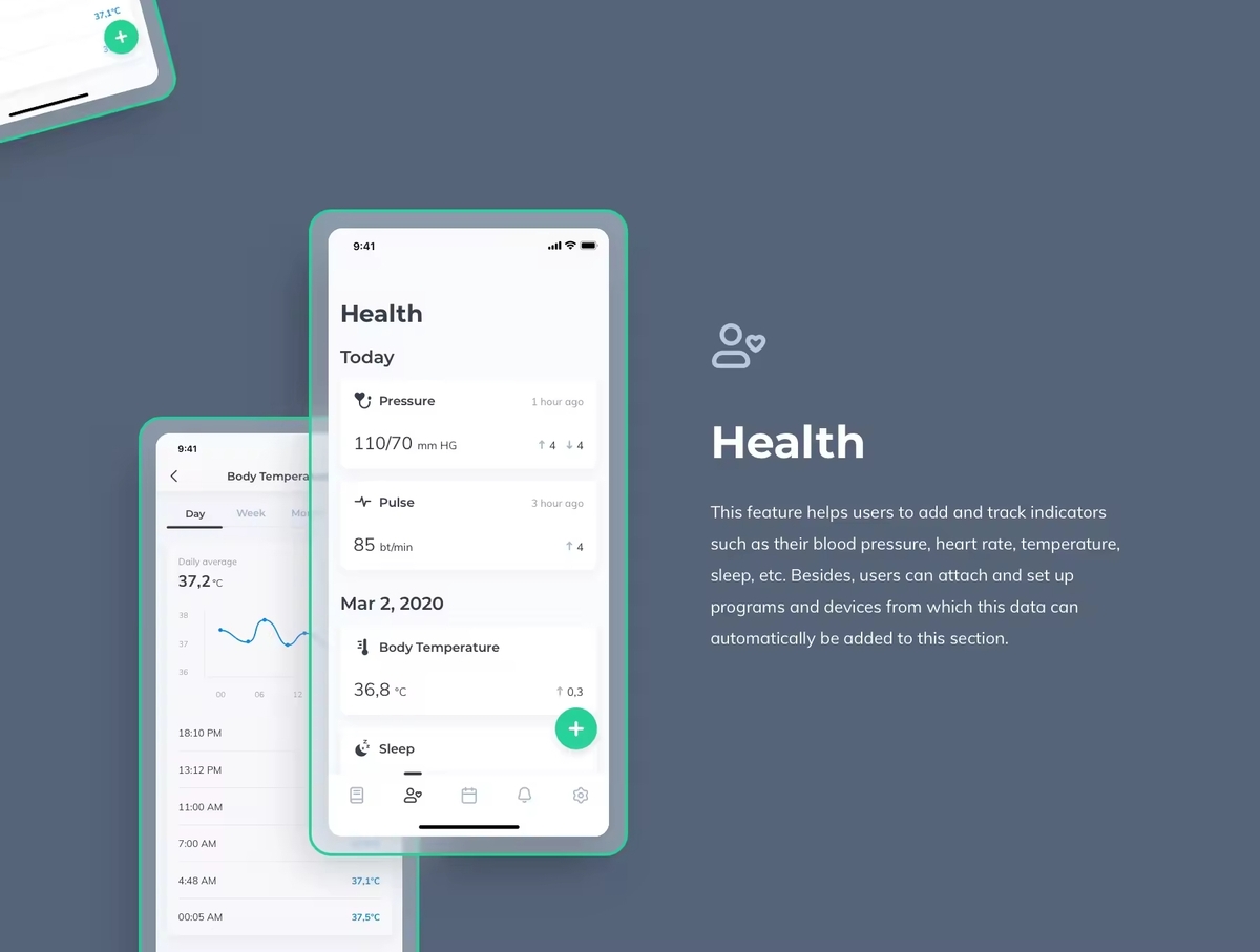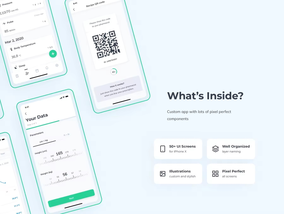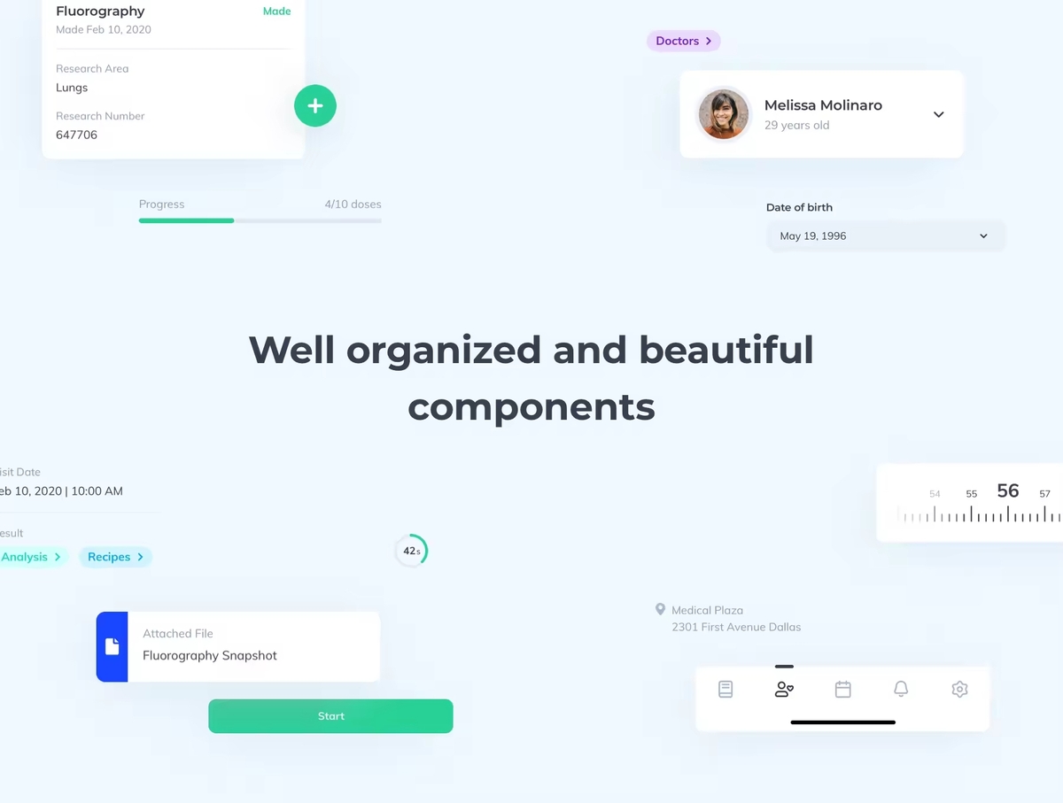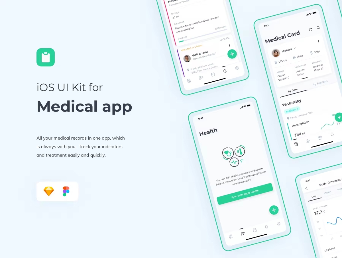 此用于iOS的医疗保健类 App UI套件的真正优点在于,它为健康和保健服务创建了一个更方便的地方。用户可以保持其医疗记录的安全性和最新性,与医疗保健专业人员和亲戚安全地共享它们,轻松,快速地跟踪其指标和治疗。