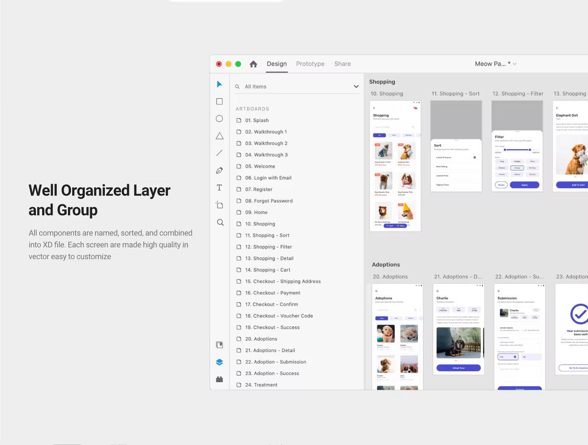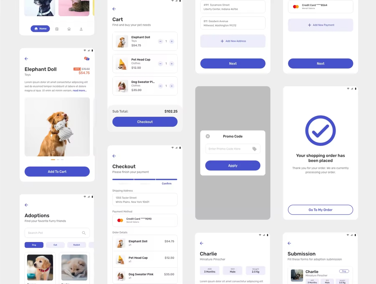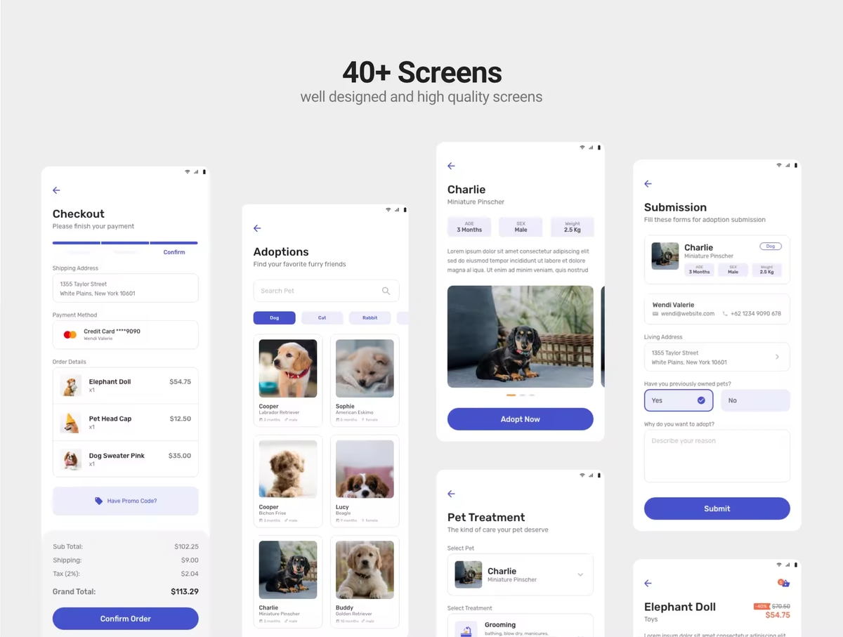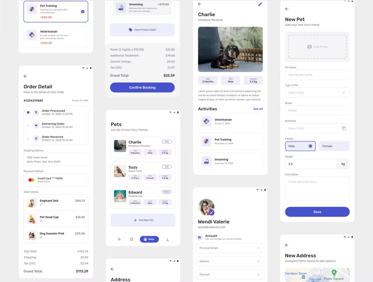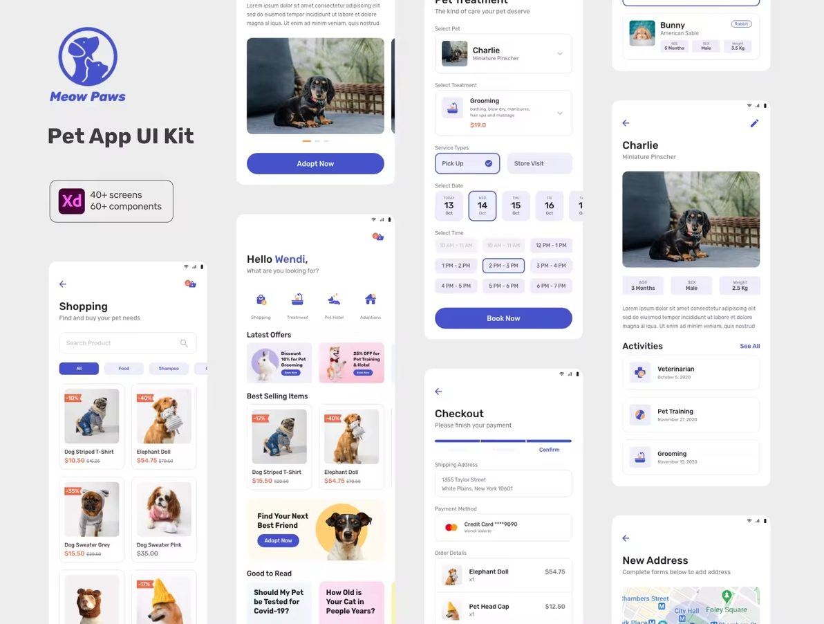 宠物类App应用程序UI套件,涵盖了许多宠物企业。您可以用来创建宠物移动应用程序的多用途,例如宠物店,宠物美容,兽医,培训,宠物旅馆和宠物收养。它在分层和有组织的元素中包含40多个屏幕和60多个组件。