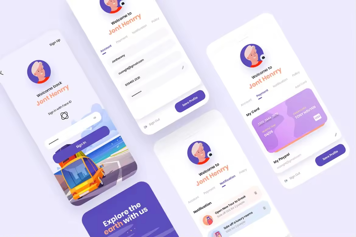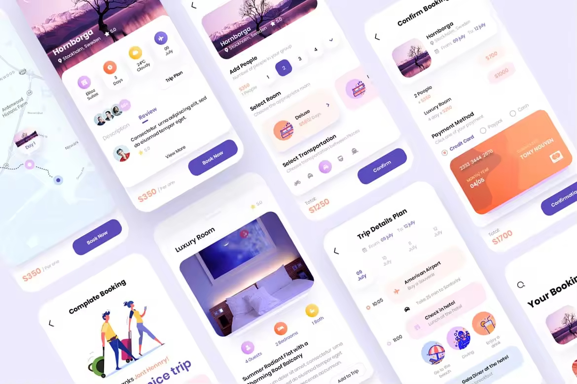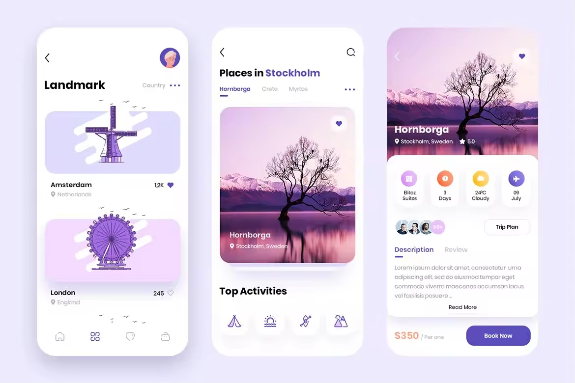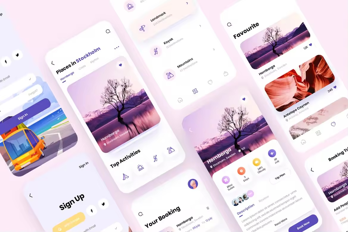 现代,简洁,多功能且专业的旅游移动App应用UX/UI设计模板。包括专为移动App设计的多个布局和UI元素。很棒的配色方案。