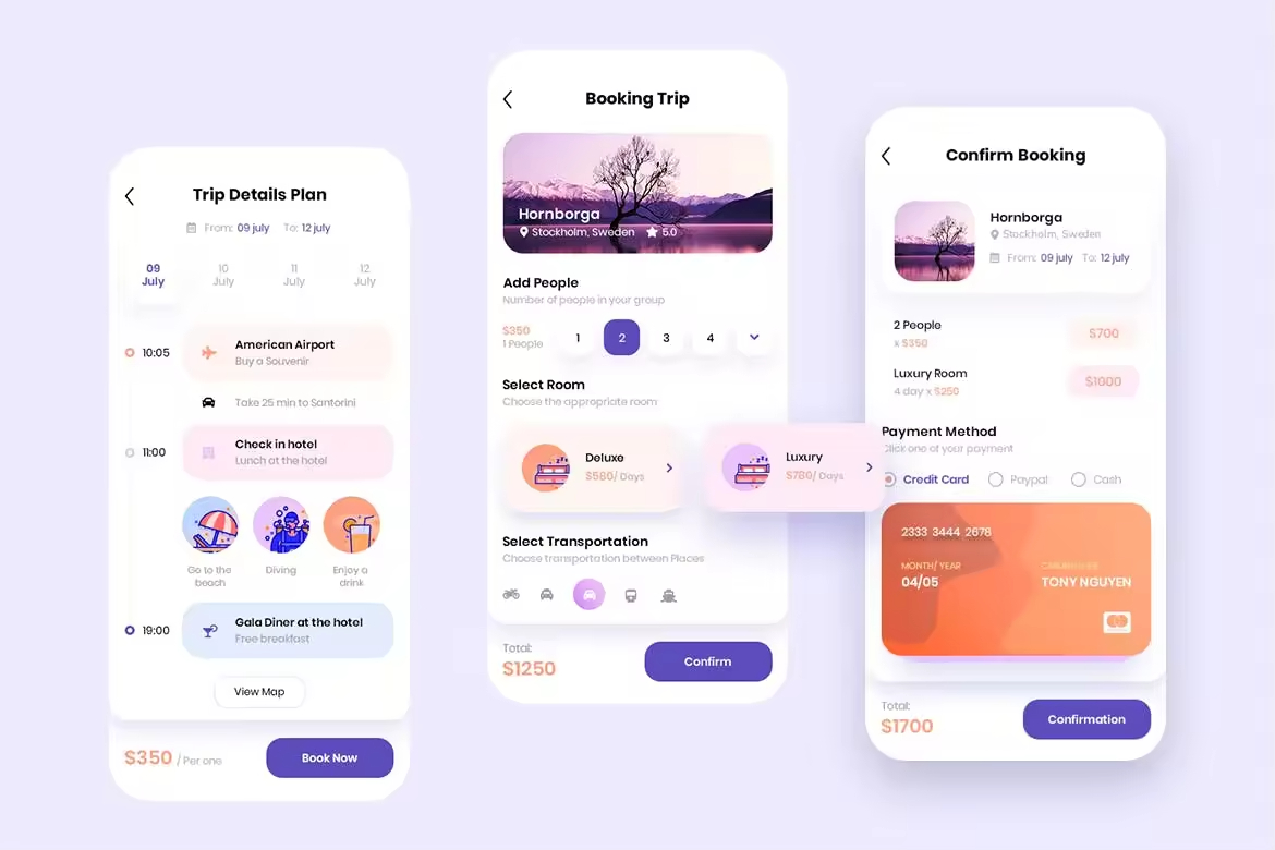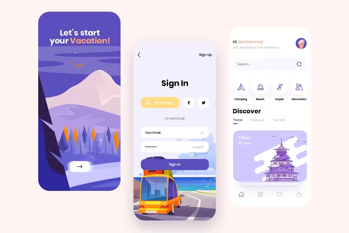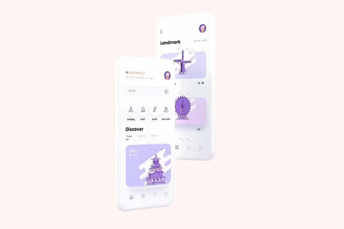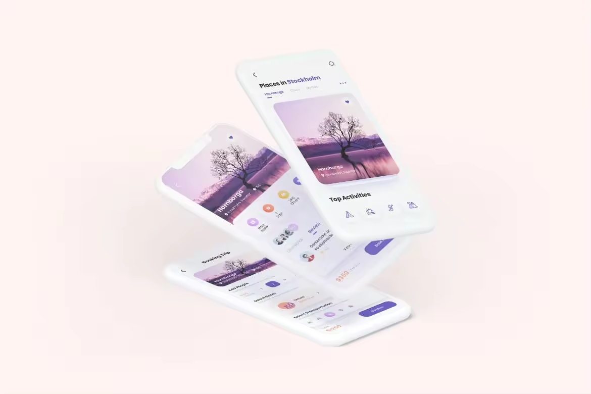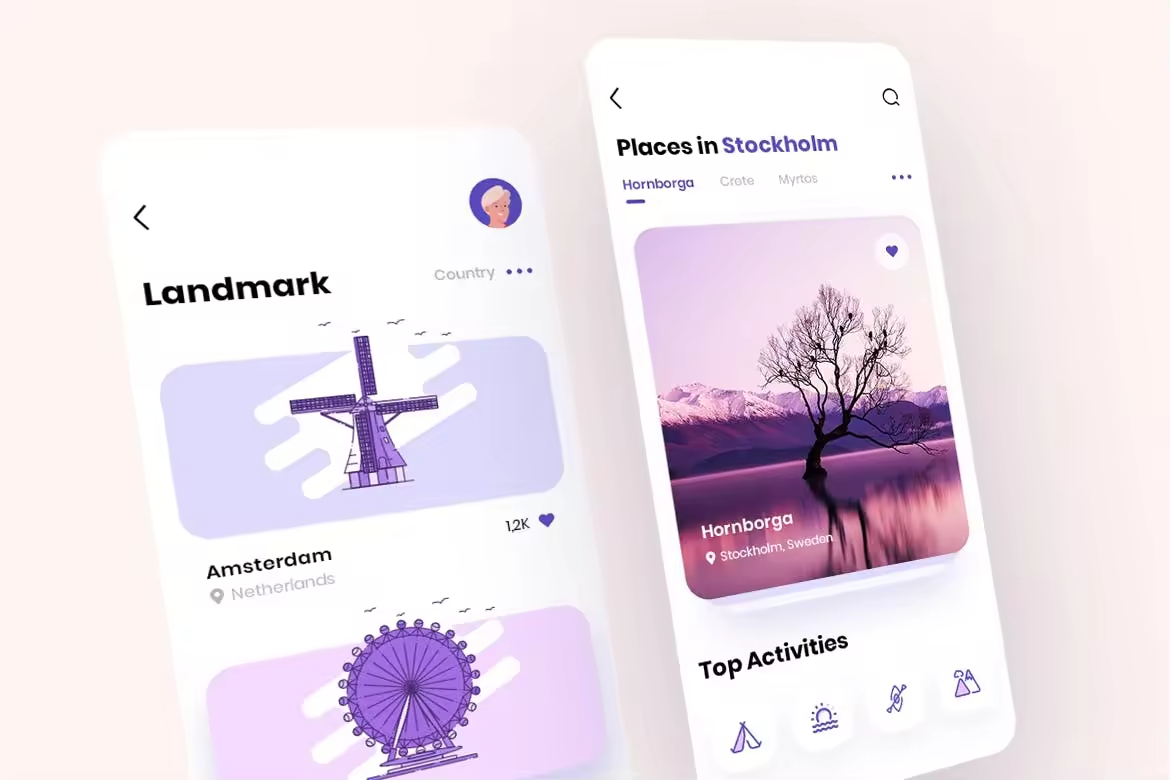 现代,简洁,多功能且专业的旅游移动App应用UX/UI设计模板。包括专为移动App设计的多个布局和UI元素。很棒的配色方案。