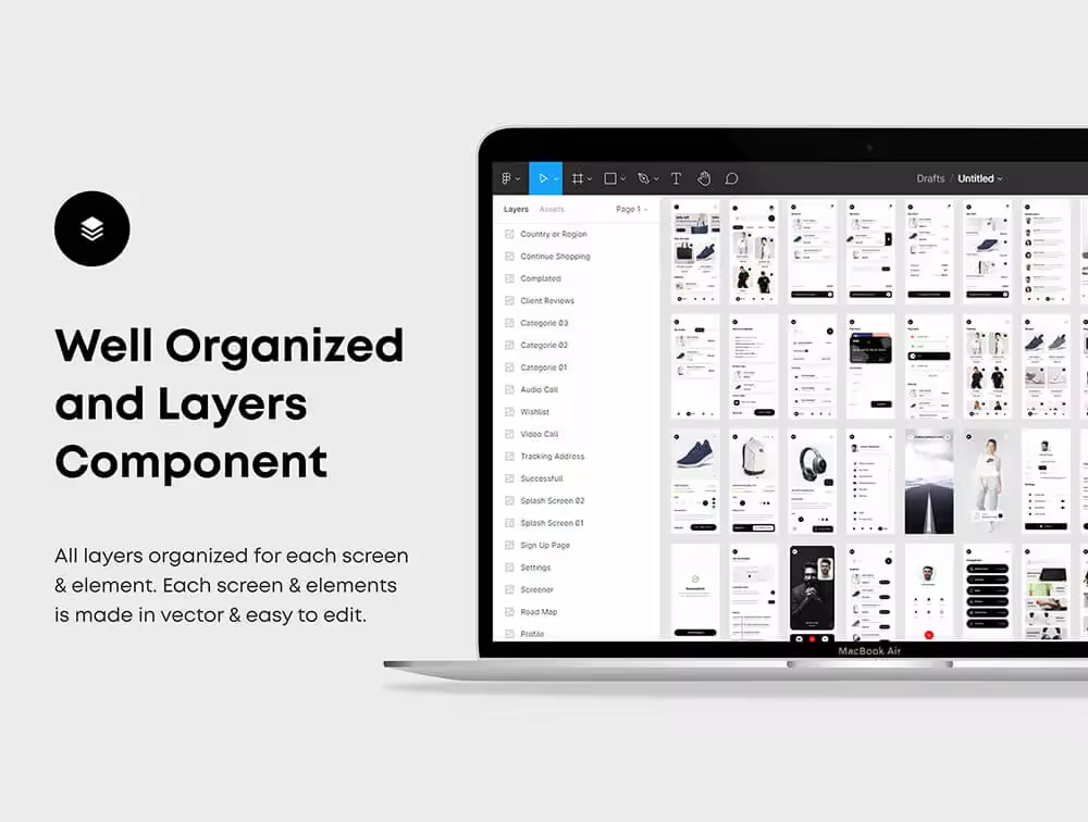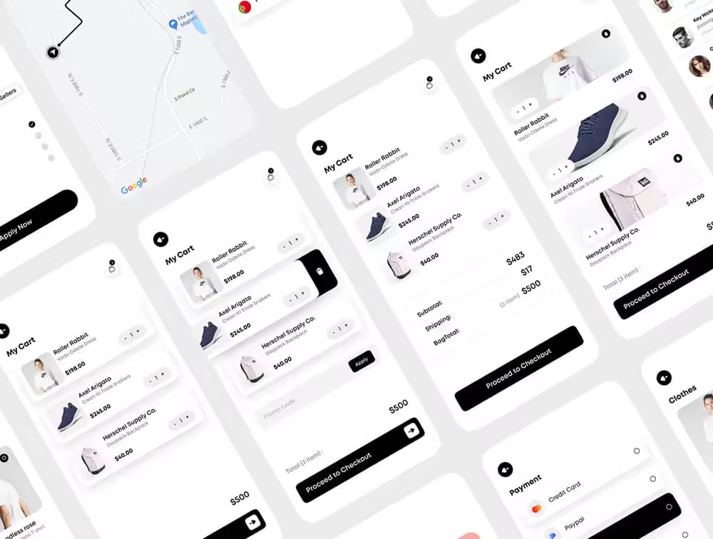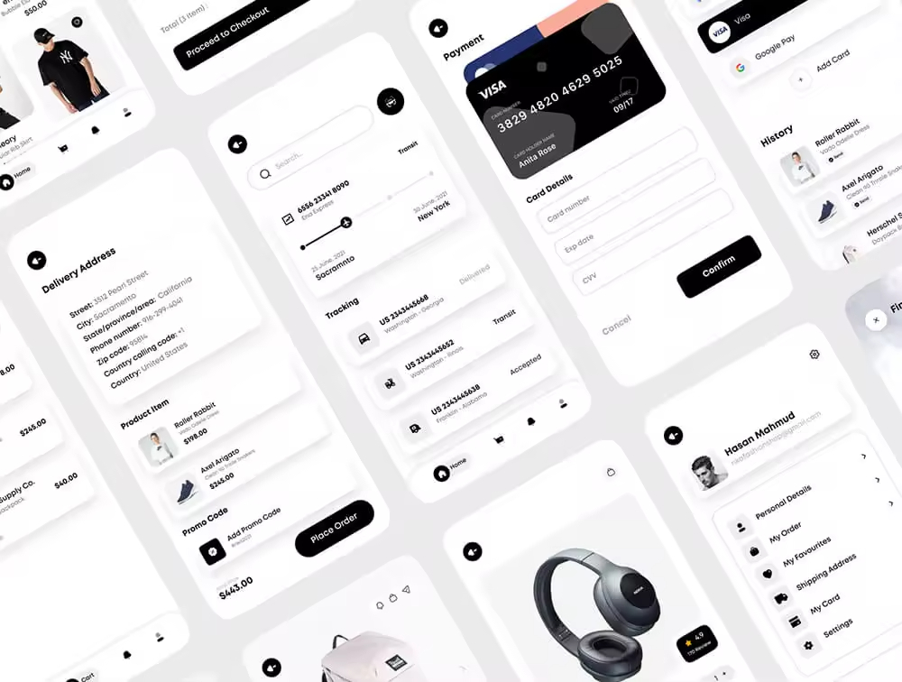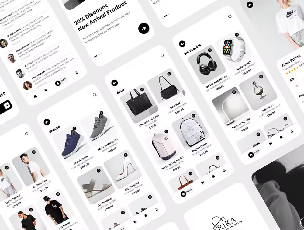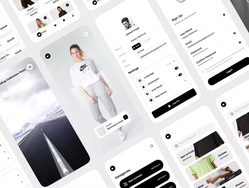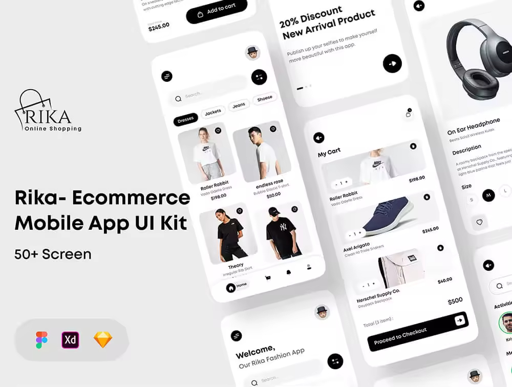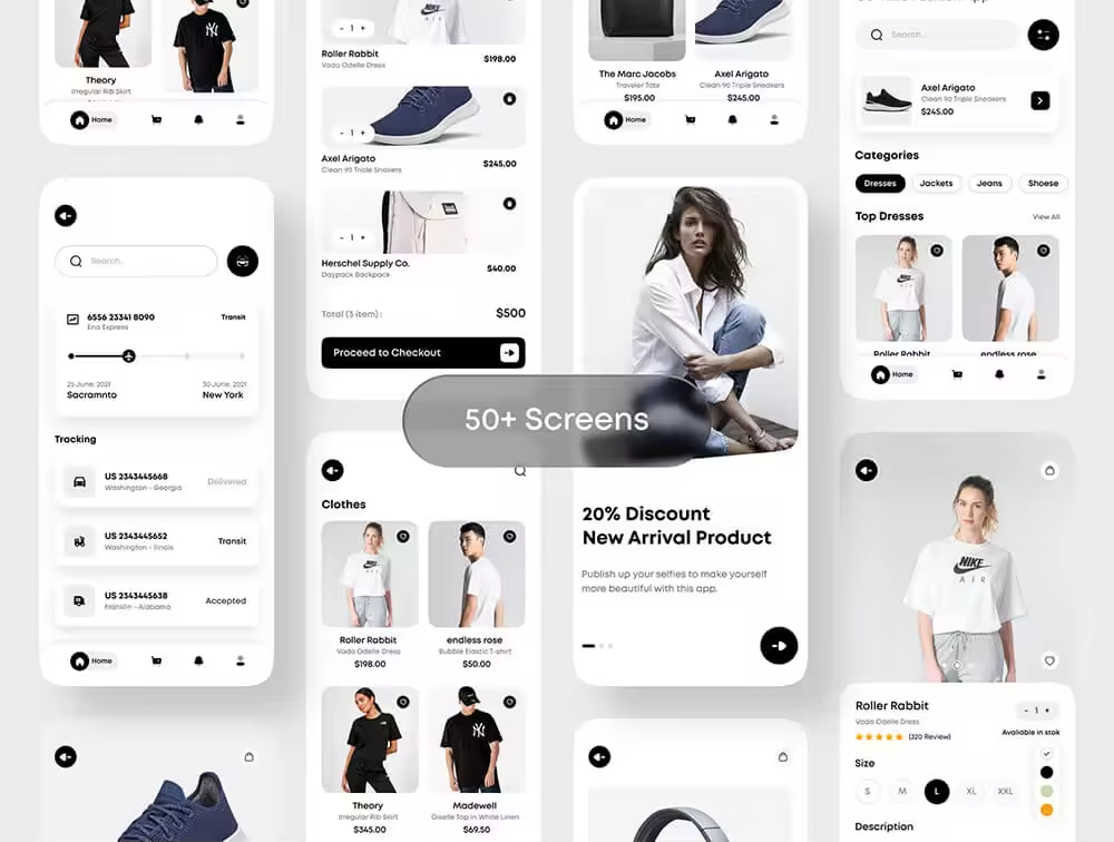 电子商务移动应用程序 UI 套件。这些电子商务移动应用程序 iOS 和 Android 非常易于使用。可以根据您的选择轻松购买任何产品。您可以从家中的网上商店订购。我们为男孩和女孩设计了各种新产品。这些应用程序设计为黑白组合。电子商务移动应用程序是一款完美的 figma、adobe XD、sketch,以分层和有组织的元素设计了 50 多个屏幕。每个屏幕都完全可定制、易于使用,并且屏幕可用于 iOS 和 Android 应用程序。您可以轻松更改任何设计,它很容易定制。