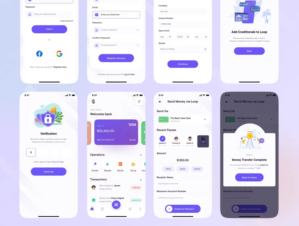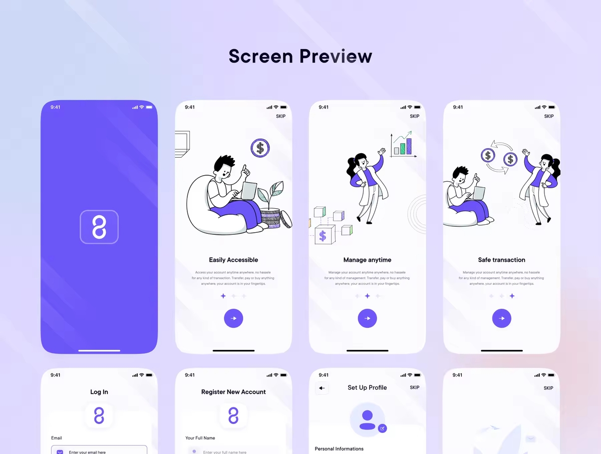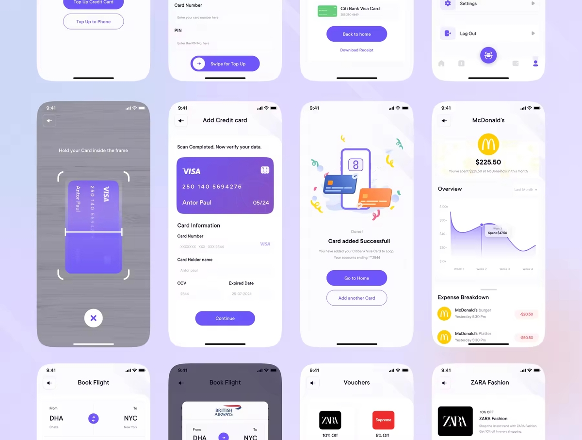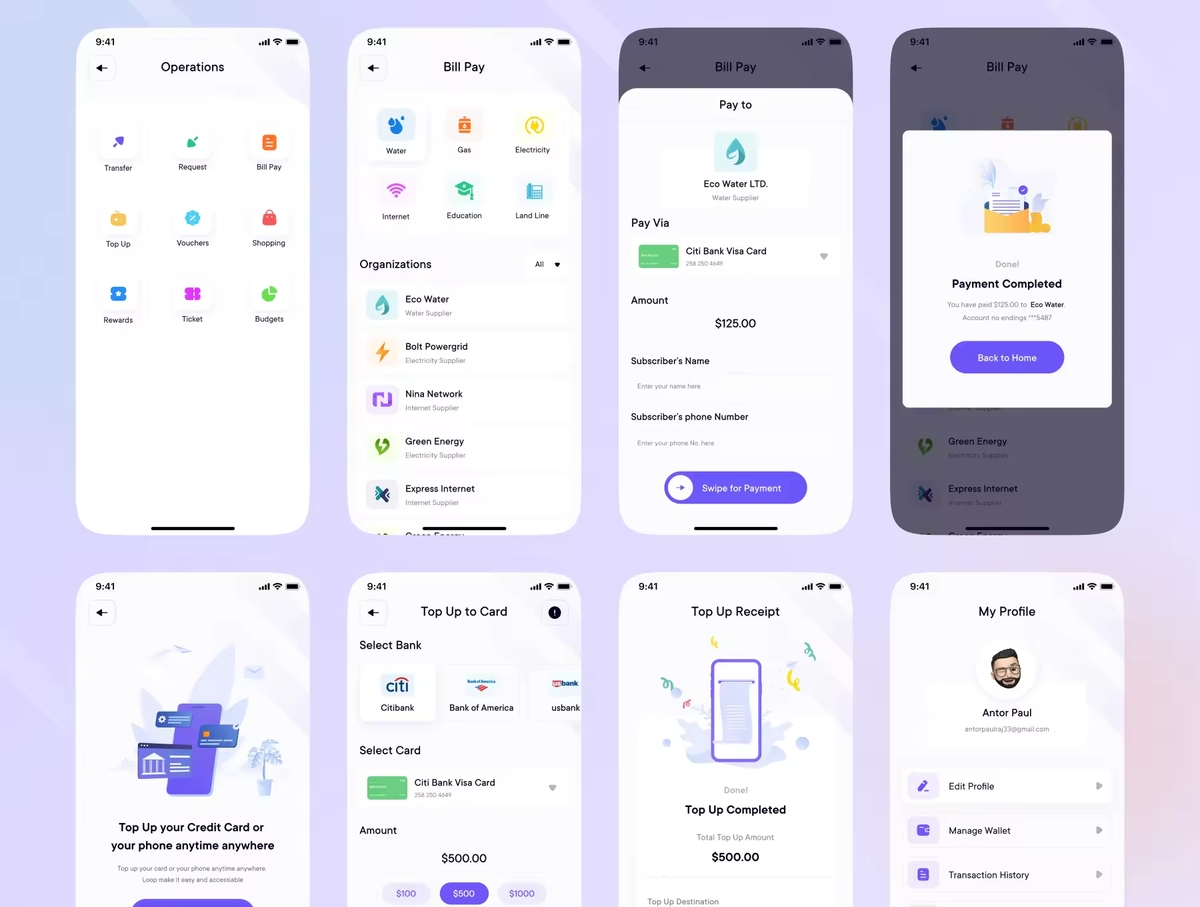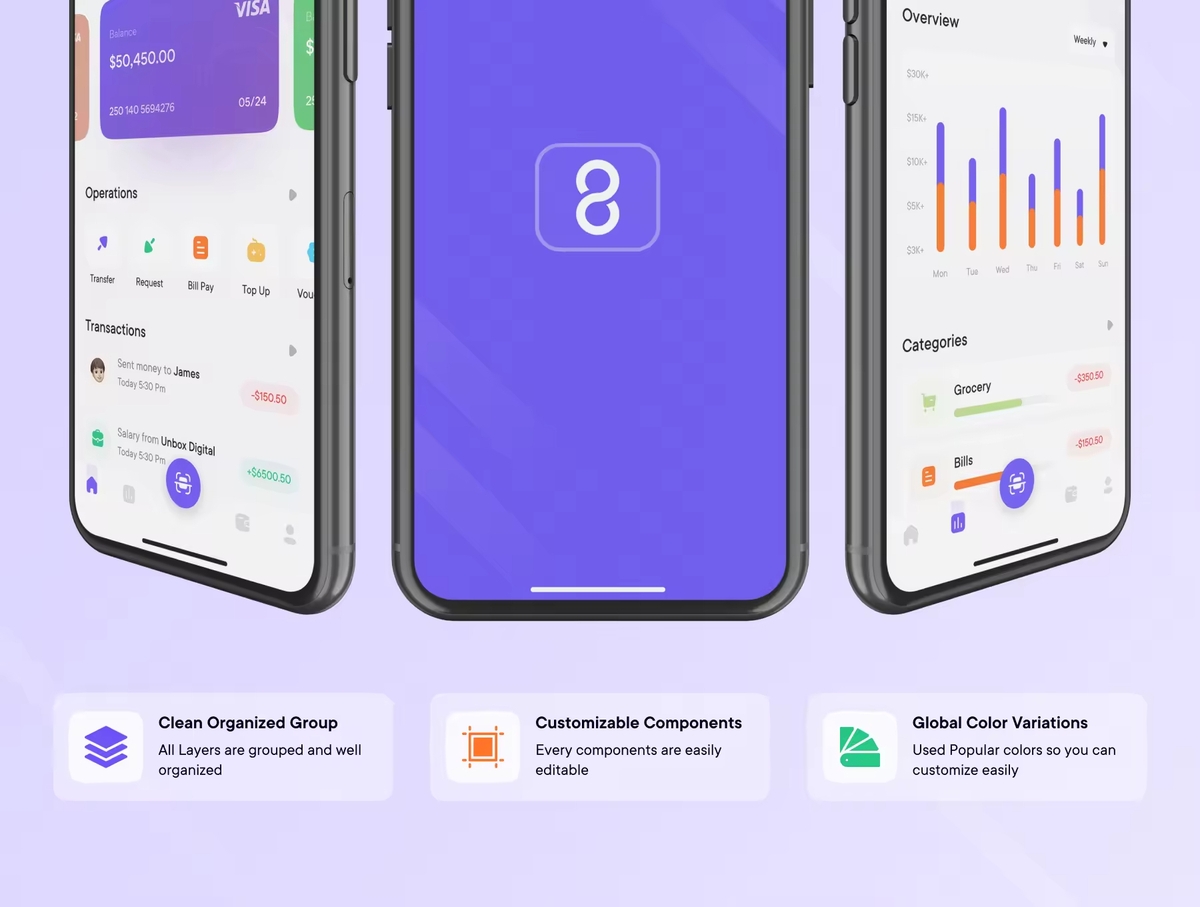 数字钱包App应用iOS UI 套件,让我们向无现金世界迈出一大步!用户可以在这里查看可用余额、转账、充值、凭证、账单支付、网上购物、获得奖励、购票。