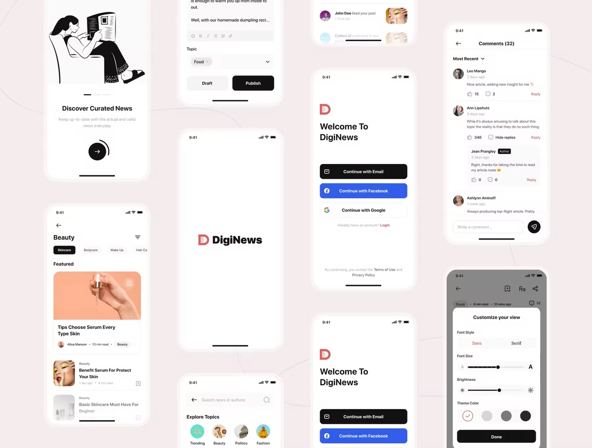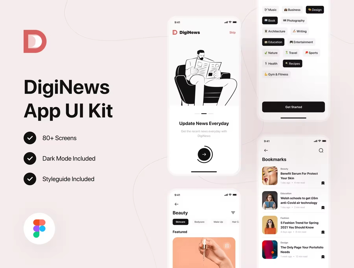 这是一个高级文章和新闻应用 UI 套件,由 80 多个像素完美的屏幕组成,并且易于在 Figma 中使用。该套件很容易根据您的喜好完全自定义,它利用了 Figma 的所有功能,包括全局颜色、字体样式、动态组件和变体。提供明暗主题。使用这些整洁、干净、现代且出色的设计屏幕开发您的移动应用程序。