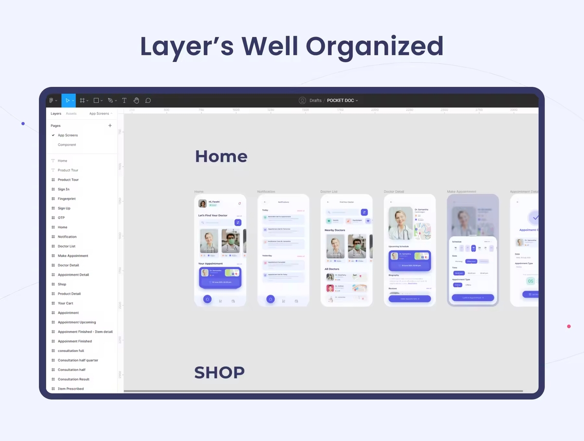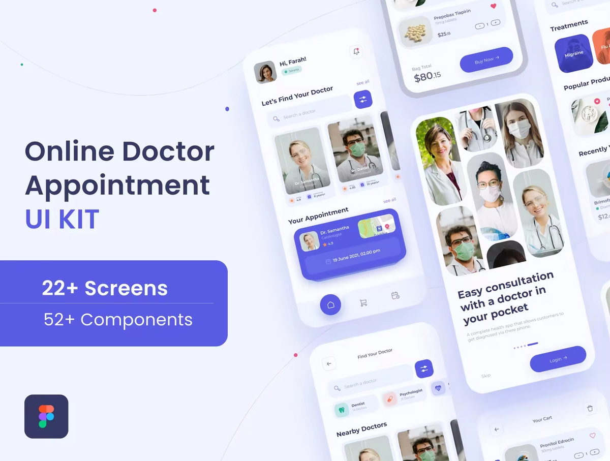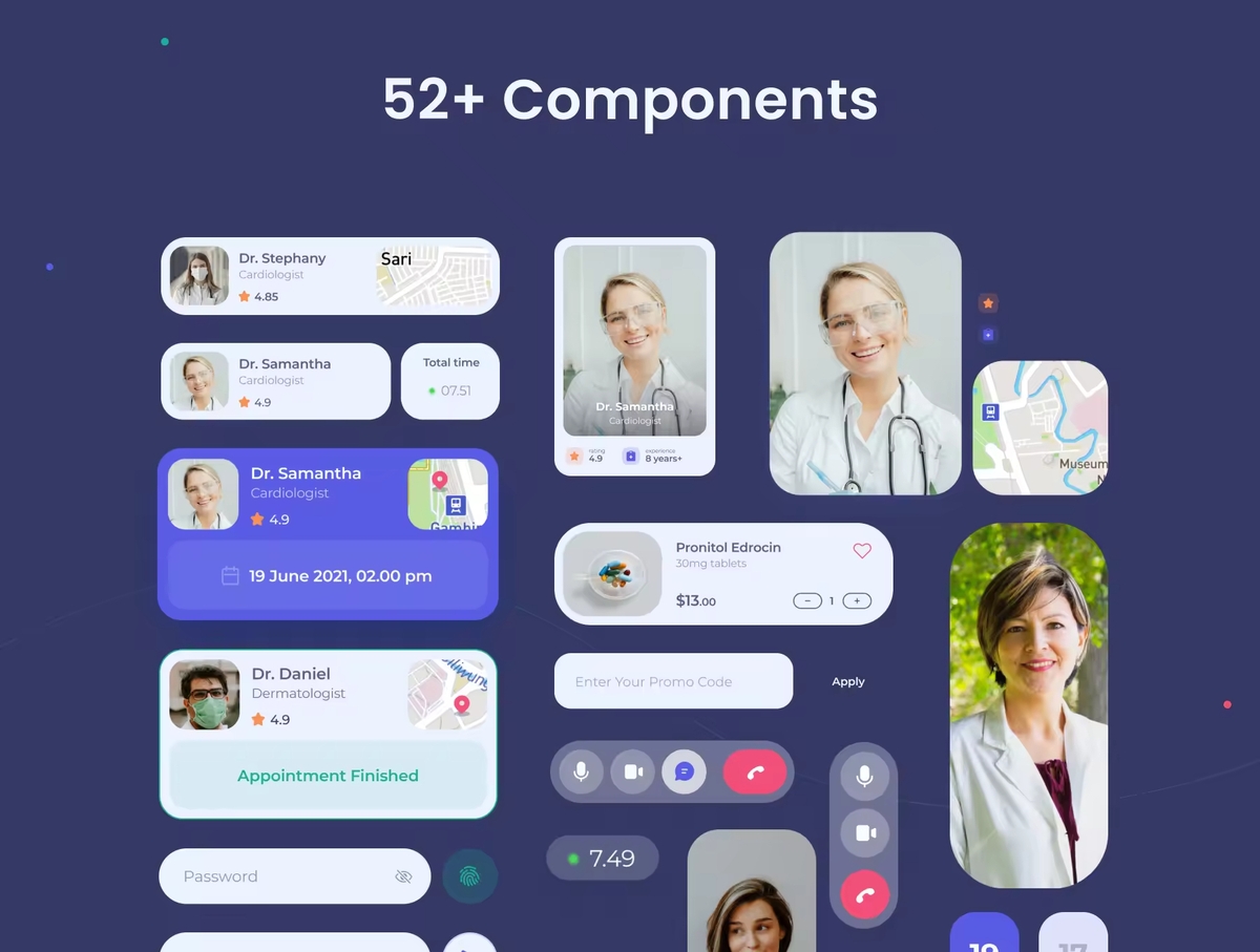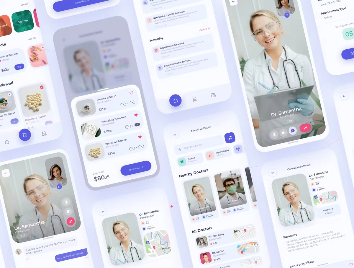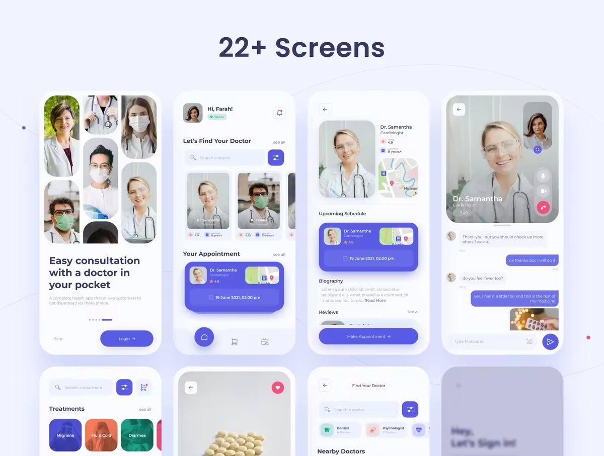 在线医生咨询应用程序iOS UI套件,此应用程序可帮助人们预订医生的日程安排。使用此应用程序预约并购买药物。