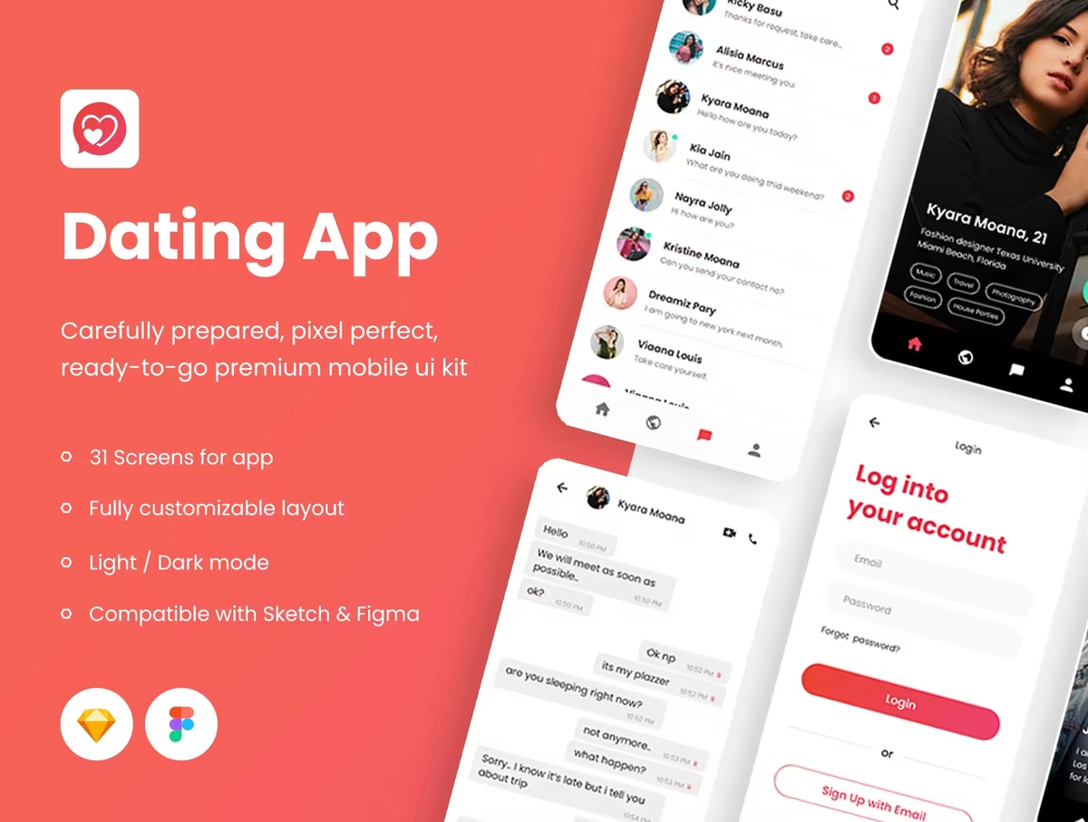 约会应用 UI Kit 是一组精致的 UI 设计屏幕模板,带有 31 个安卓屏幕,可以使用 Sketch轻松编辑。每个屏幕都是完全可定制的,易于使用,并精心分层和分组。