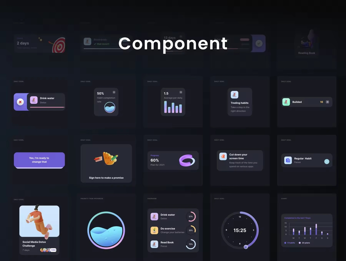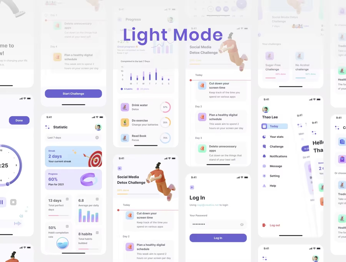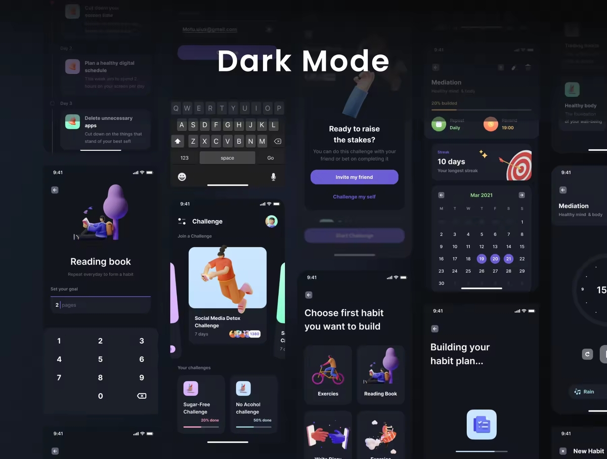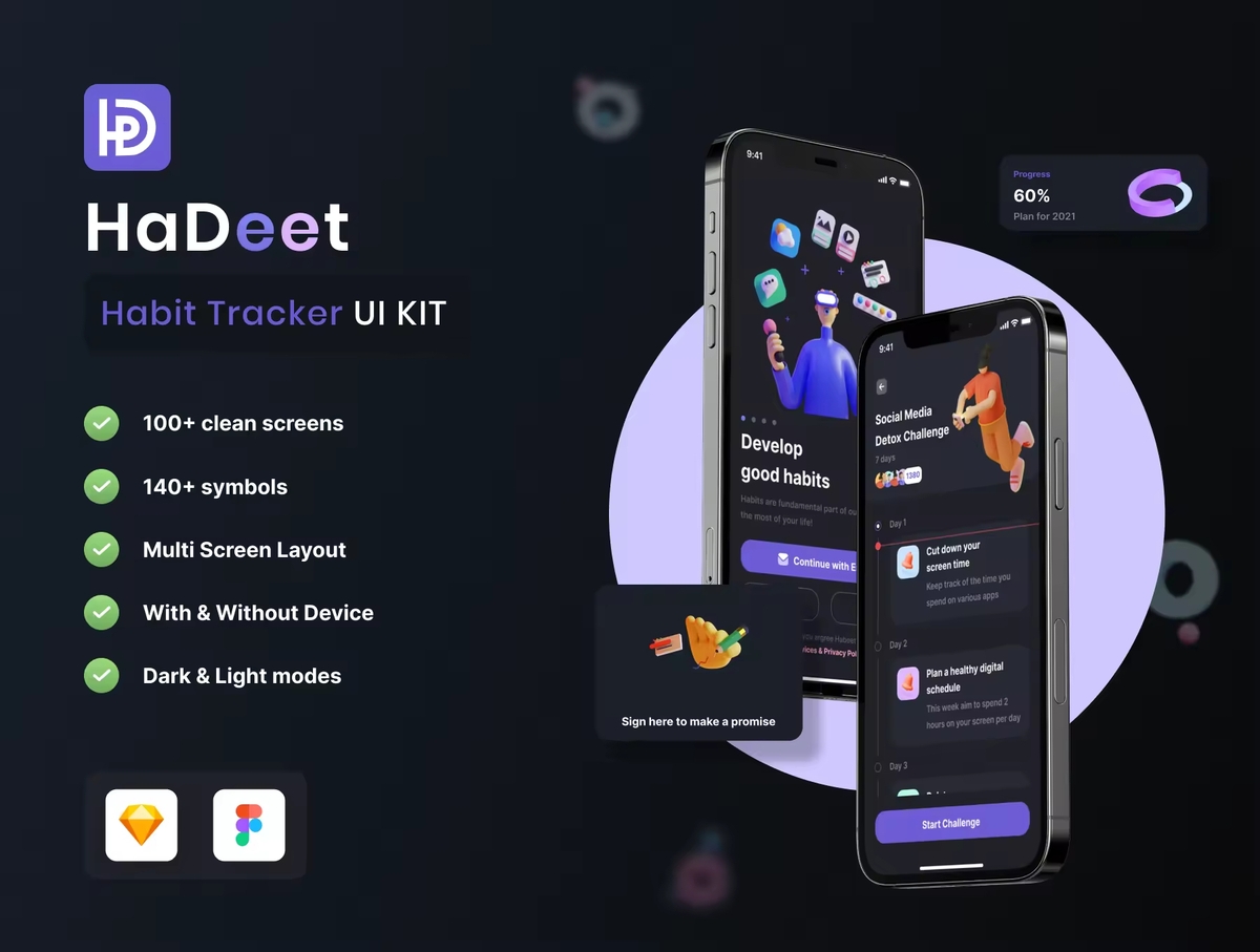 这是一个行为习惯跟踪应用程序 iOS UI 套件,专为 iOS 设备设计。它包括 100 多个精心制作的移动应用程序屏幕和 100 多个组件。您可以使用 使您的下一个 iOS 移动应用程序项目更精彩,对潜在用户更具吸引力。