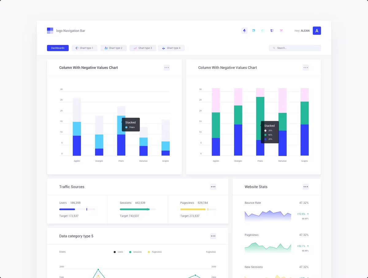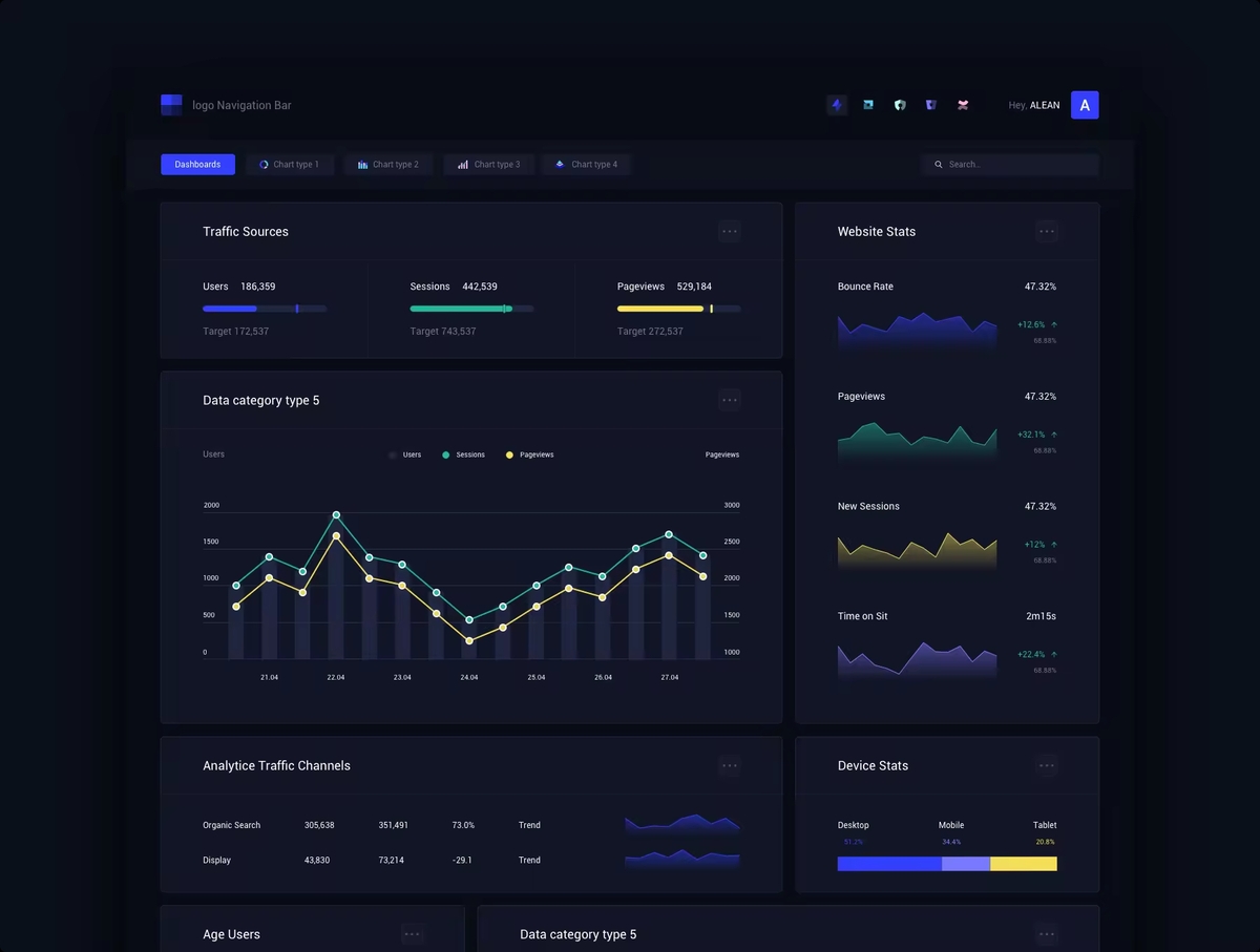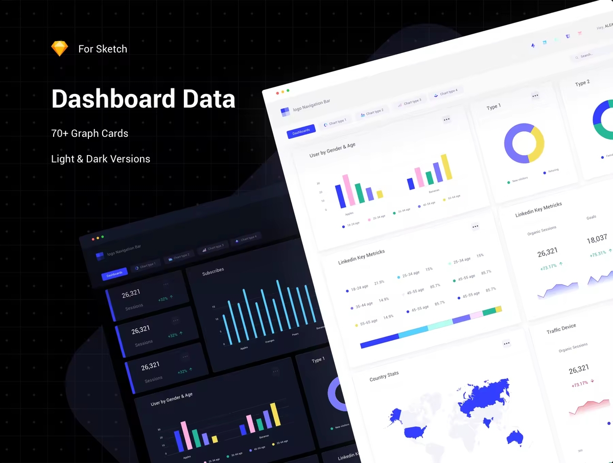 数据可视化仪表板UI套件,白色模式和深色模式,该套件可用于数字货币,金融,股票,数据后端管理,电子商务等,以构建仪表板。惊人的工作来提高您的生产力。
