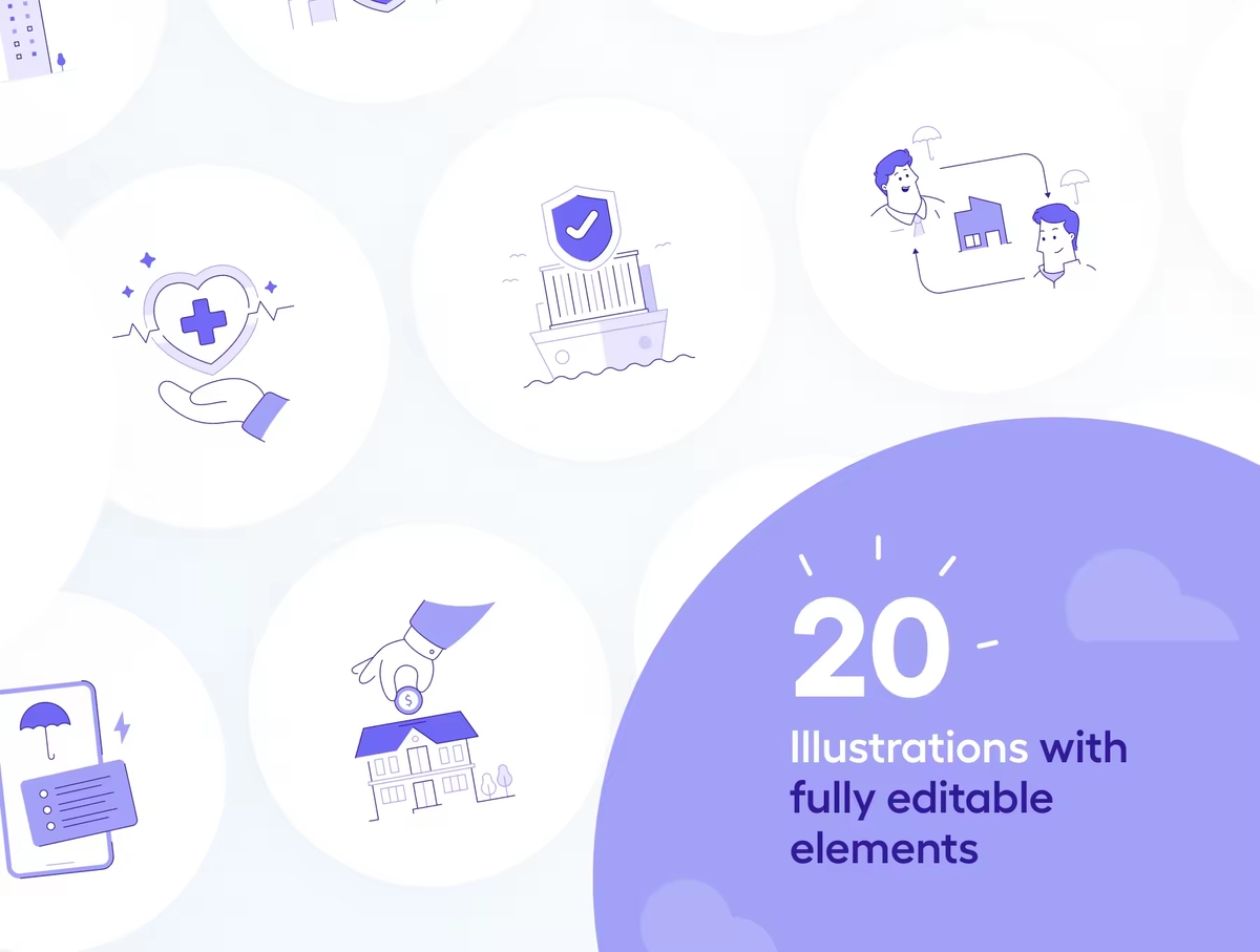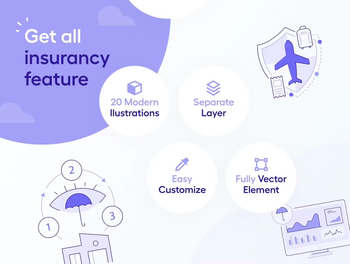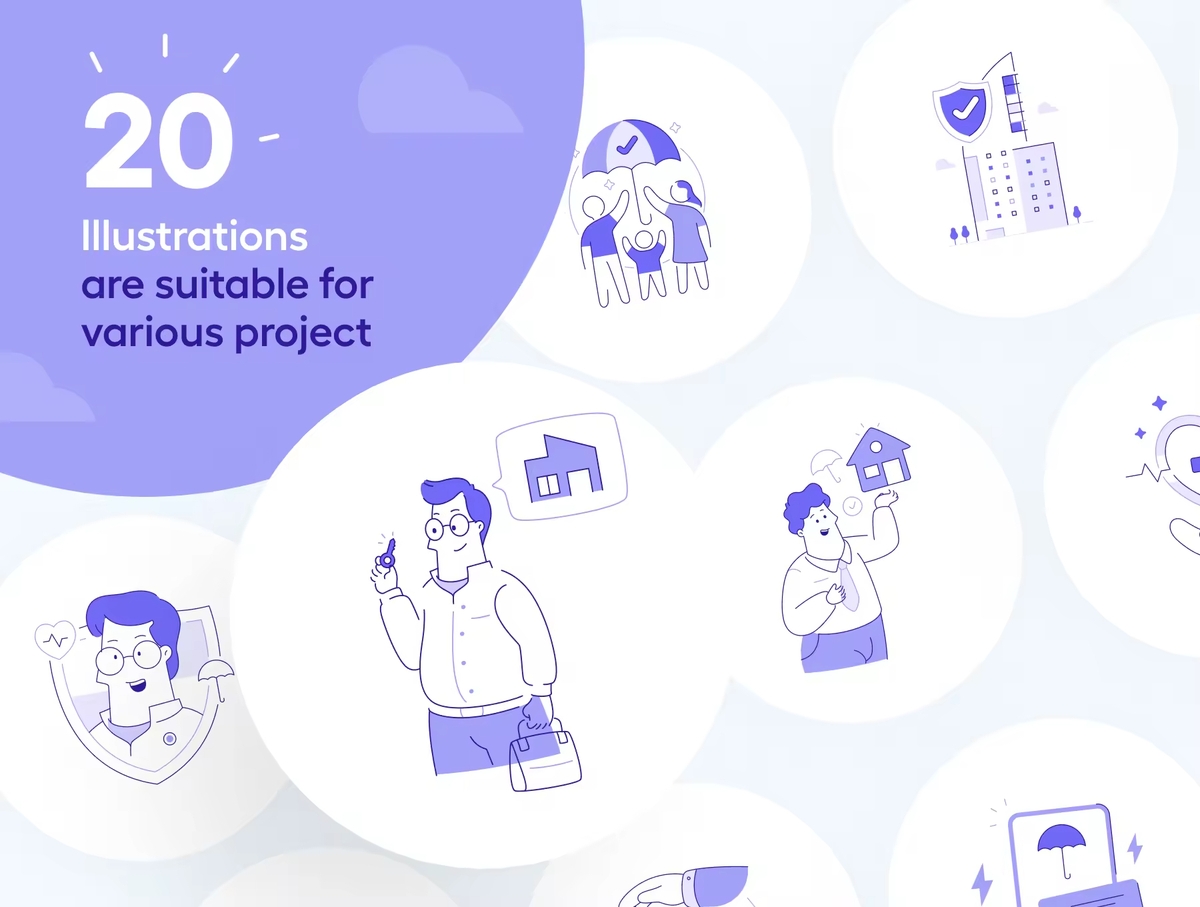 这是一套适用于保险和金融科技领域的定制插画。制作完全分层和分离的矢量对象。非常适合 UI/UX 设计、演示、广告等。100% 矢量可编辑和可扩展。颜色很容易改变。每个插画都经过组织、命名且非常易于使用。