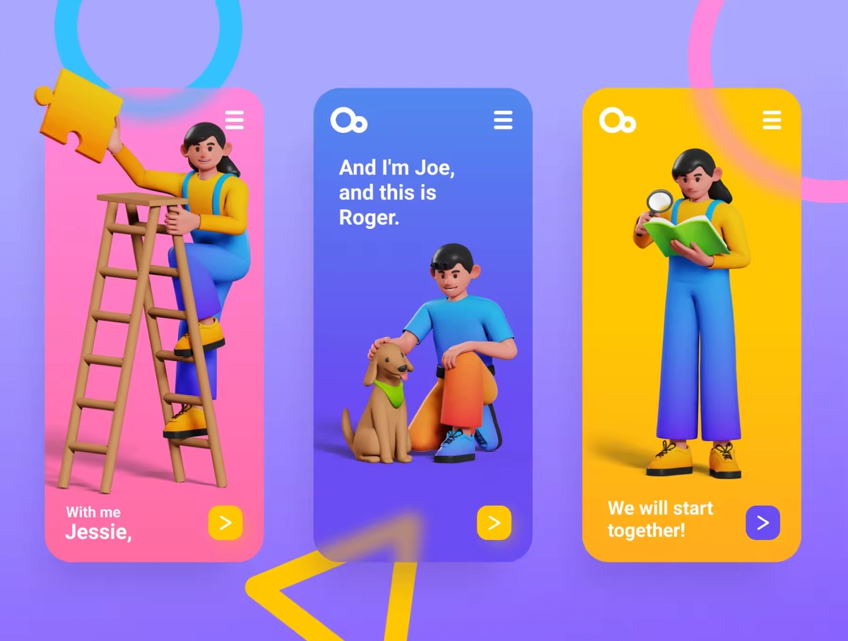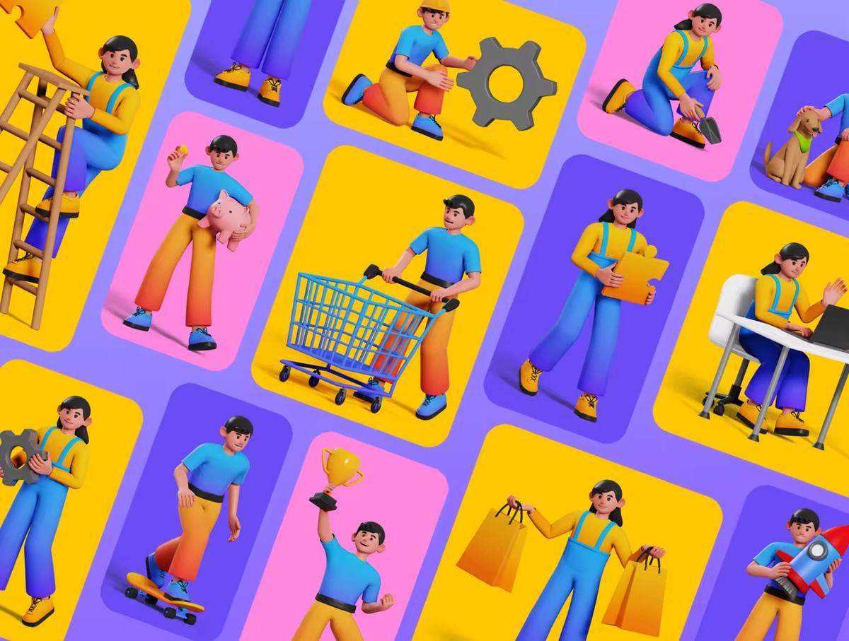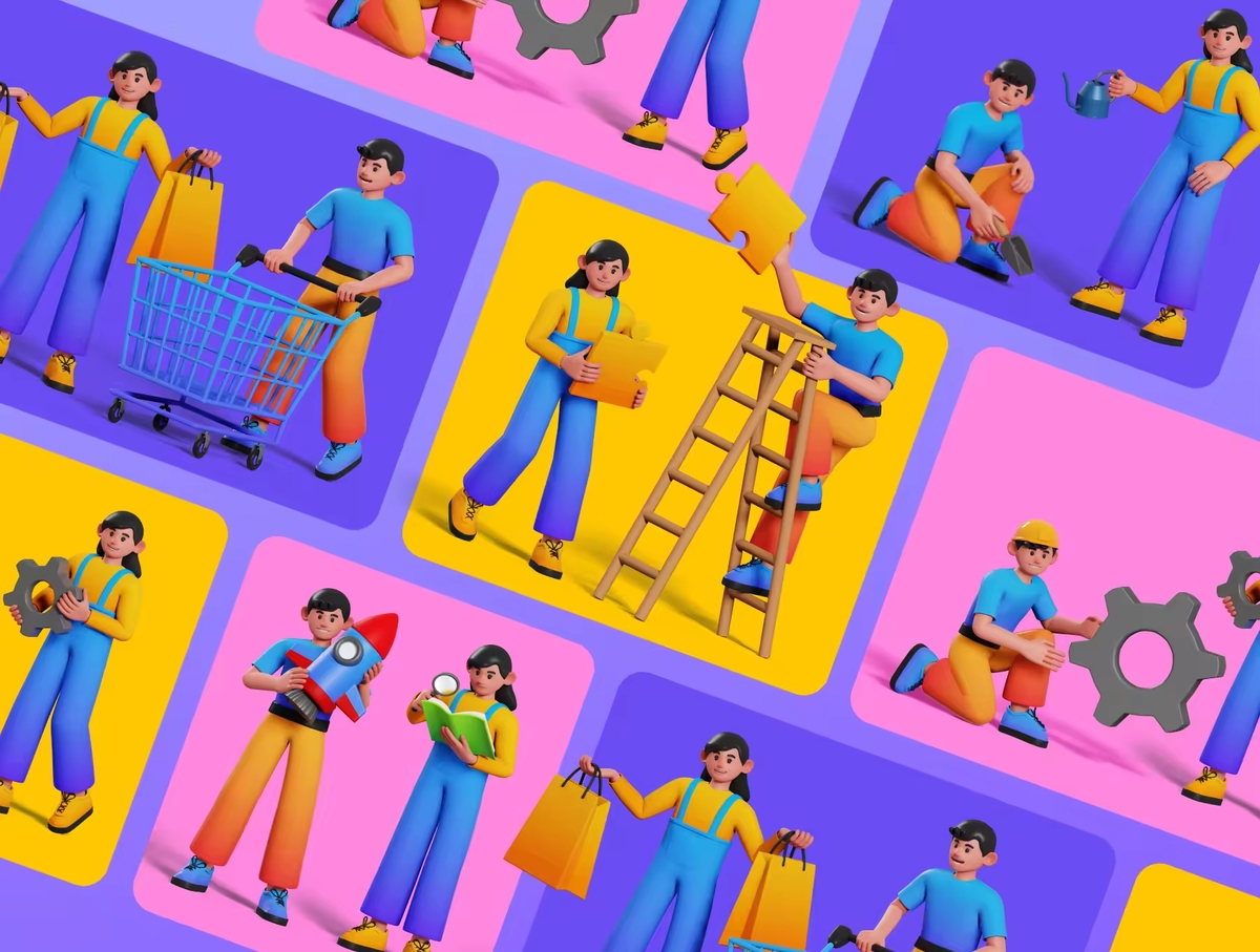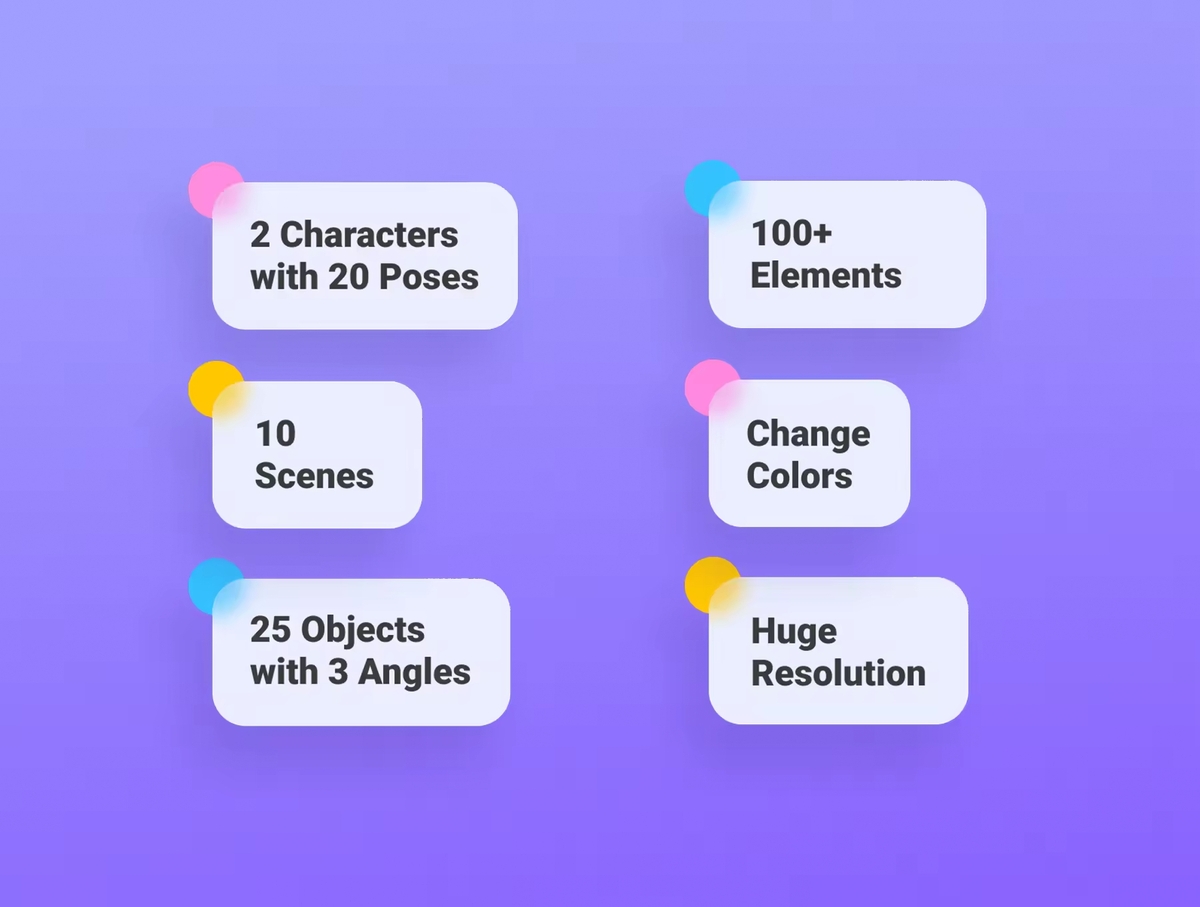 2个角色与100多个元素的插画套件。此插画是用渐变色制作的,使其看起来更具吸引力。您可以更改颜色!以高分辨率显示了所有活动,包括教育,娱乐,工作,购物,Investation,维护,启动,团队合作,每日和交流。因此,请不要担心图像看起来是否破裂。这些3D对象通过层和组井井有条。完美完成UI设计。