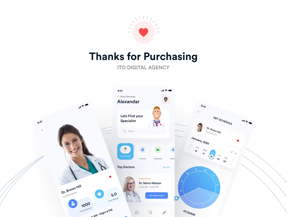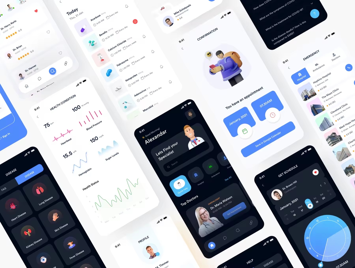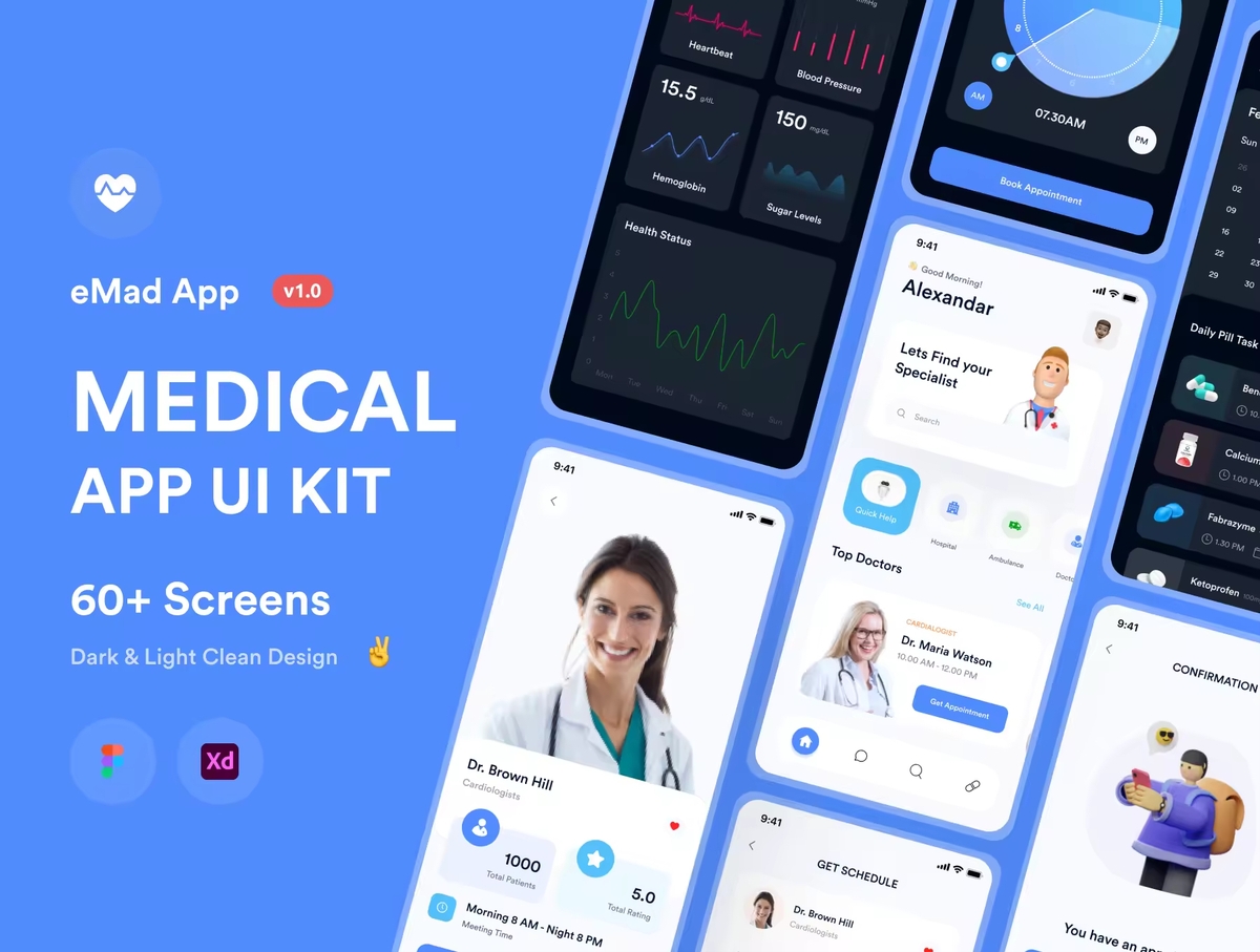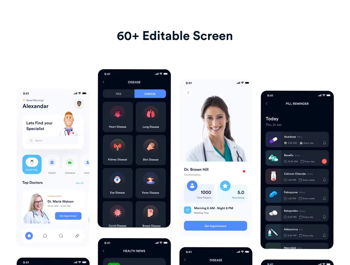 医疗APP应用 iOS UI 套件,用户可以搜索医生并选择任何评价好的医生,也可以从伟大的医生那里获得帮助。用户可以设置药丸提醒。