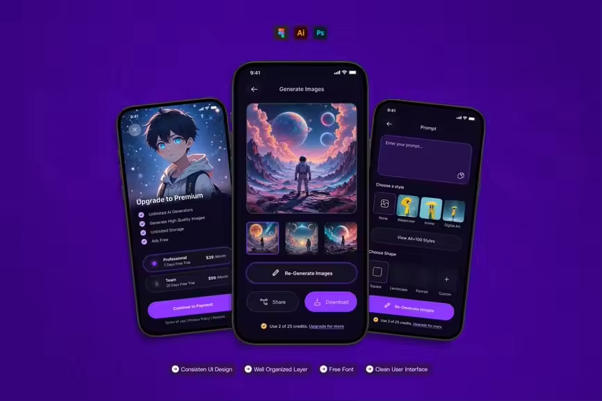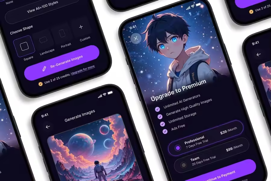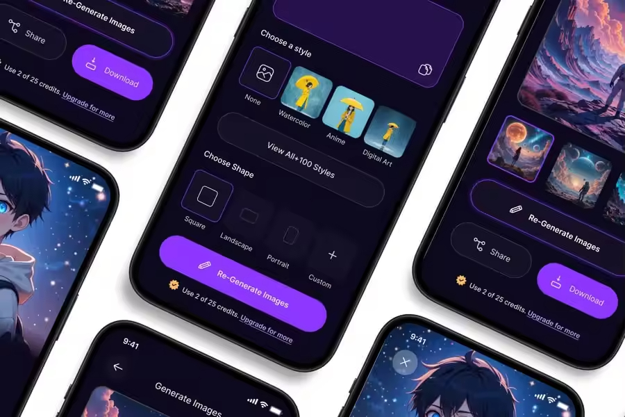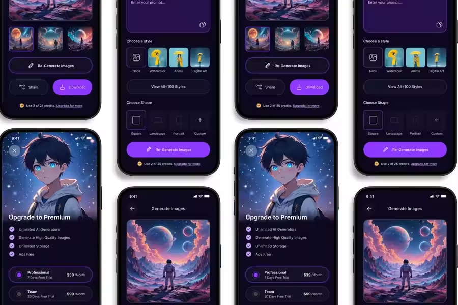 隆重推出图片生成器移动应用 UI 套件,它是一款现代化且功能丰富的解决方案,可用于创建简洁、用户友好的应用界面。对于希望加快设计流程的设计师和开发者来说,这款 UI 套件完美契合,它在一个有序的软件包中提供了所需的所有基本组件。