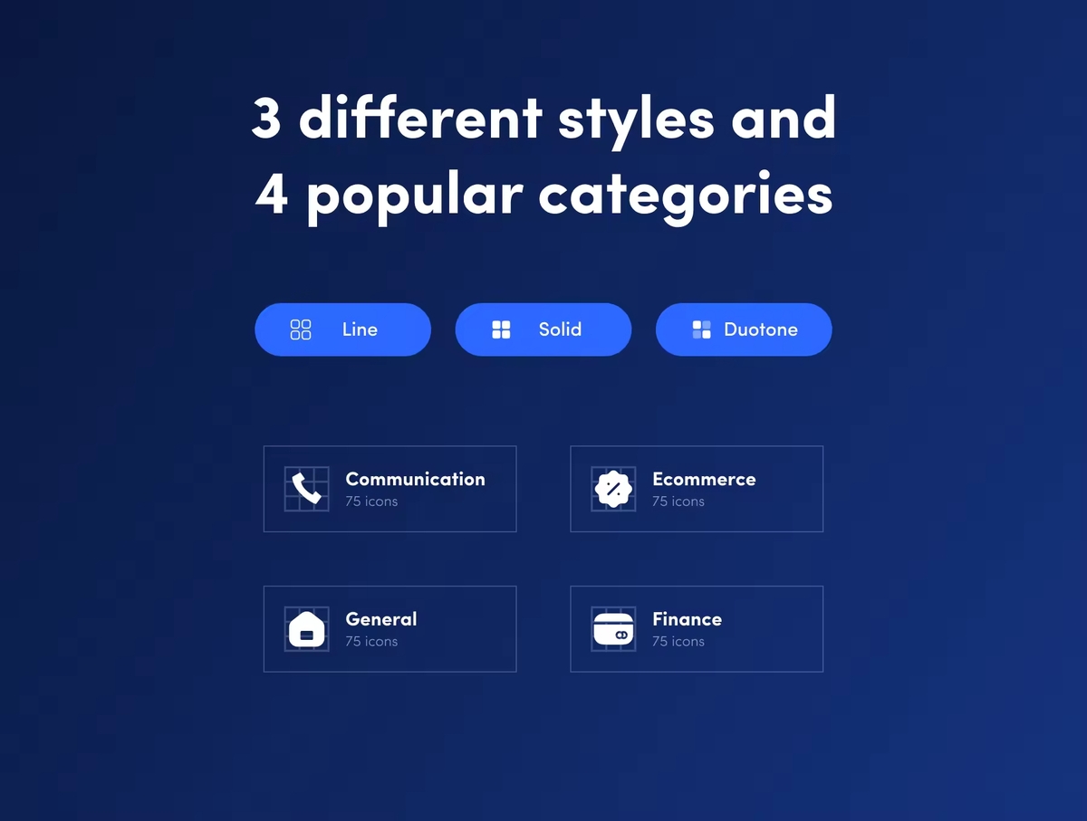 这是一个高级图标,包括 4 个流行类别通信、电子商务、金融和一般,具有 3 种样式(实线、线条、双色调)的像素完美设计。包括在 24 像素网格上创建的 300 个图标。可用的 SVG、PNG 和 Figma 文件,并且易于为您的项目完全自定义。使用这些整洁、干净、现代和出色的设计图标来开发您的界面和演示文稿。