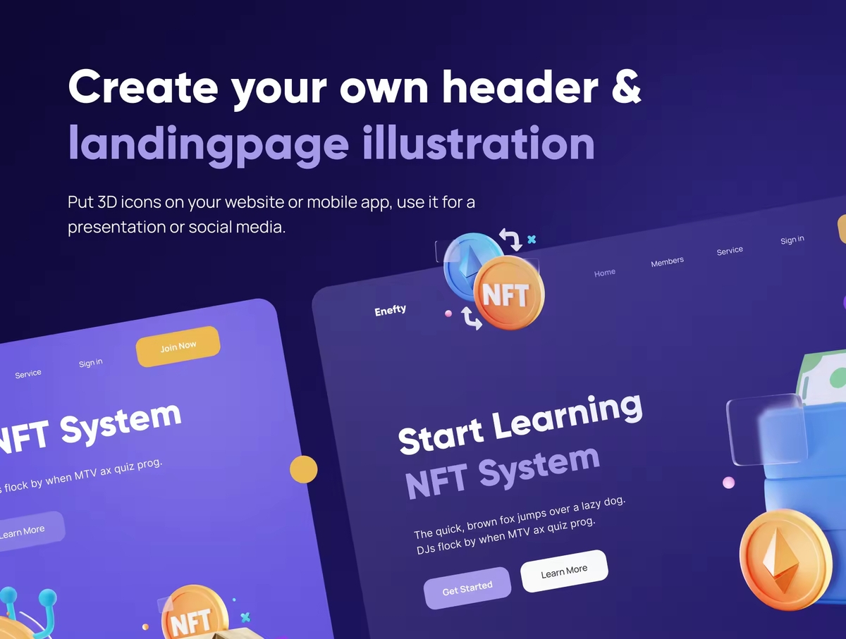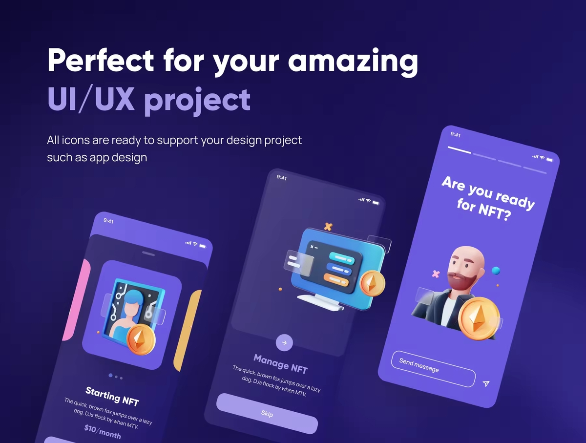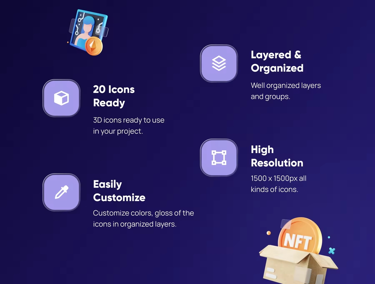 这是一组自定义 3D 图标,适用于任何 NFT 和货币相关行业。使用 3D 图标让您的下一个产品和项目更加惊艳。适用于:NFT、加密货币、区块链、金融科技、投资等。