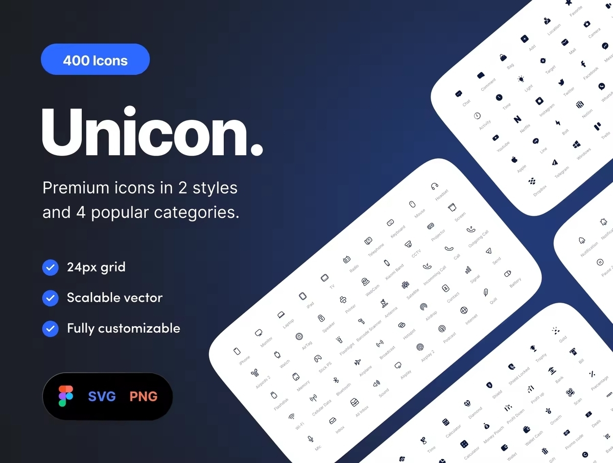 这是一个高级通用图标集,包括 4 个流行类别,金融、界面要素、设备和通信以及社交媒体和品牌,具有 2 种样式(线条和实体)的像素完美设计。包括在 24 像素网格上创建的 400 个图标。可用的 SVG、PNG 和 Figma 文件,易于为您的项目进行完全自定义。使用这些整洁、干净、现代和出色的设计图标开发您的界面和演示文稿。