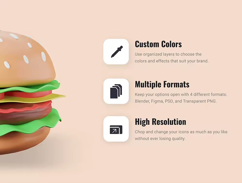 吃货们有福了!无论您是在构建一个很棒的美食应用程序,还是想宣传您的餐厅,独特的图标都会将您的设计提升到一个全新的水平。介绍 3D 食物图标集。除了看起来美味之外,这些 3D 食物图标还可以完全自定义。您可以修改和调整它们,直到它们适合您的项目。
