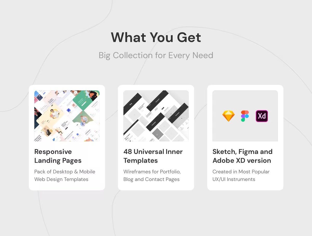 响应式设计着陆页模板,具有最新设计趋势的完美组织和设计。在Sketch,Figma和Adobe XD创建。