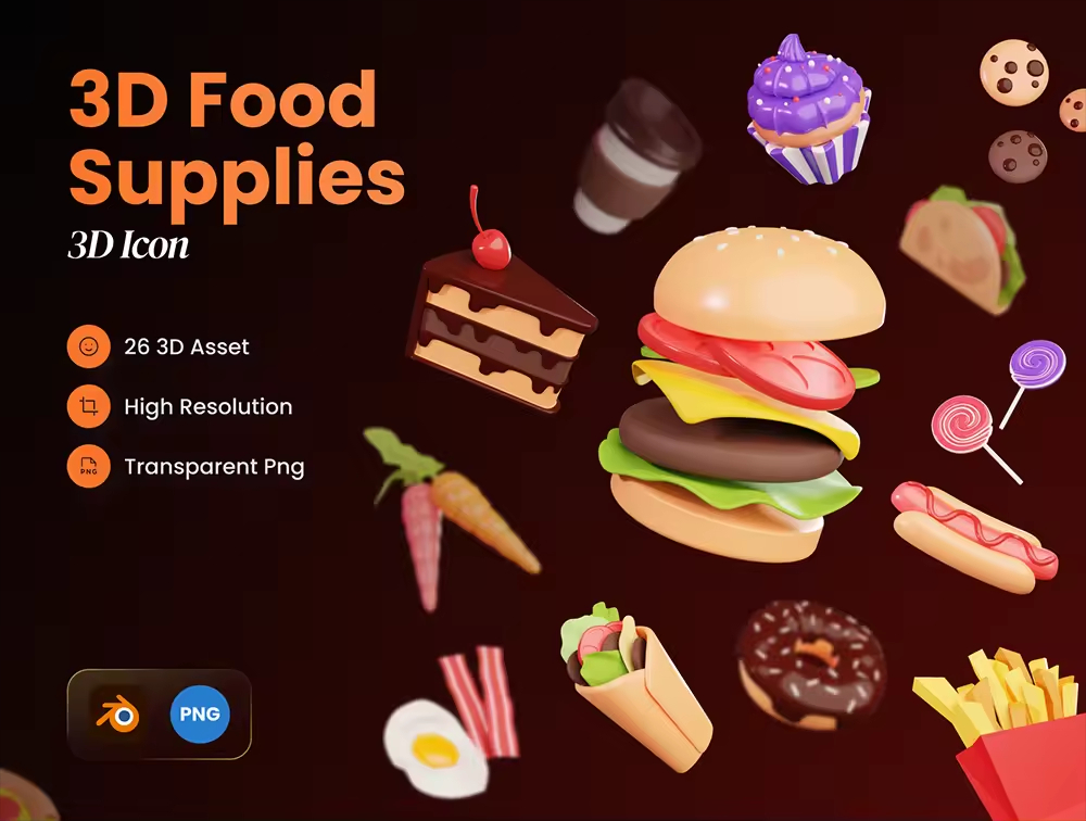 您的项目能否让人胃口大开?通过使用我们的这些食物 3D 图标,您可以将您的项目升级为食欲生成器。可用于任何着陆、应用程序、演示文稿和其他项目。在 Blender 中完全可定制。