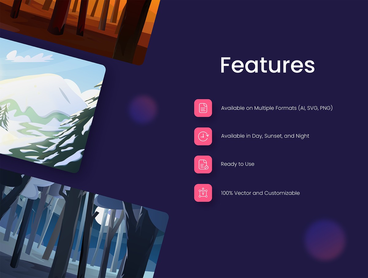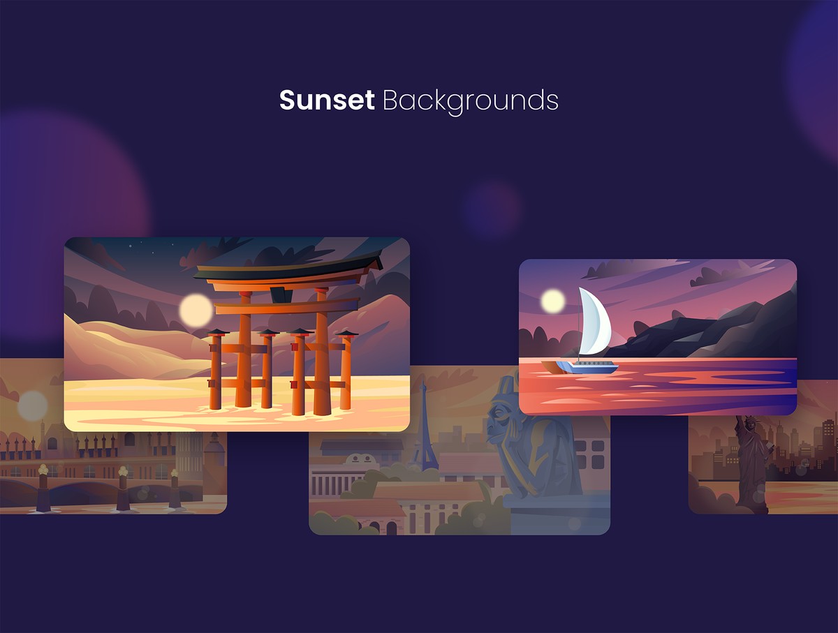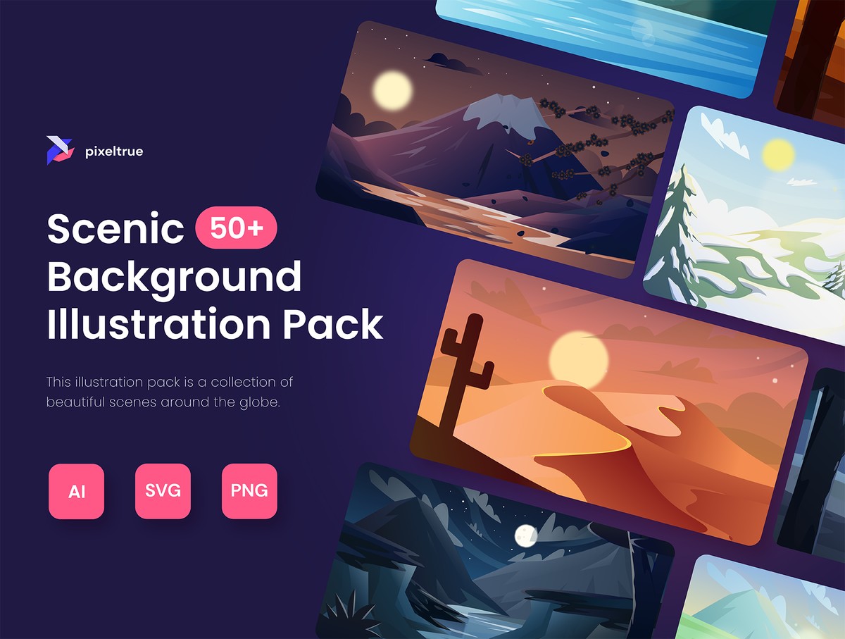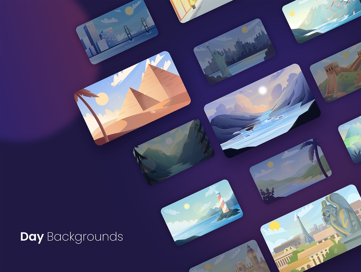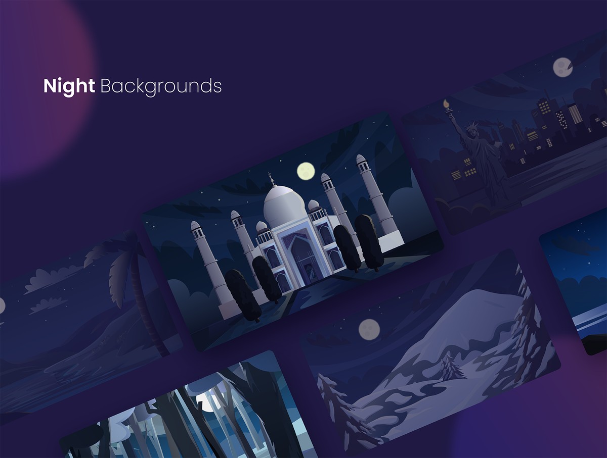 Scenic Background Illustrations是一个包含63个独特插图的包,21个美丽的背景场景,每个场景都有白天、夜晚和日落版本,对于任何项目来说都是令人叹为观止的所有插图都非常易于使用,可以根据您的喜好进行编辑。