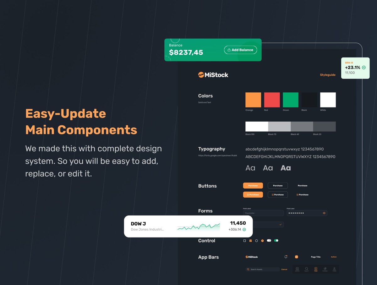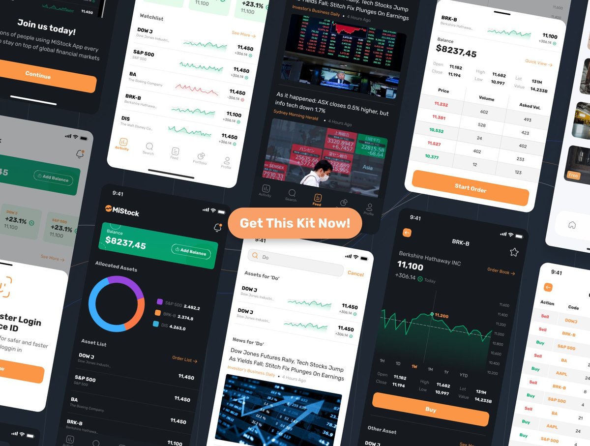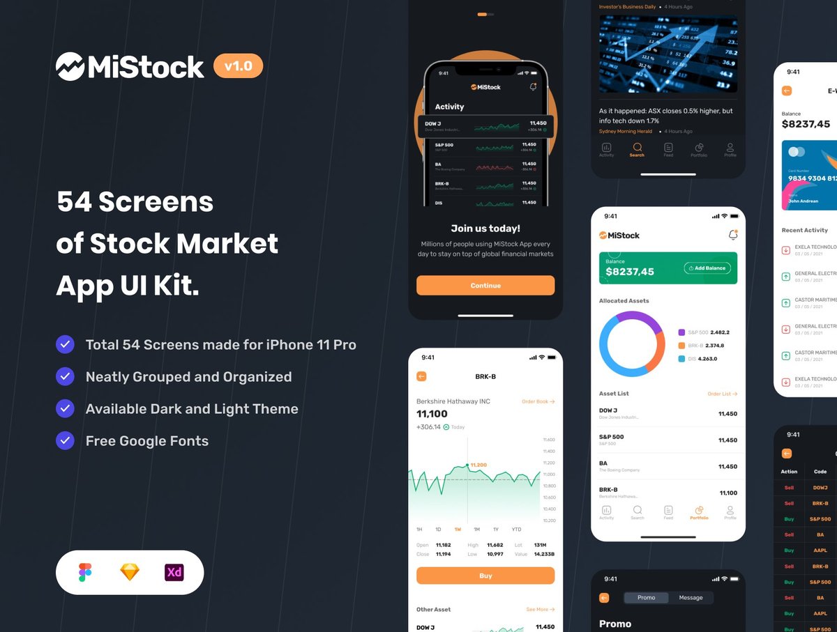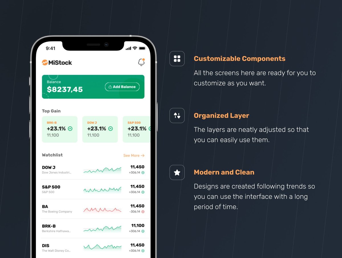 认识一下MiStock,一套完整的股票市场和金融应用程序UI屏幕。易于在Figma、Sketch和Adobe XD中使用。该套装包括一个样式表,27个屏幕的灯光主题。27个屏幕暗主题和可定制组件。使用这个整洁、现代和出色的设计屏幕开发您的应用程序。