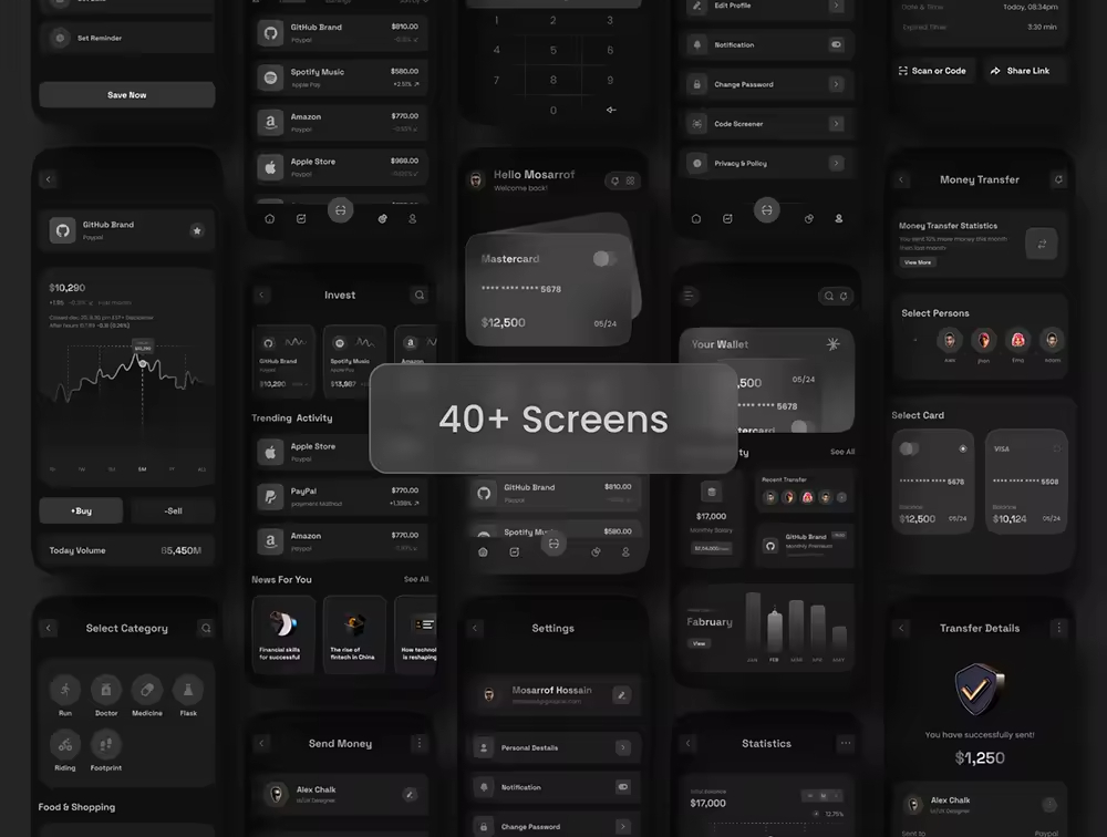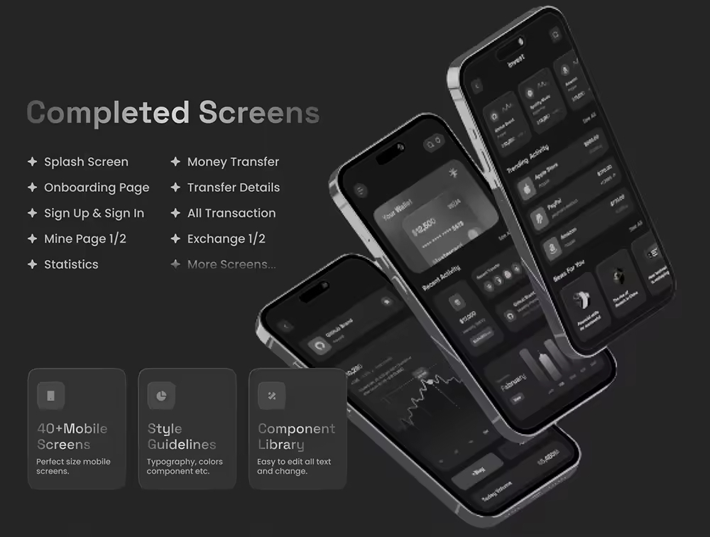 财务移动应用程序 UI 套件是专为 iOS 和 android 设计的高质量包。您可以使用此应用程序模板来交易您的银行、手机银行、钱包移动应用程序、金融交易、跟踪费用、加密钱包或任何金融项目。我们为您的移动应用程序设计了 40 多个精美独特的屏幕。可以提供一套全面的设计组件和功能来构建财务移动应用程序,使开发人员和设计人员可以更轻松地创建专业且用户友好的应用程序来管理个人或企业财务。易于使用,屏幕已准备好用于 iOS 和 Android 应用程序。您可以轻松更改任何设计。它很容易定制,也有很好的文档记录。