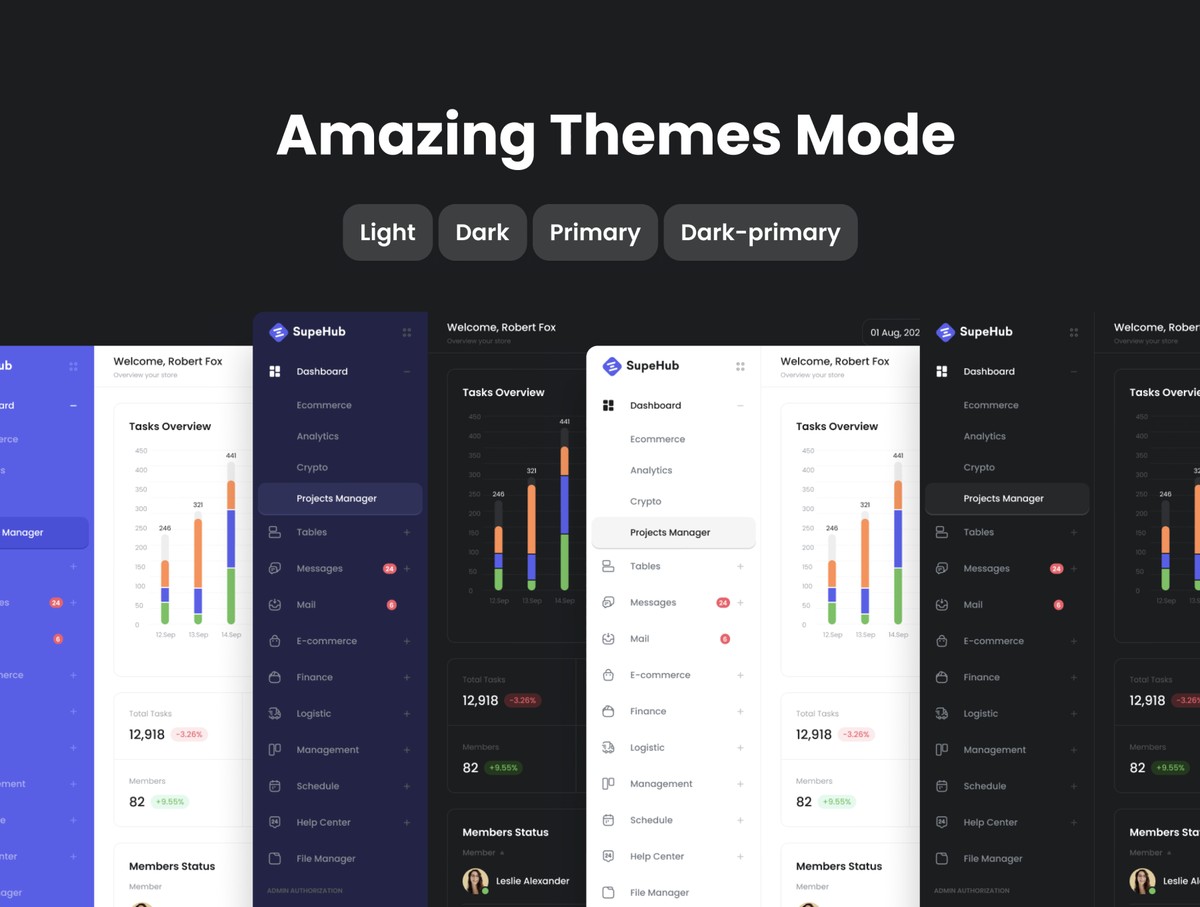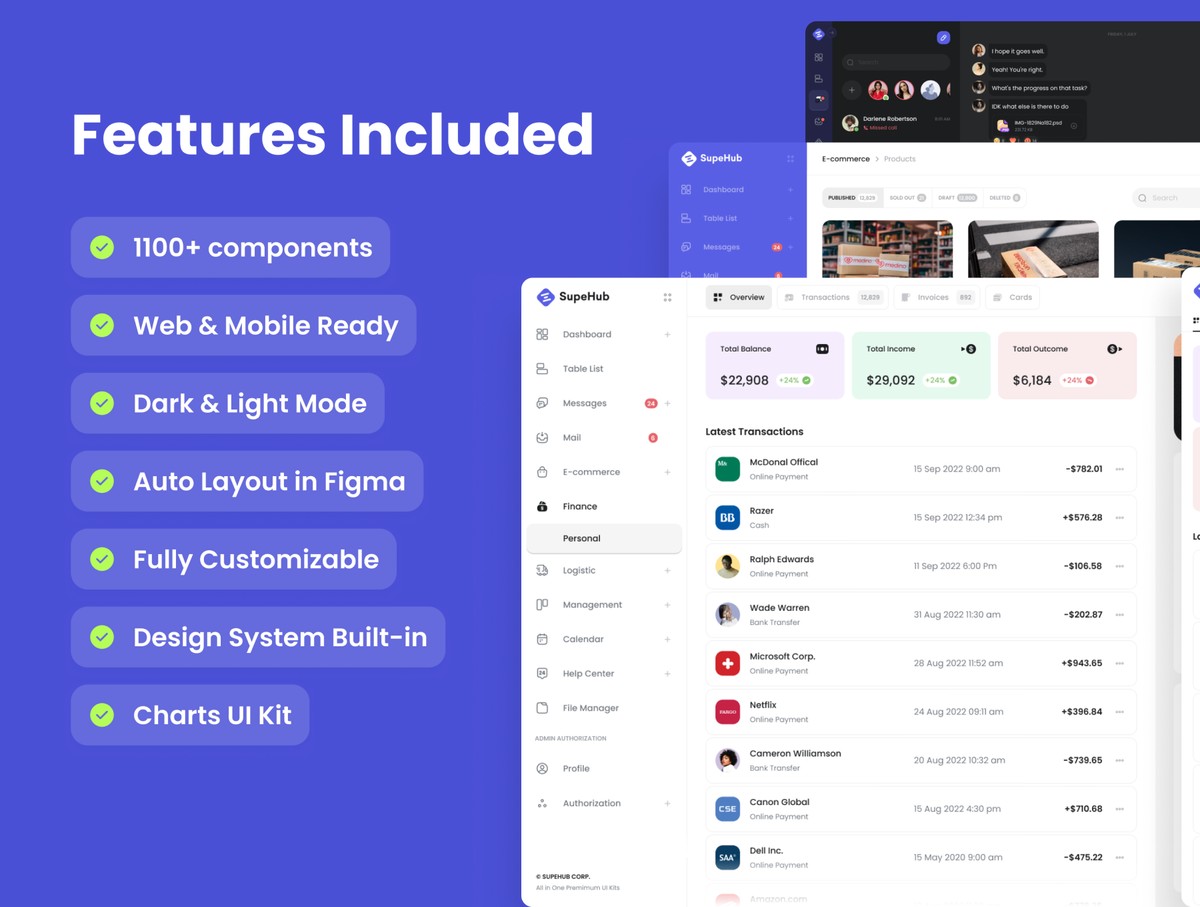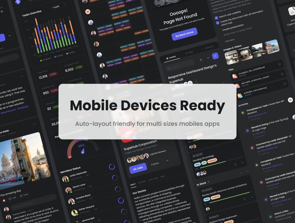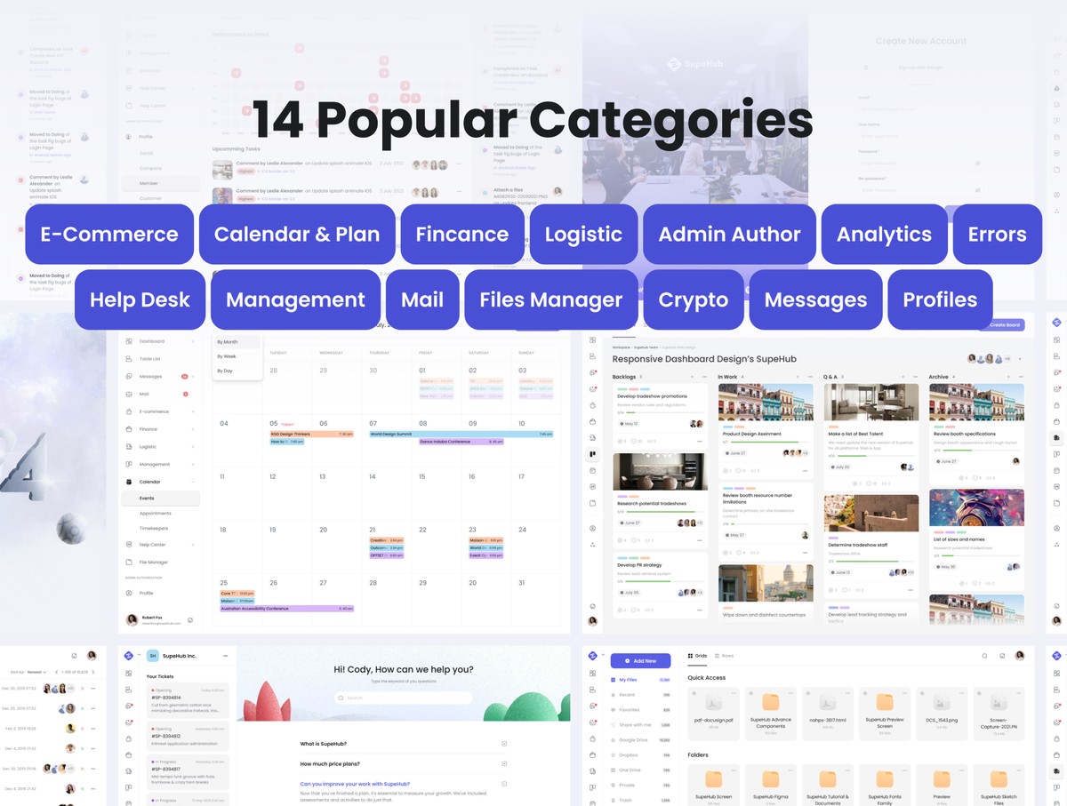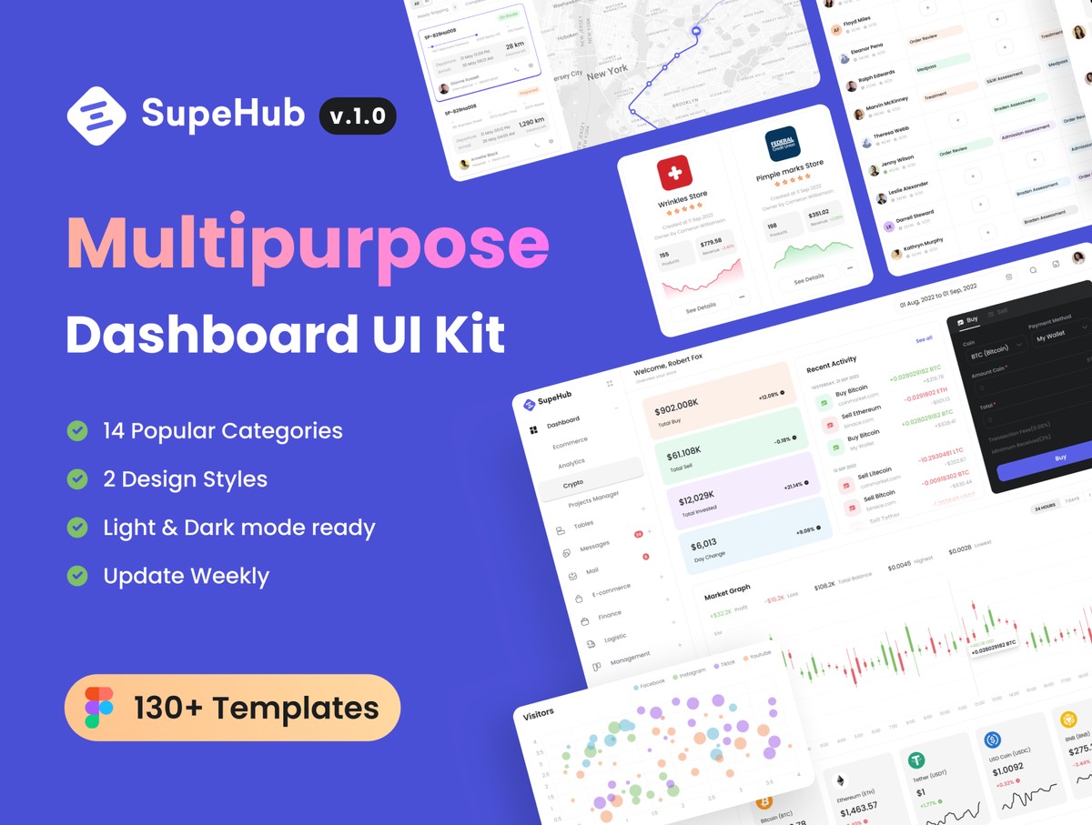 多用途管理仪表板UI套件制作了最新的Figma版本;使用原子设计系统、自动布局和智能组件。它包括4种风格应用:线条光、线条暗、主光、主暗;130多页和1100个组件变体;14热门分类。