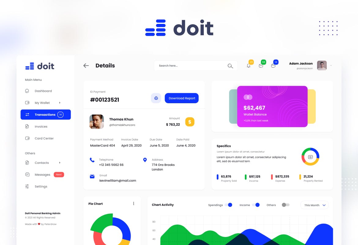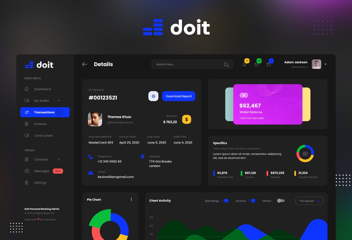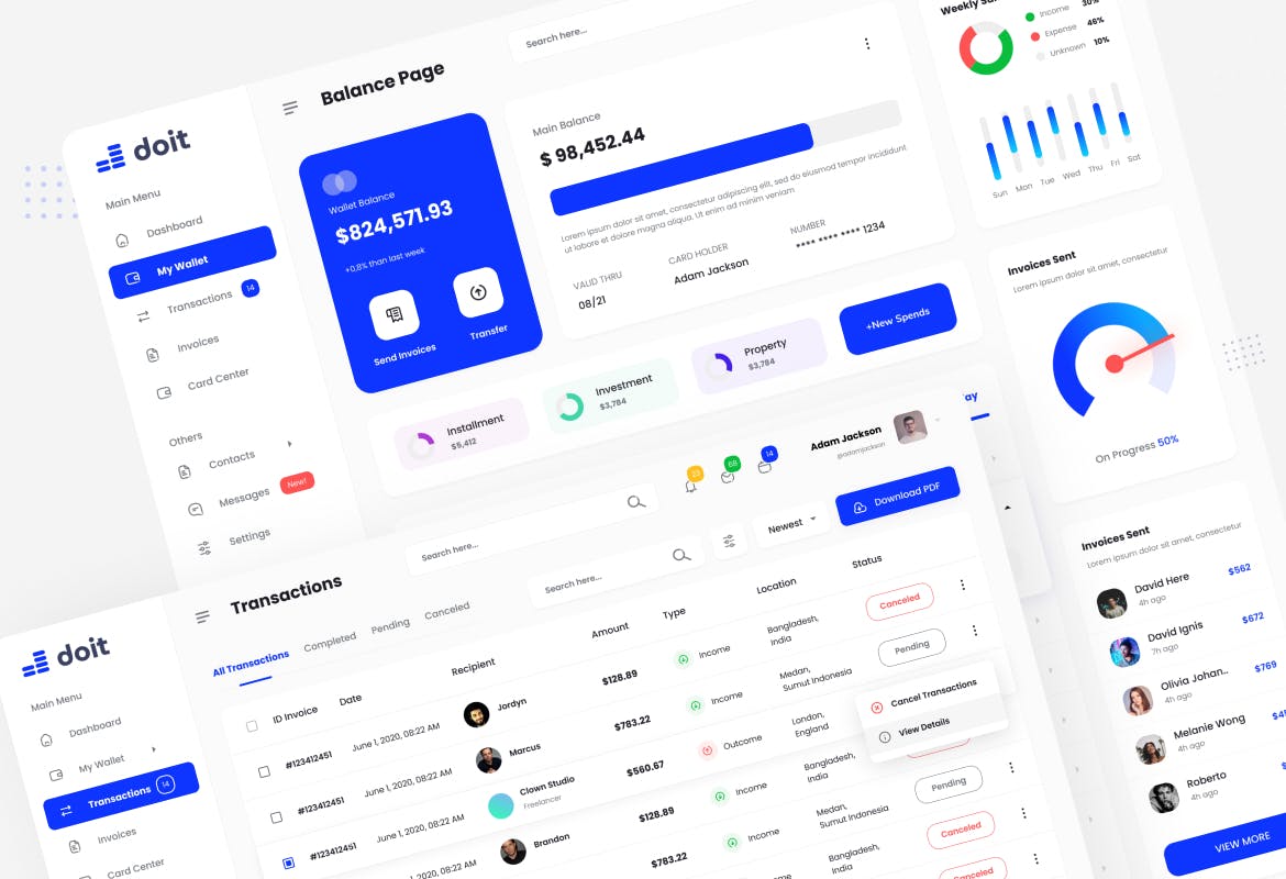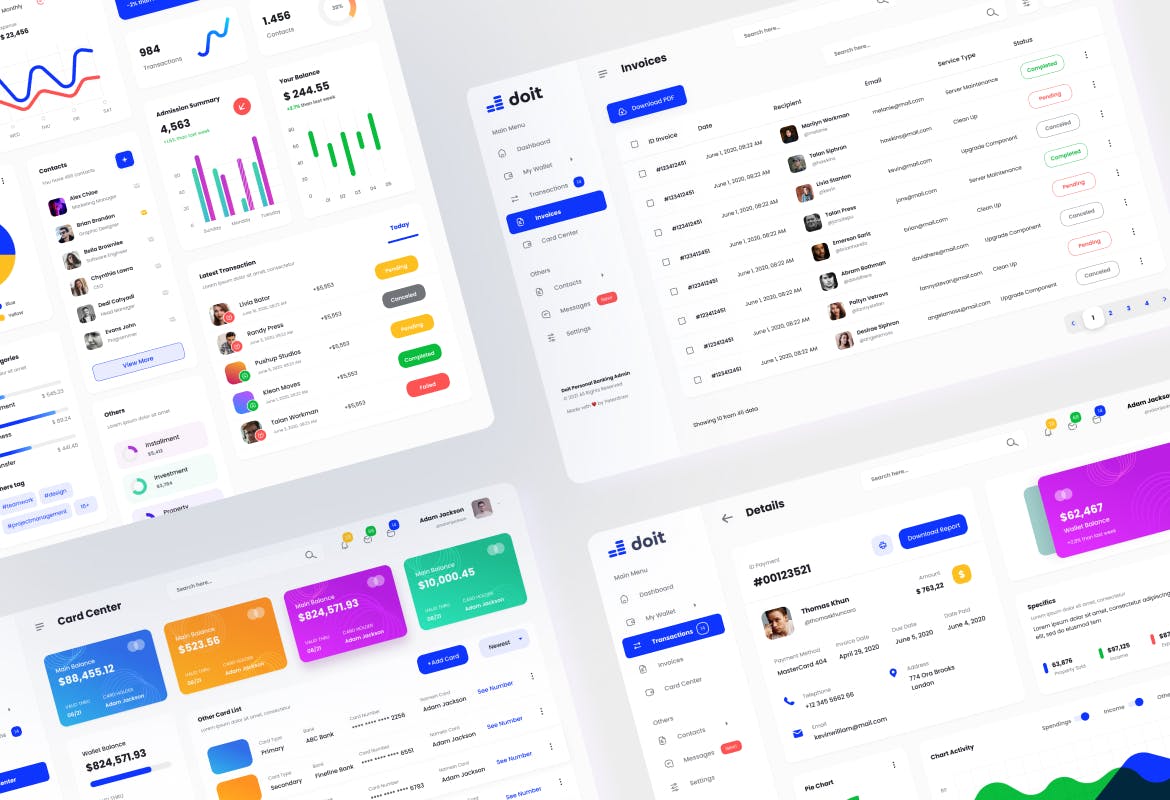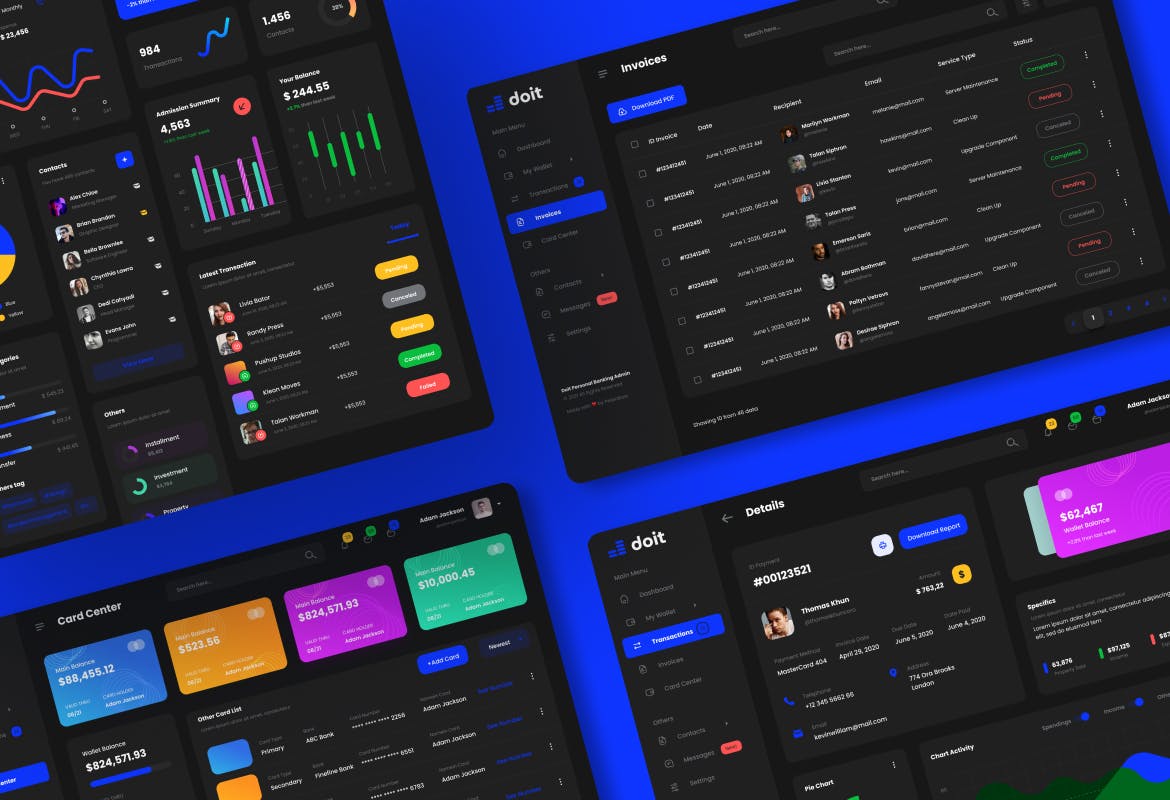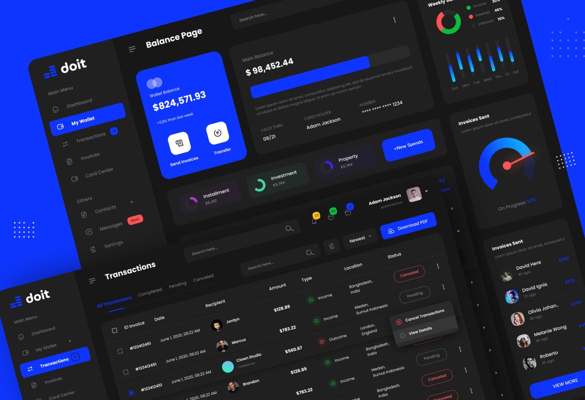 Doit仪表板可在PSD和Figma格式模板,并可在光明和黑暗模式。此个人银行仪表板的每个软件包都包含在PSD和Figma中的用户指南中,因此可以根据您的喜好和需要使用Adobe Photoshop和Figma轻松编辑和自定义。