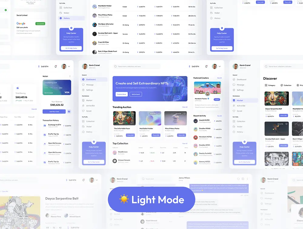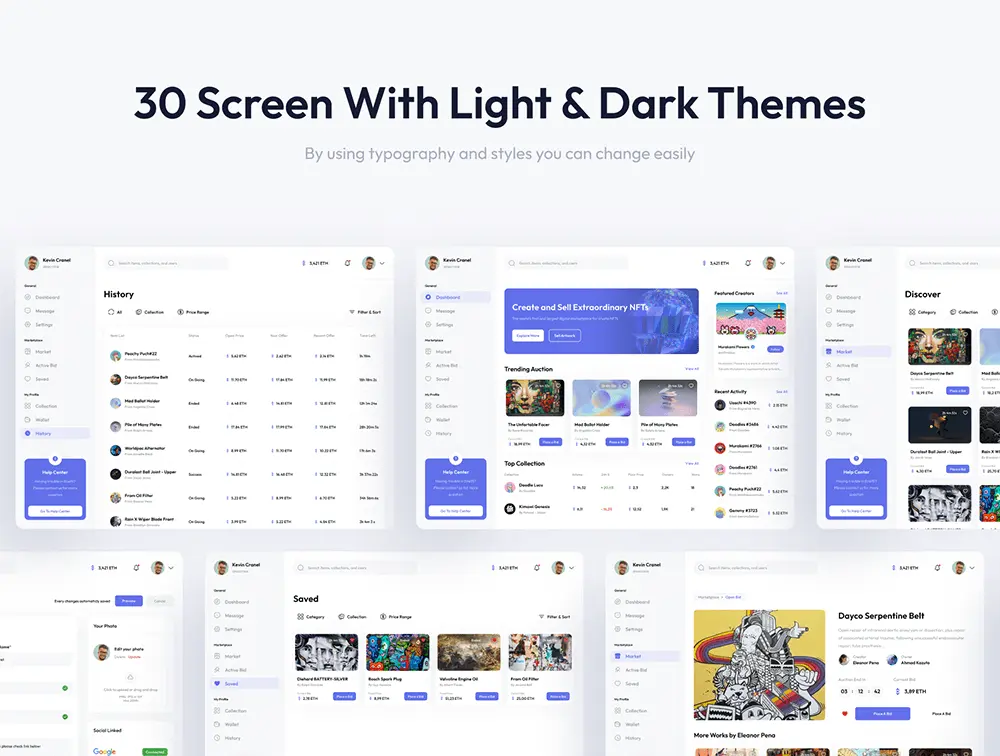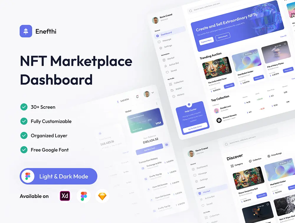 这是一个 NFT 市场仪表板 UI 套件,具有 30+高品质屏幕,易于使用,设计干净、整洁和现代。易于使用,并且可以根据您在任何类型的相关项目中的需求自由定制。为您提供完美像素设计、支持有组织的图层、全局样式指南、具有动态组件的一致设计。