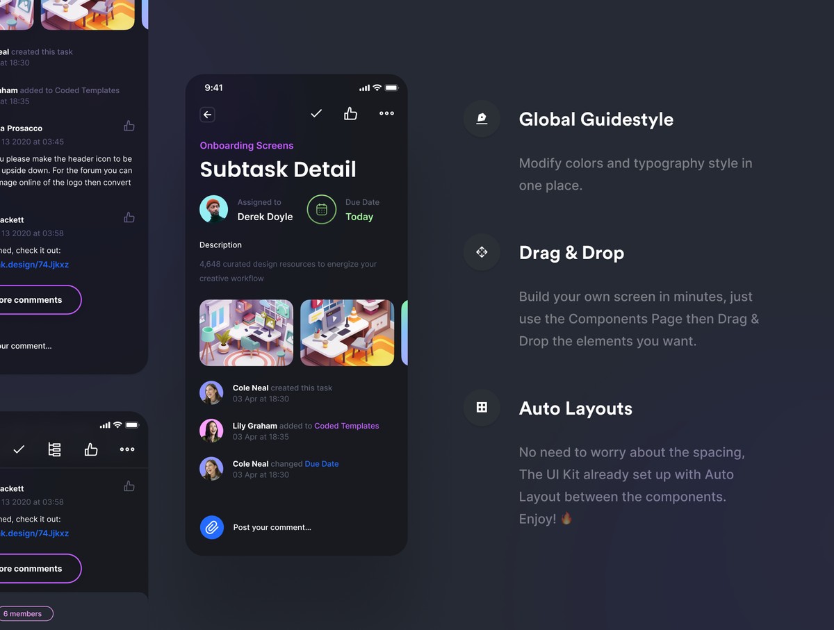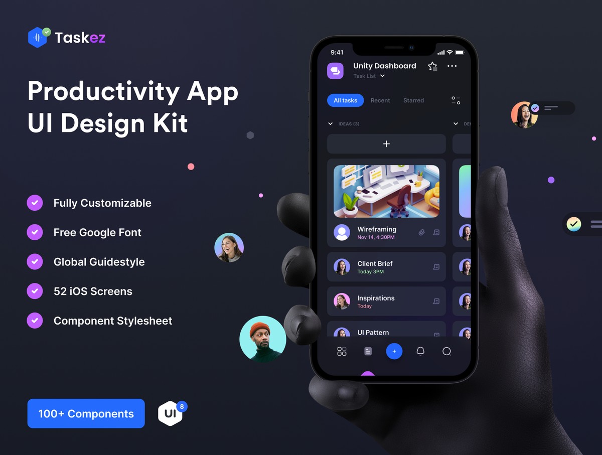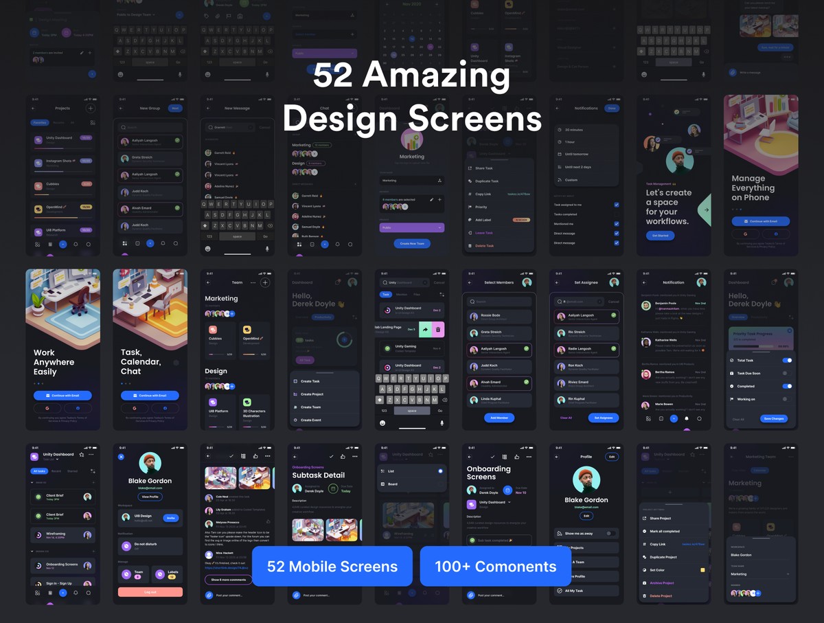 这是一款适用于Figma的生产力应用程序iOS UI套件。该套件包括52个时尚的屏幕和数百个组件,可帮助您更快地交付下一个产品。屏幕类型包括:入职,登录/注册,仪表板,内容创建,聊天,项目,任务和设置。