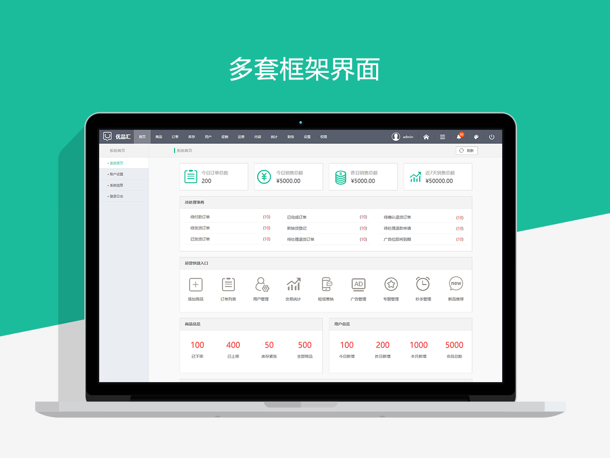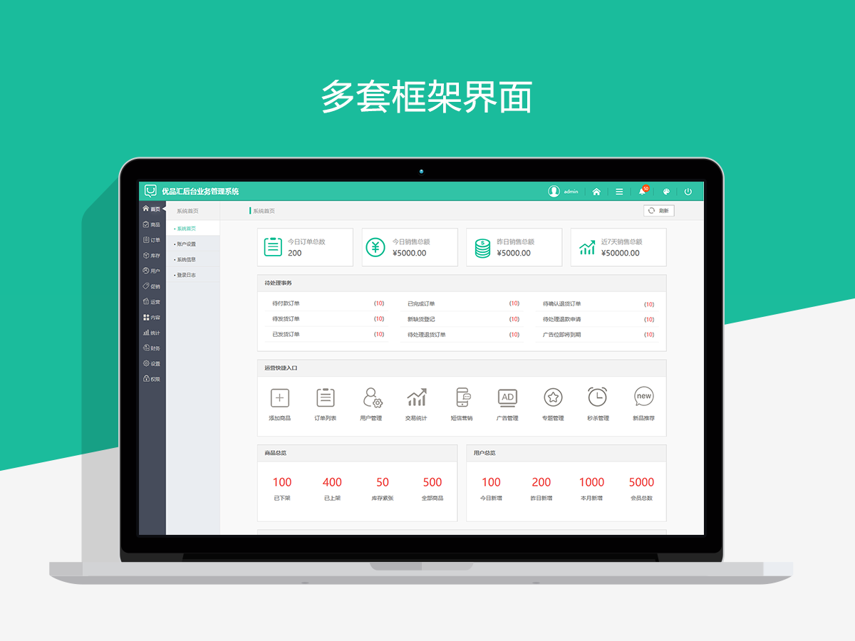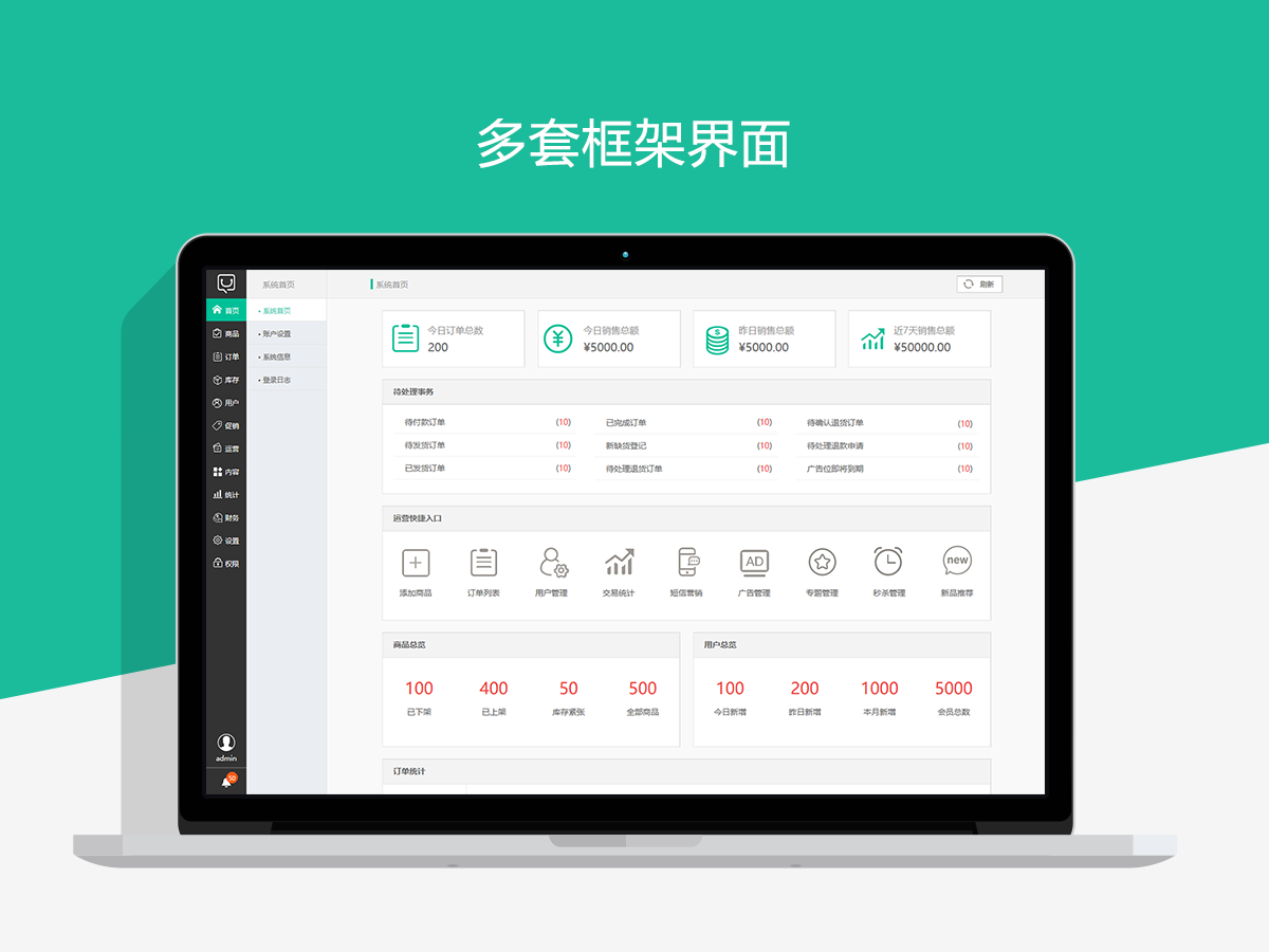 这是一套基于电商产品的后台业务管理系统原型模板,包含了商品、订单、库存、用户、促销、运营、内容、统计、财务、设置、权限等十多个电商后台系统管理模块。模板中提供了多套登录界面和布局框架方案,同时整理出了后台系统中各类常用的交互元素及组件,可以方便快速的复用到任何中大型系统项目原型方案中。模板框架采用了自适应布局处理,可以在各种屏幕分辨率下达到最佳的兼容性和浏览效果,同时所有功能模块二级界面都是单独设计并使用内联框架嵌入,可极大的提升输出效率及节约维护成本。无论你是一位电商行业产品经理还是刚开始学习后台系统的设计,这都是一套可以帮助你快速提升后台策划能力和设计效率的原型模板。