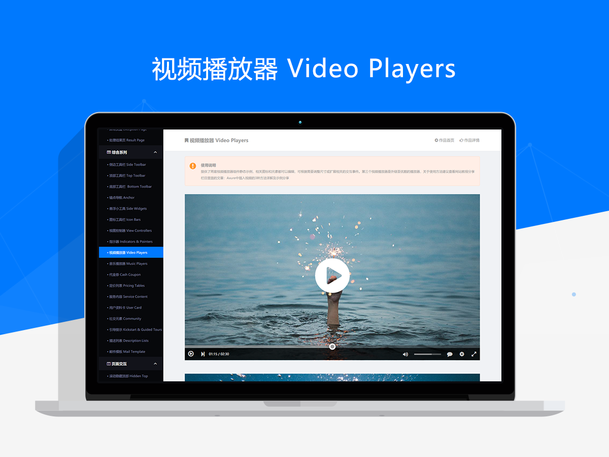为了适应更广泛的使用需求,作品中大多数的元件类型都分别提供了静态和动态的版本,在使用时可以根据协作需要选择使用对应的版本。另外,每种动态组件都提供了相应的使用示例,为了提升了动态交互组件的可用性,一些全局性的组件尽量使用母版进行了封装,只需复制粘贴即可快速应用到你的原型方案中。而对于Axure中比较难实现的动态交互组件,作品中同时提供了完整的静态示例,在使用时可以用专门的示例页面呈现出来,并配合相关的交互说明,供UI和前端人员进行参考。