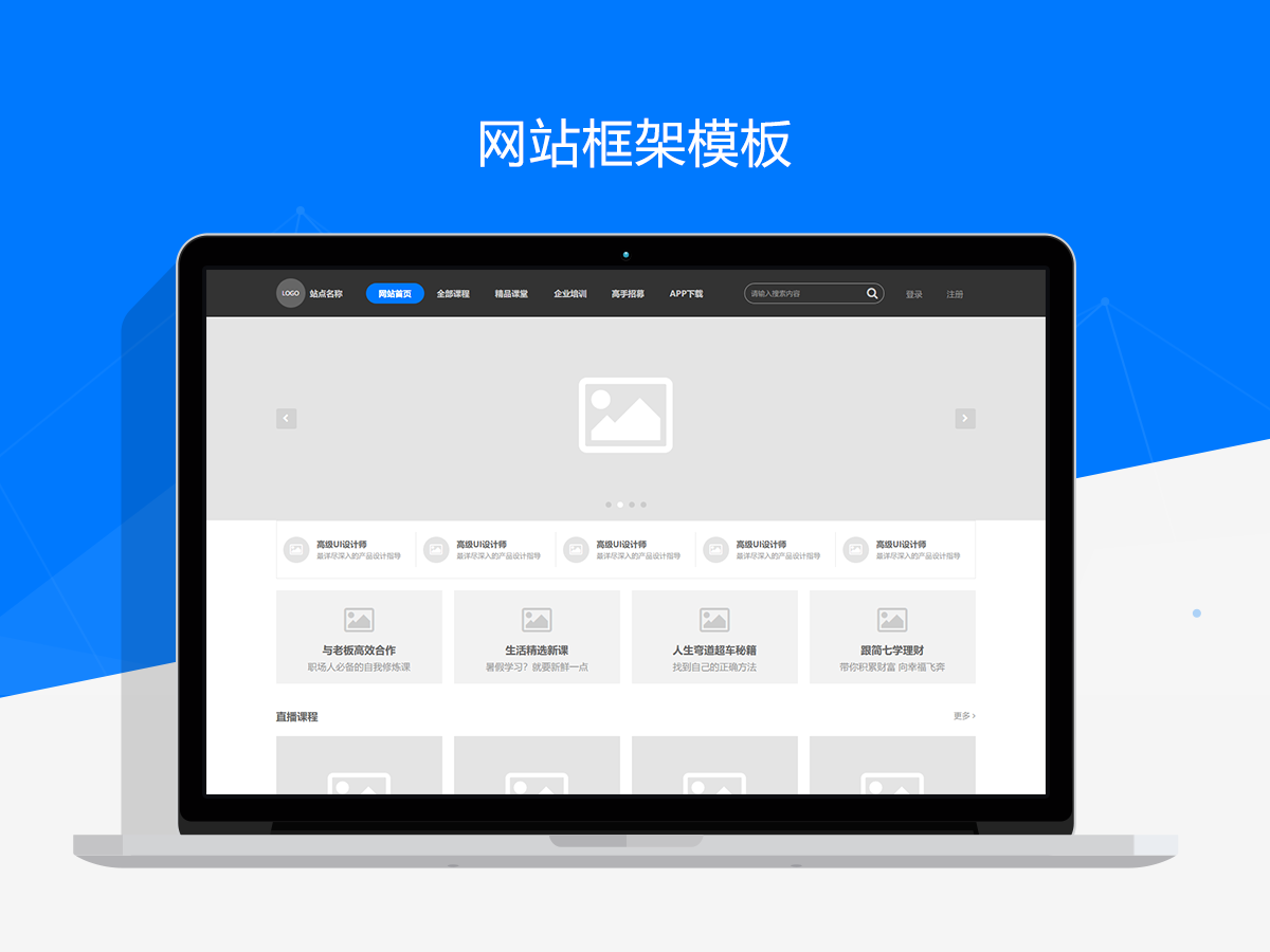 这套作品中还提供了多套主流的网站布局框架模板,这些模板是AxureUX元件库的设计方法和相关规范的应用,可以作为学习原型设计的极佳参考案例。同时,基于这些模板也可帮你快速创建原型方案,极大的提升原型设计效率。每套模板中包含了首页、分类页、内容详情、用户中心、注册登录、找回密码等常用页面,所有页面结构清晰合理,充分的应用了母版进行模块化布局,非常便于快速复用和修改。配合元件中提供的丰富的元件类型或业务组件,可以让你快速设计出美观规范和易读性强的WEB交互原型,能把更多精力放在功能流程和业务逻辑上。注意,相关模板主要提供框架和布局参考,每套模板的页面完成程度有所不同。