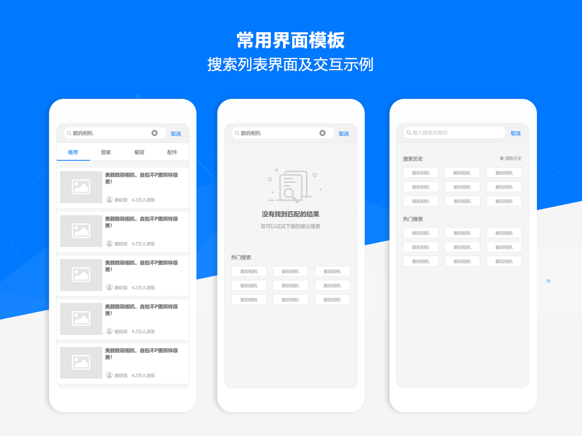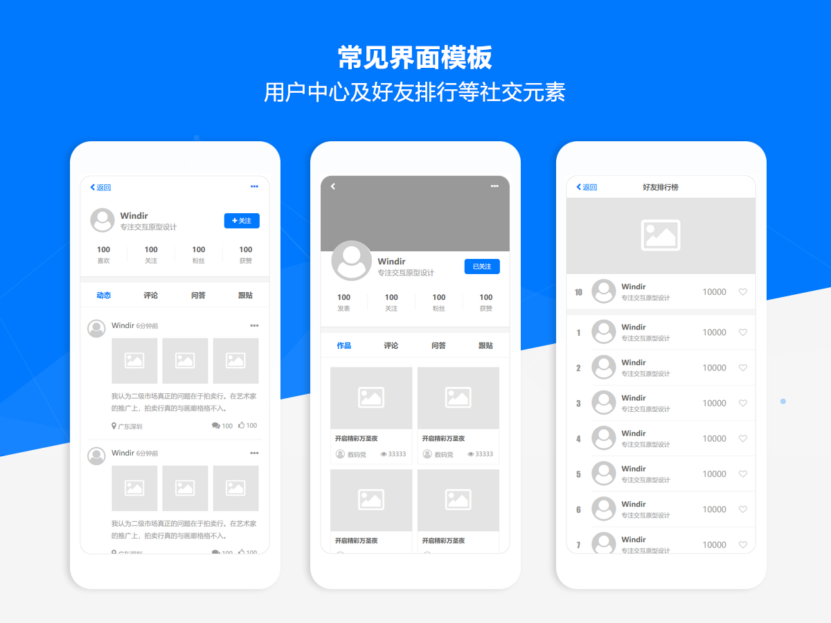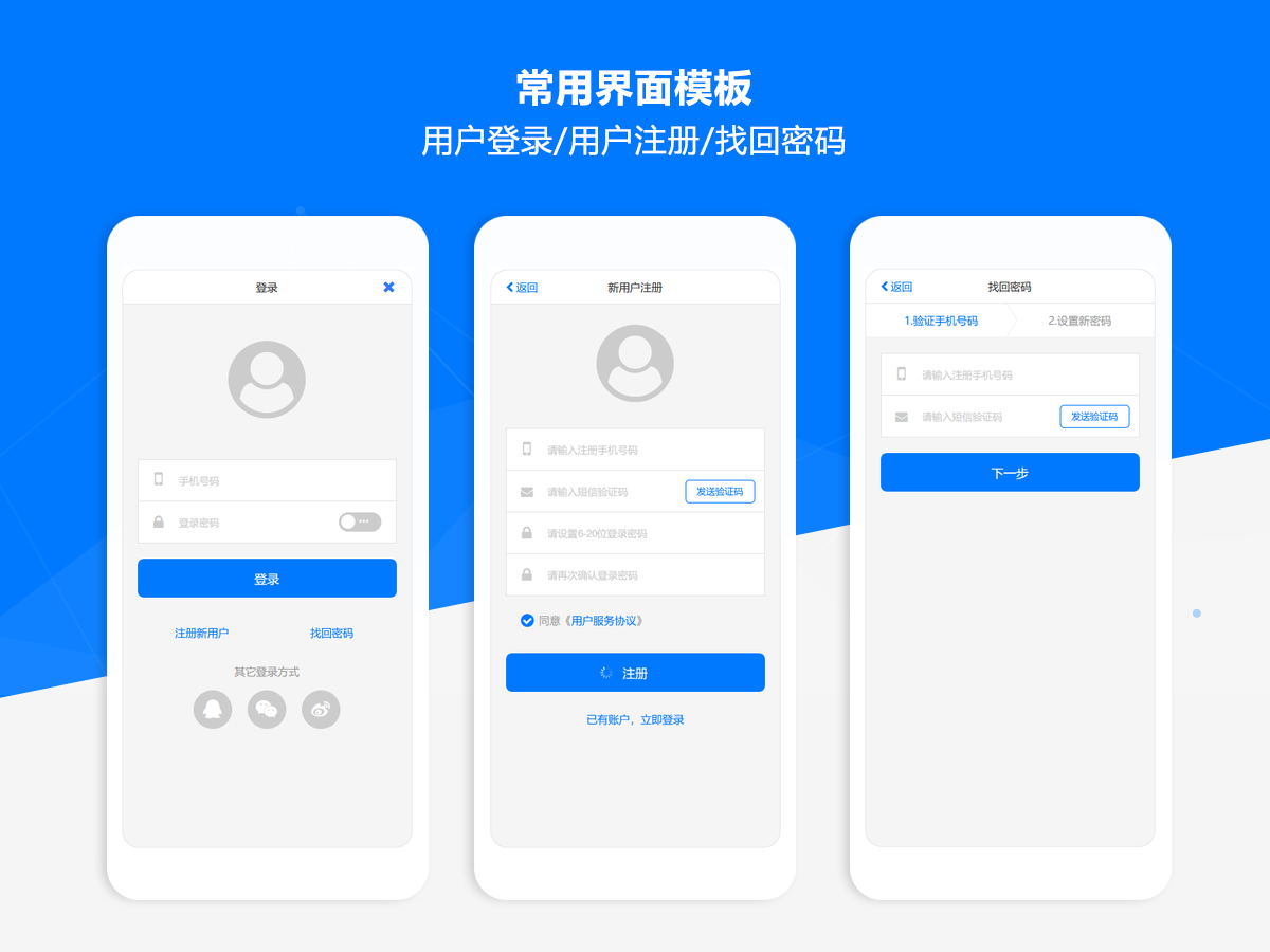 除了提供丰富的元件类型之外,作品中还提供了各类常用的移动端交互界面模板,基本覆盖了各种主流APP的常见界面。这些界面模板不仅可以帮助你提升原型设计效率,还可以作为学习手机移动端交互原型设计的极佳参考案例。其中包含的首页、分类页、消息列表、用户中心、注册登录、找回密码等常用页面,可以方便快速的应用到你的原型方案中。另外配合作品中提供的丰富的元件类型或业务组件,可以让你快速设计出美观规范和易读性强的手机移动端交互原型,能把更多精力放在功能流程和业务逻辑上。