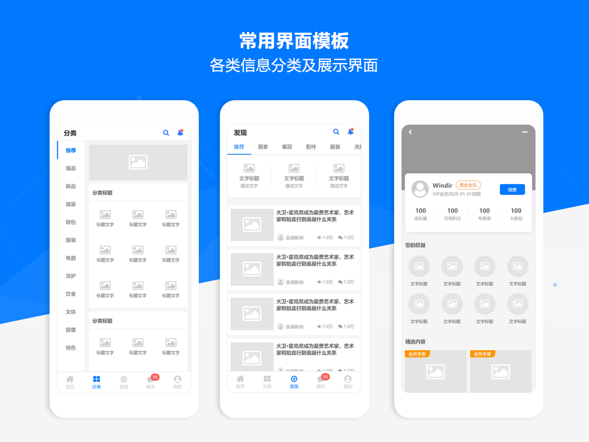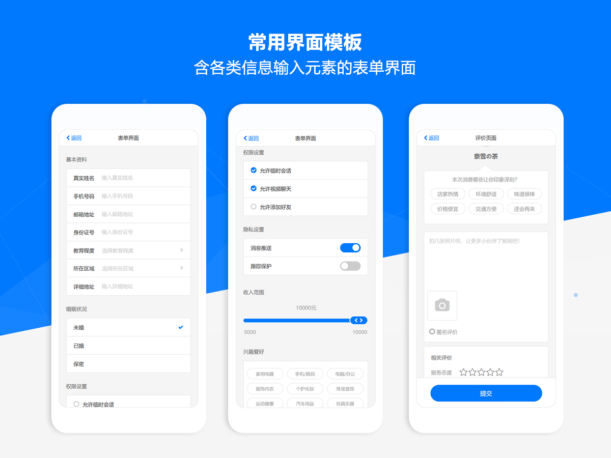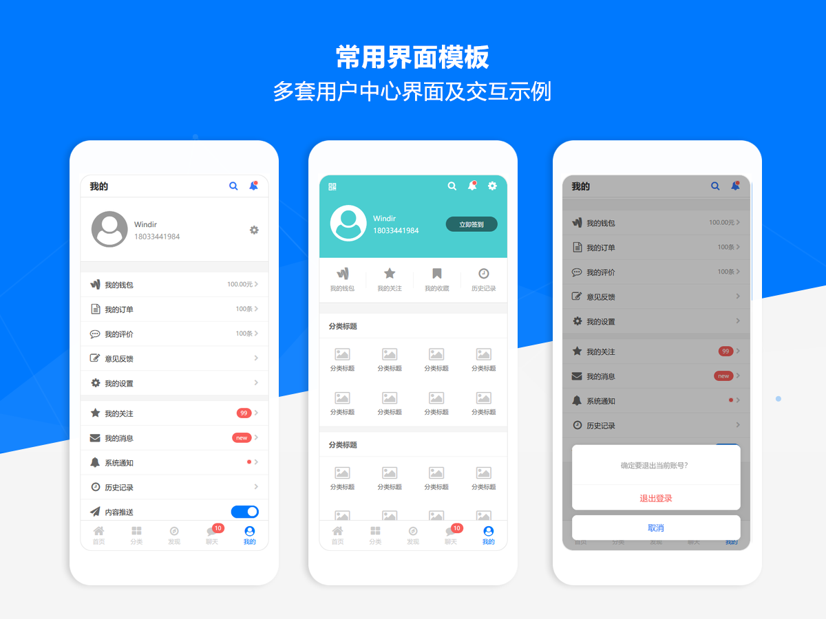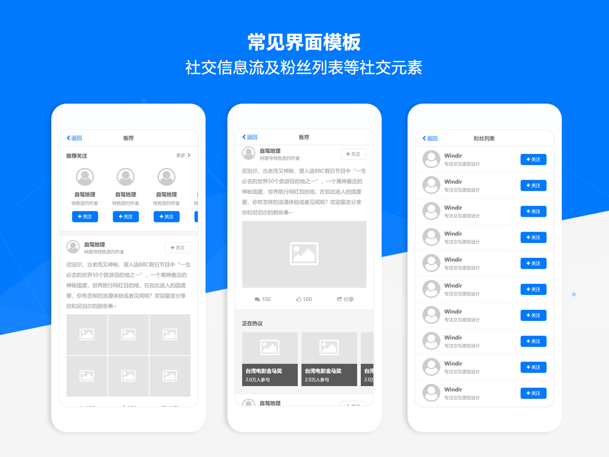 除了提供丰富的元件类型之外,作品中还提供了各类常用的移动端交互界面模板,基本覆盖了各种主流APP的常见界面。这些界面模板不仅可以帮助你提升原型设计效率,还可以作为学习手机移动端交互原型设计的极佳参考案例。其中包含的首页、分类页、消息列表、用户中心、注册登录、找回密码等常用页面,可以方便快速的应用到你的原型方案中。另外配合作品中提供的丰富的元件类型或业务组件,可以让你快速设计出美观规范和易读性强的手机移动端交互原型,能把更多精力放在功能流程和业务逻辑上。