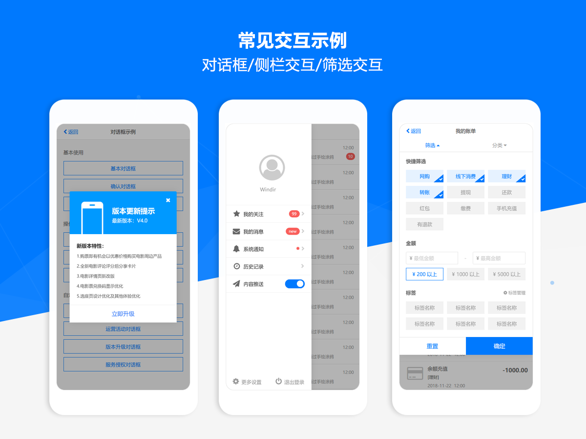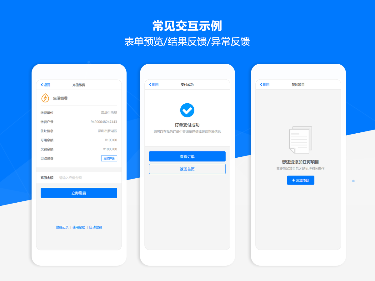 作品中共包含了常用组件、信息输出、信息输入、信息反馈、综合系列等5种元件分类,相比于旧版本包含了更加丰富的元件类型和业务组件,还特别整合了微信小程序和支付宝小程序相关的元件类型和界面模板。另外,新版应用了全新的设计风格和配色方案,整体使用较为安全的蓝色作为主色调,同时简化了相关元素的配色,调整起来也会更加方便。为了适应更广泛的使用需求,大多数的元件类型都分别提供了静态和动态的版本,在使用时可以根据协作需要选择使用对应的版本。