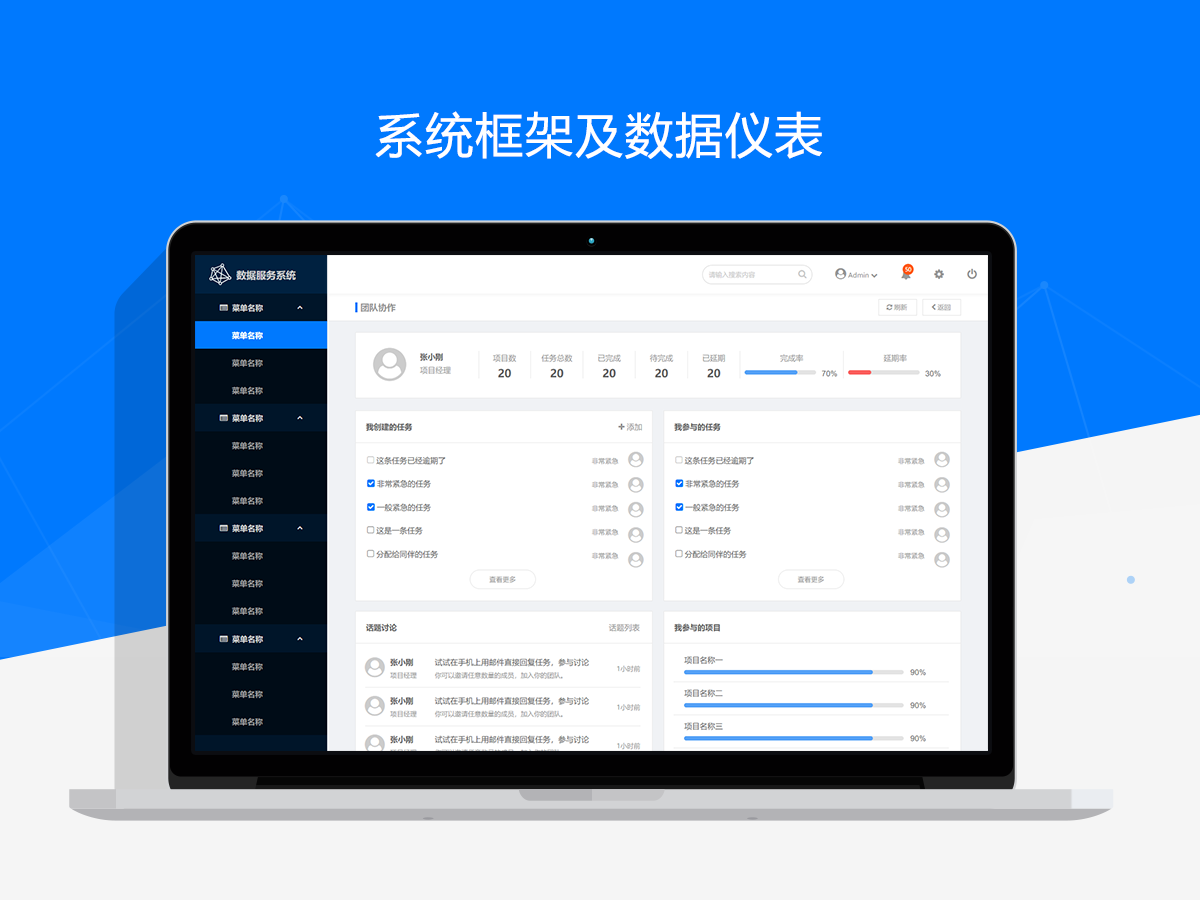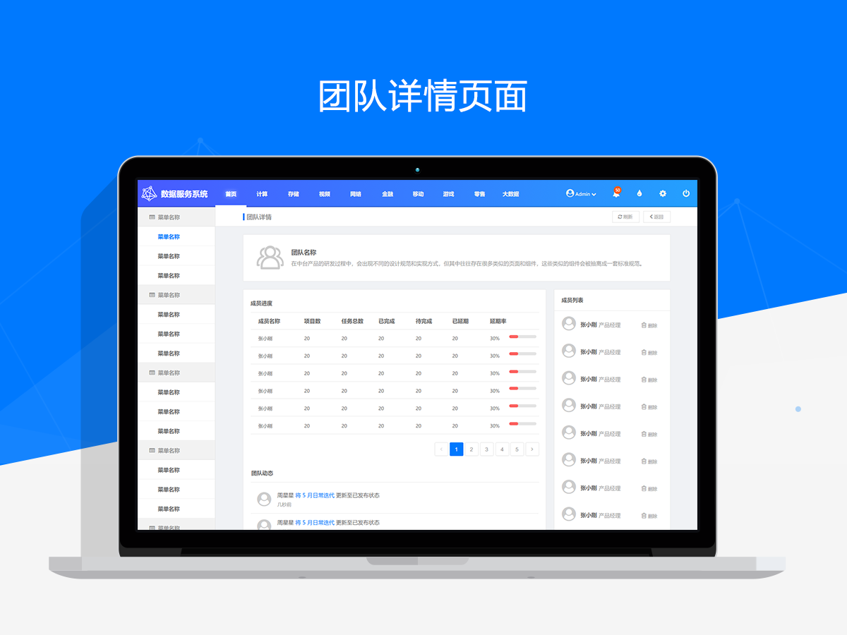 除了提供不同类型的登录界面和系统框架之外,本套作品中还提供了丰富的常用页面模板,涵盖了各类典型的中后台系统使用场景。其中包含了各类中后台数据仪表和首页示例、数据管理的增删改查相关页面、团队协作功能流程相关页面,以及各类信息展示和提示反馈类页面。由于这套设计方案的所有内页都是通过框架页面进行链接的,所以相关的页面模板基本都是独立的,可以非常方便进行复用。在实际使用过程中,可以根据需要组合对应的框架和页面模板。
