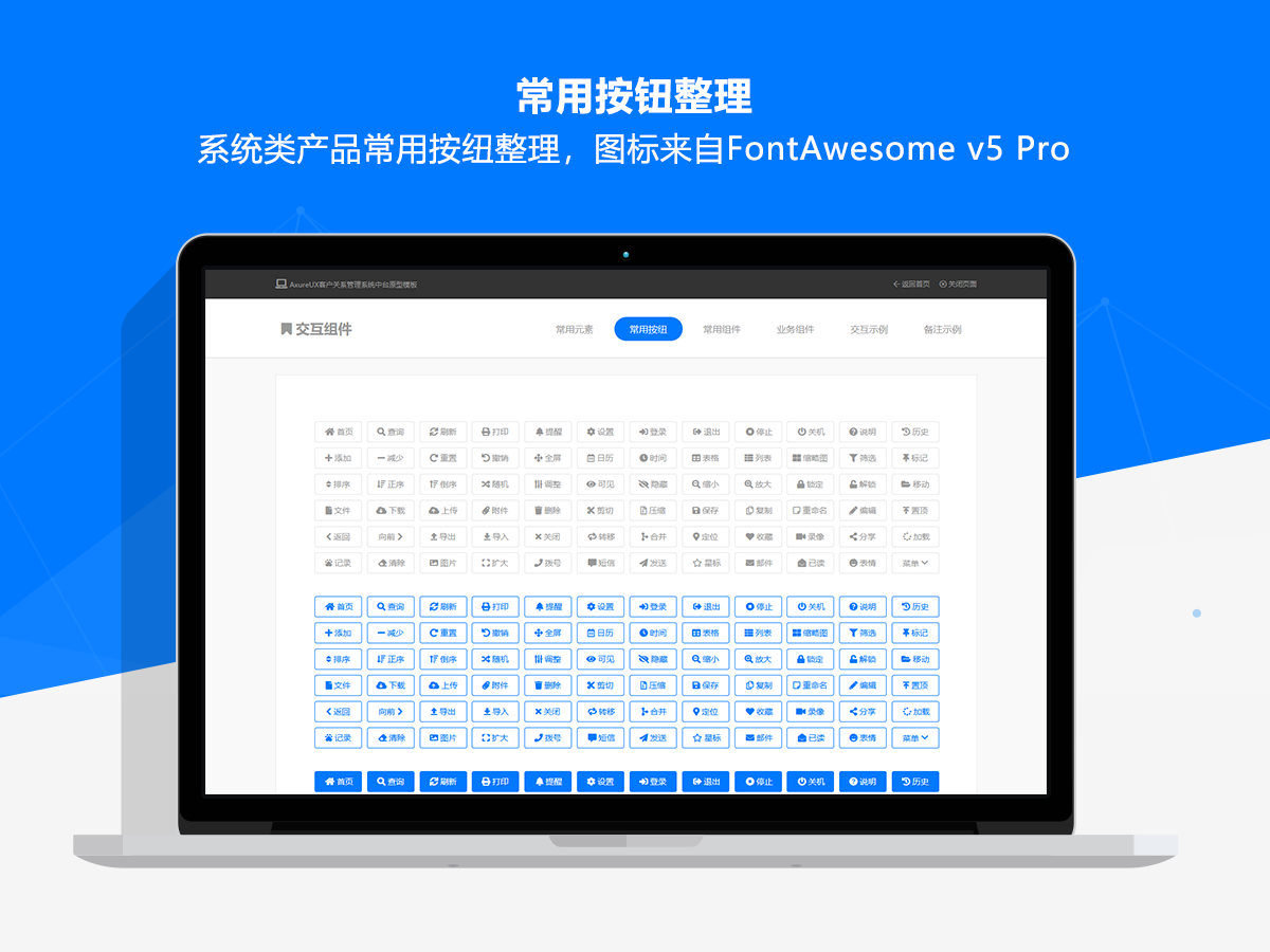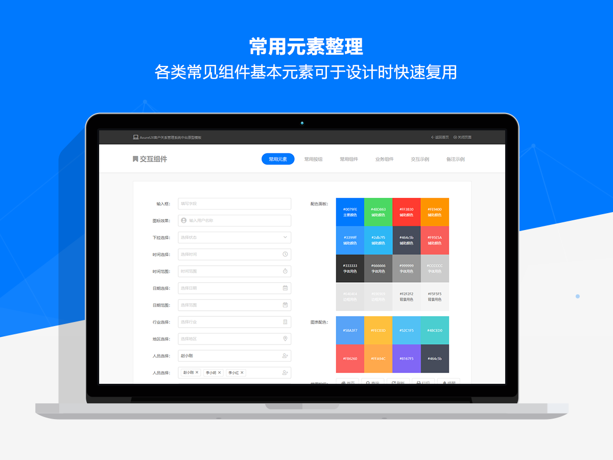 为了提升输出效率和方便维护,本套作品中相关基础的交互元件全部使用的是静态元件,例如:输入框架、下拉选择器、下拉按纽、开关选择器、日历组件、通知提醒、表单验证反馈等。作品中有通过组件示例页面将相关的交互样式呈现出来,列出了相关的状态示例和交互说明,可以供UI和前端人员进行参考。如果您在设计中需要使用相关的动态交互元件或更多的元件类型,可以配合《AxureUX Web前后端交互原型通用元件库》一起使用。这套元件库中包含各类丰富的Web元件及业务组件,各类基础交互元件同时提供了动态版本和静态示例。