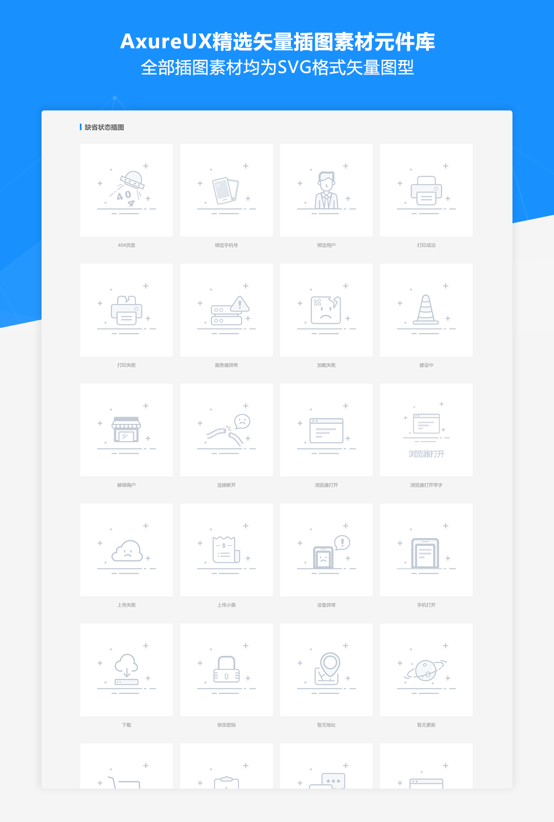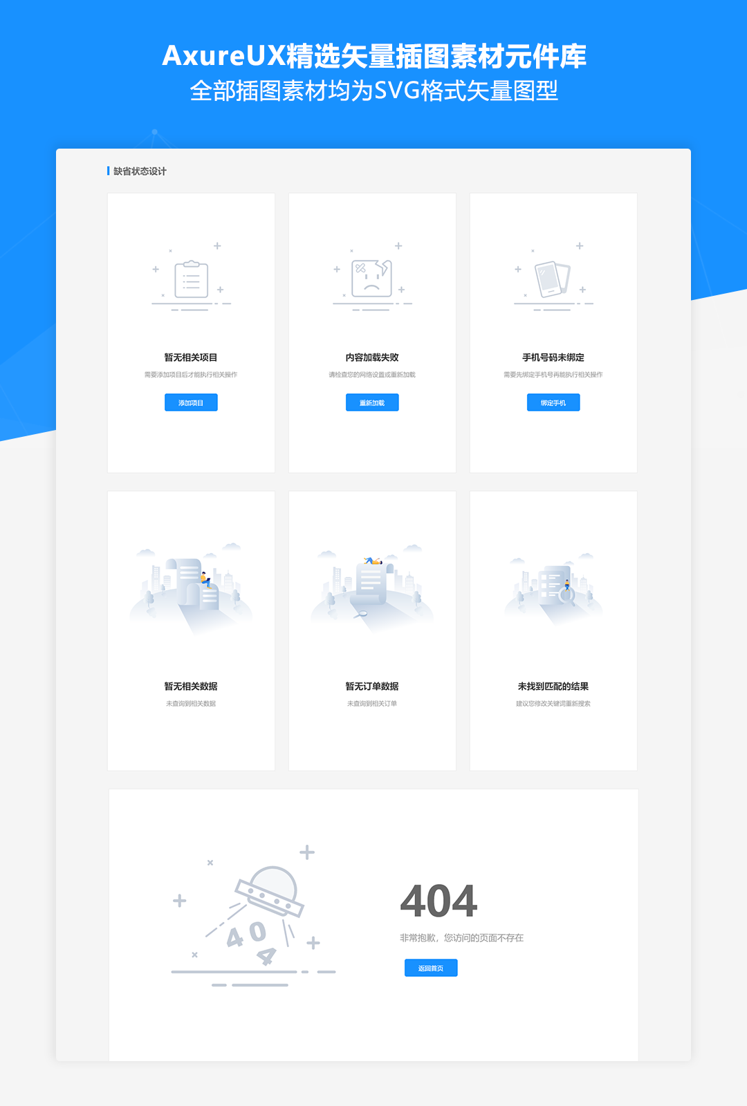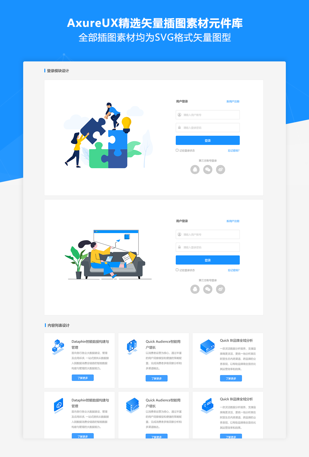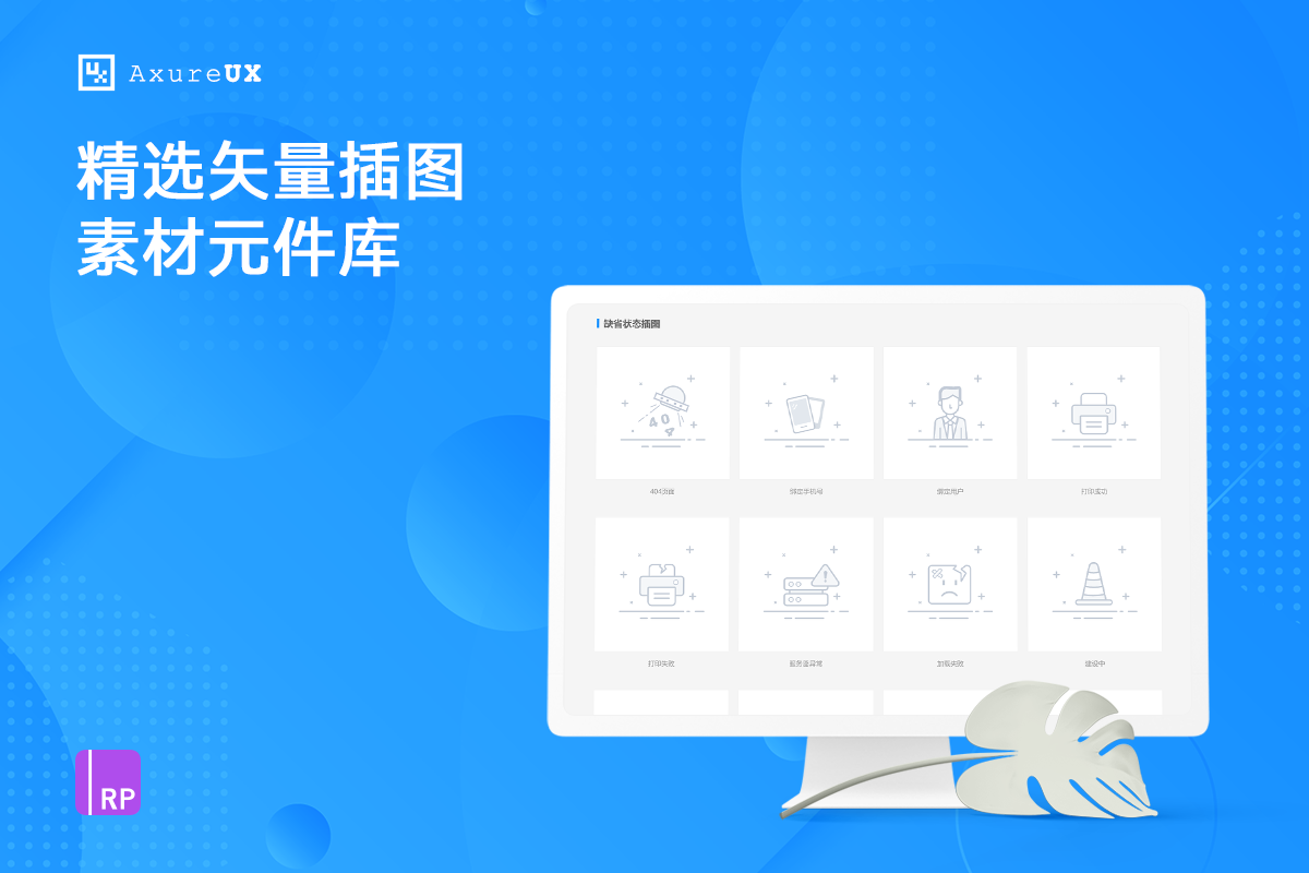 我们从Iconfont的数百套插图库中精选了30多套插图素材资源,包含状态反馈、行业场景、团队合作、人物形象、头像系列等各种实用的类型,全部插图素材均为SVG格式矢量图型,并且提供了rplib格式的元件库文件,可以导入到Axure元件面板中拖拽使用。这些插图素材可应用于内容卡片、缺省状态、登录模块、内容列表、通栏大图等各种组件的设计中,元件库中还提供了各种组件中素材的使用示例,可以方便的进行复用。