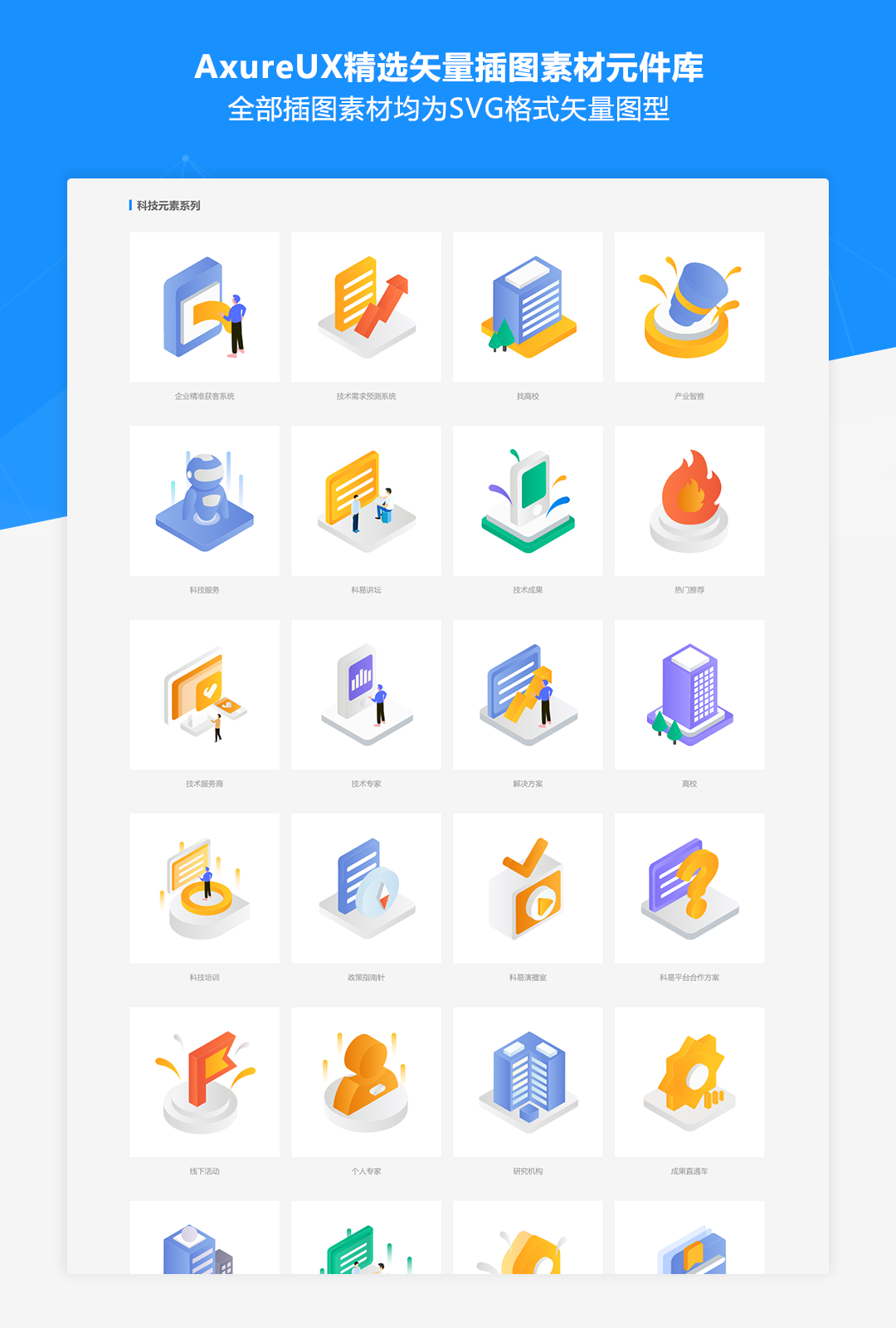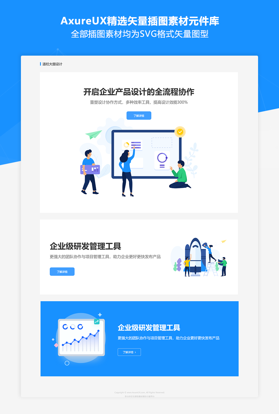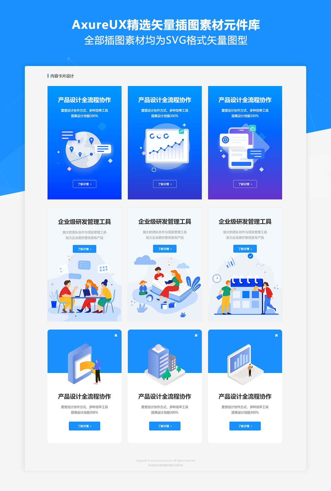 我们从Iconfont的数百套插图库中精选了30多套插图素材资源,包含状态反馈、行业场景、团队合作、人物形象、头像系列等各种实用的类型,全部插图素材均为SVG格式矢量图型,并且提供了rplib格式的元件库文件,可以导入到Axure元件面板中拖拽使用。这些插图素材可应用于内容卡片、缺省状态、登录模块、内容列表、通栏大图等各种组件的设计中,元件库中还提供了各种组件中素材的使用示例,可以方便的进行复用。