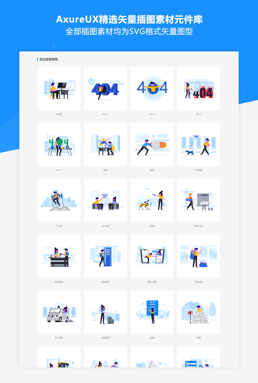 在原型设计时如果能合理的应用一些插图素材可以提升原型的设计感,让演示效果更加生动。在AxueUX的发布的相关原型作品中,同样也有很多插图素材的应用,经常有朋友咨询这些素材能够哪里获取到?为了方便大家进行使用,所以我们特别整理了这份矢量插图素材元件库。本元件库中的全部插图素材均整理自Iconfont,它是阿里巴巴体验团队打造的一个图标和插图资源库,包含了海量的图标和插图资源。