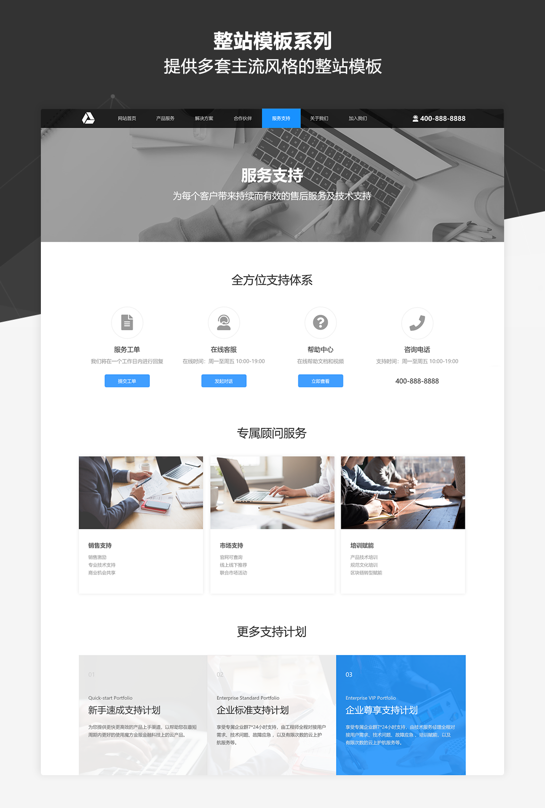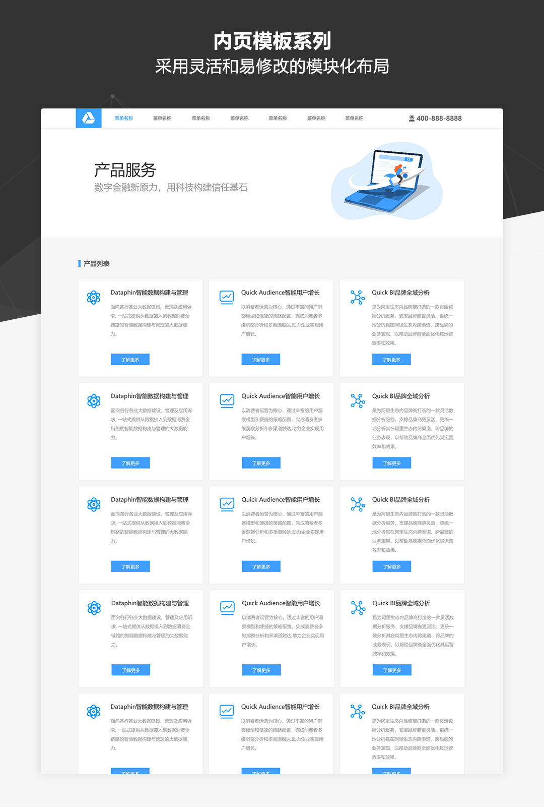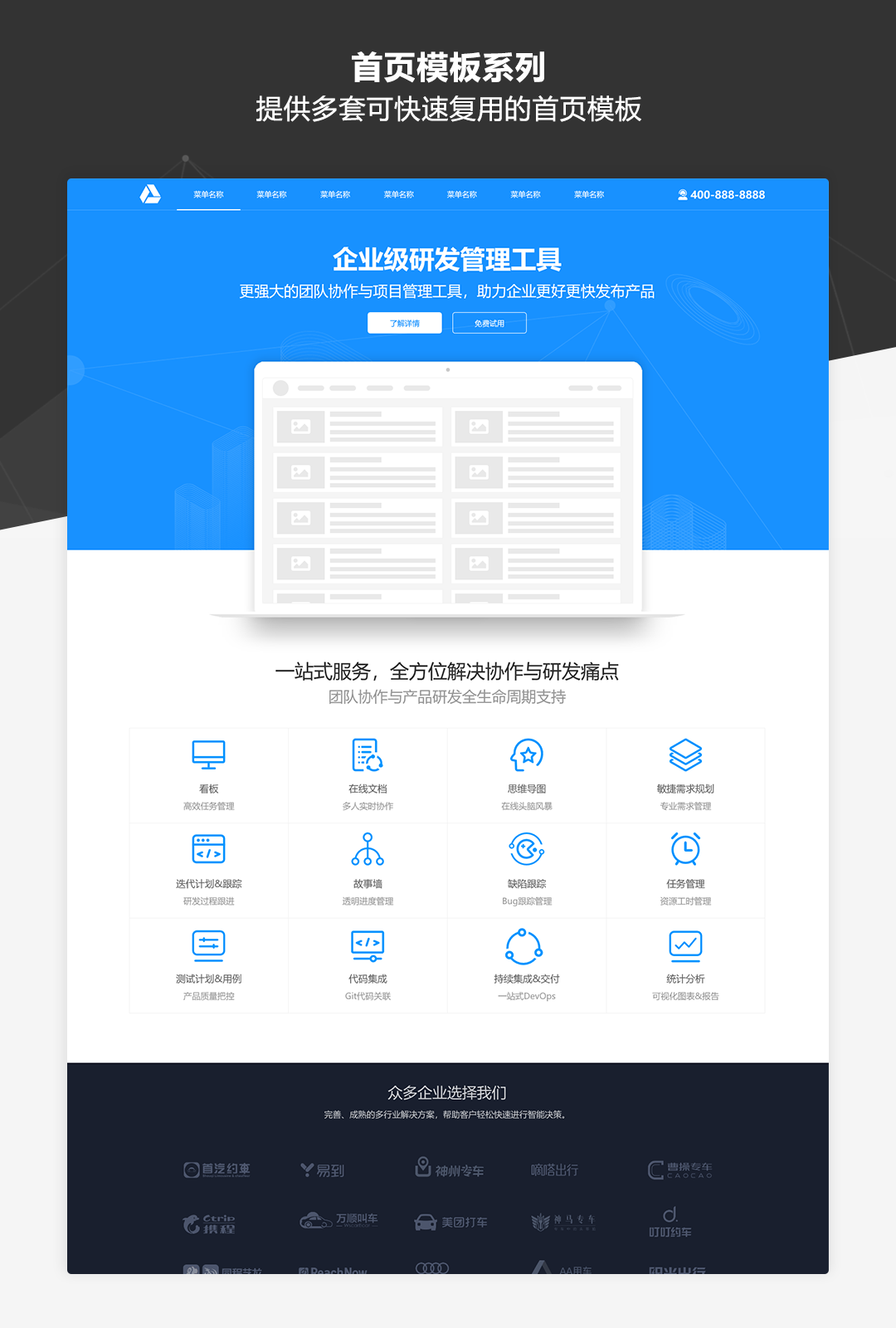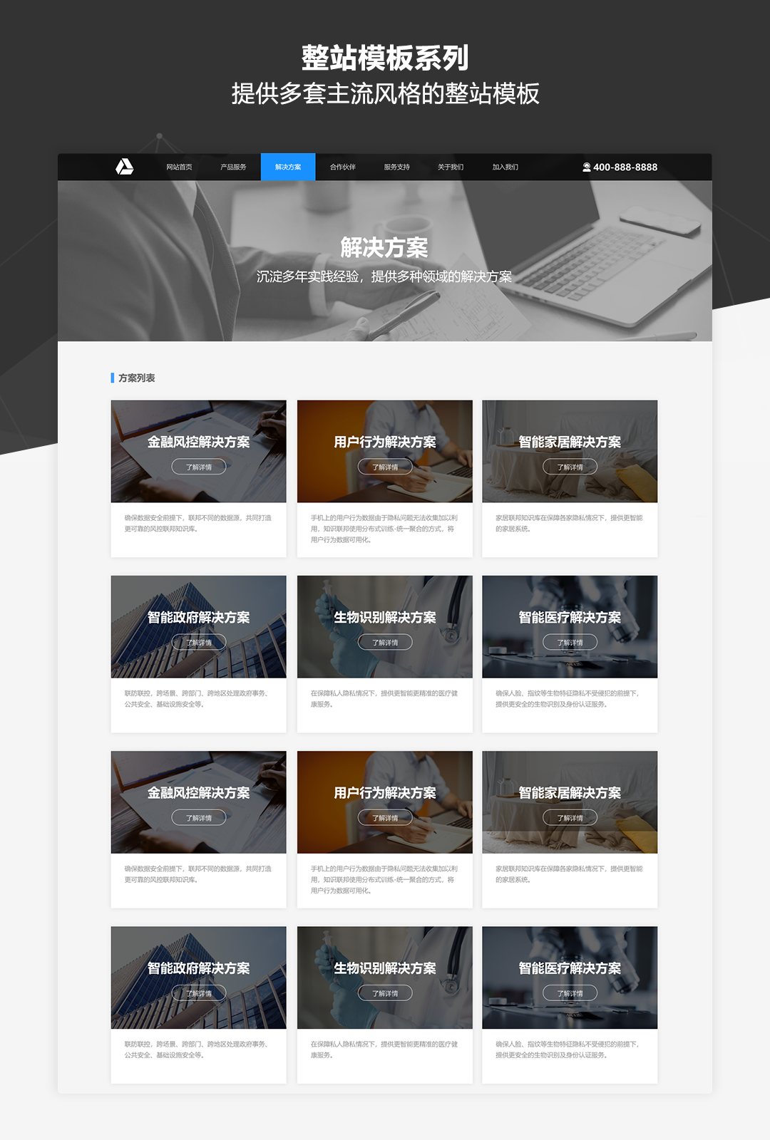 本作品是一套专为业务展示类网站而推出的原型模板库,适用于制作企业品牌官网、公司业务介绍、产品展示及营销等各类网站。作品中包含了符合目前主流展示类网站设计风格的丰富模板及素材,并以UI设计稿级别的高保真标准和符合Web规范的输出要求进行制作。即使不需要掌握太强的UI设计功底,通过本作品也可以快速搭建美观规范的业务展示类网站原型。