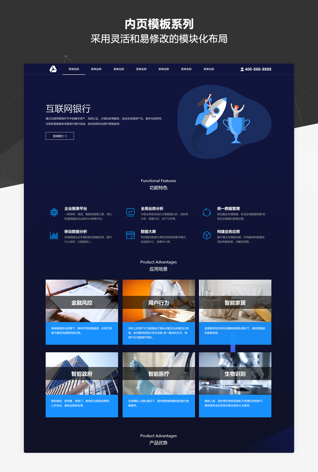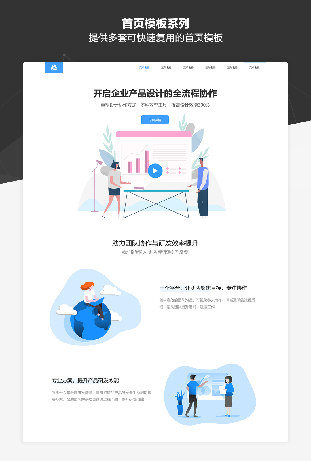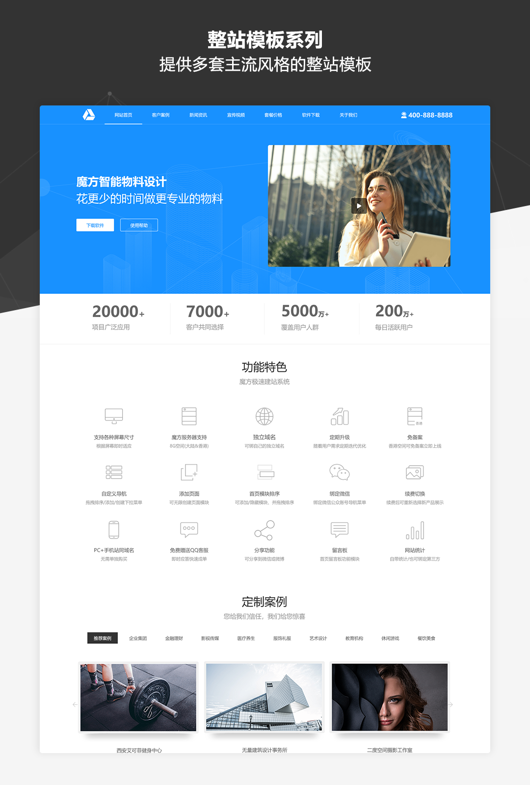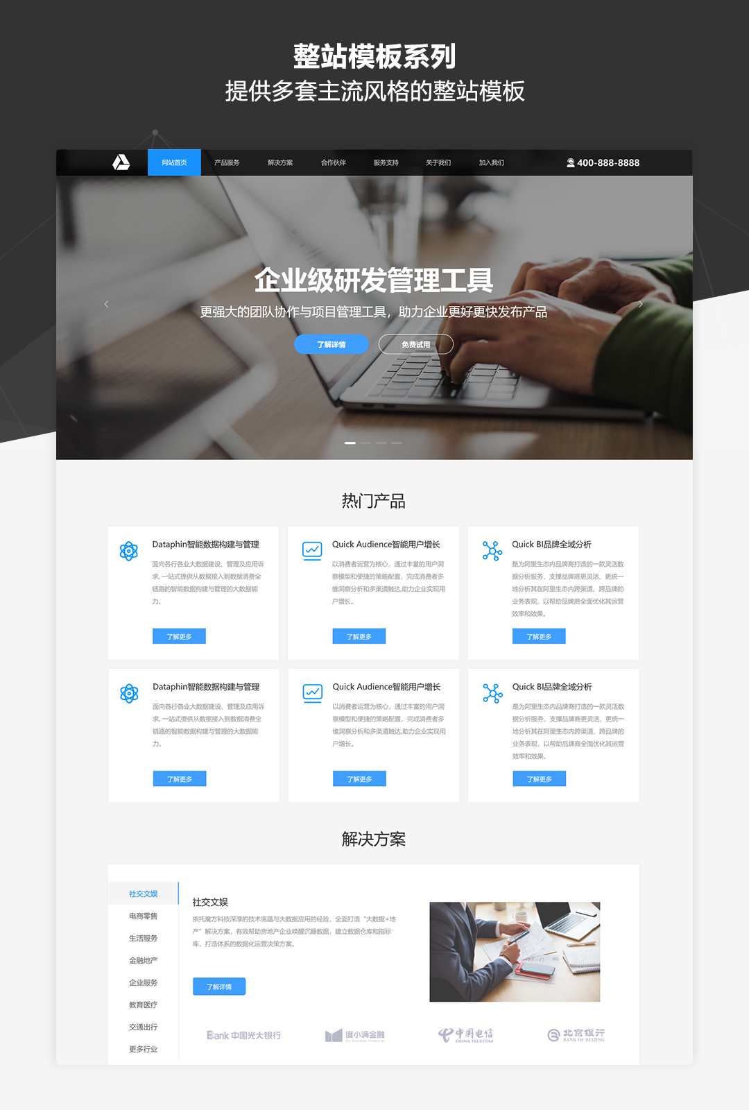 本作品是一套专为业务展示类网站而推出的原型模板库,适用于制作企业品牌官网、公司业务介绍、产品展示及营销等各类网站。作品中包含了符合目前主流展示类网站设计风格的丰富模板及素材,并以UI设计稿级别的高保真标准和符合Web规范的输出要求进行制作。即使不需要掌握太强的UI设计功底,通过本作品也可以快速搭建美观规范的业务展示类网站原型。