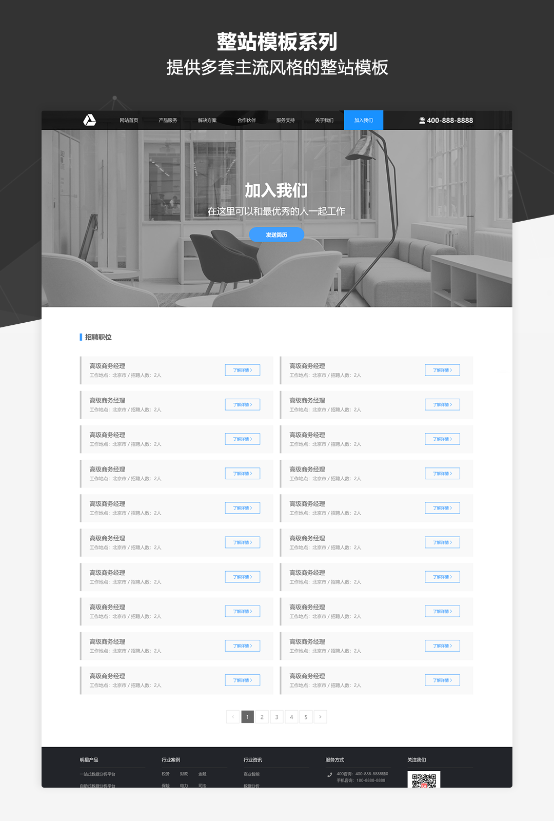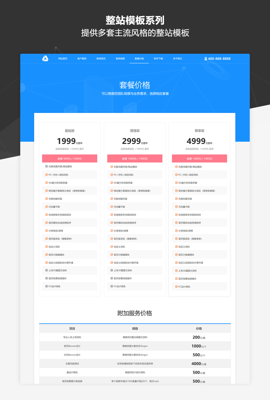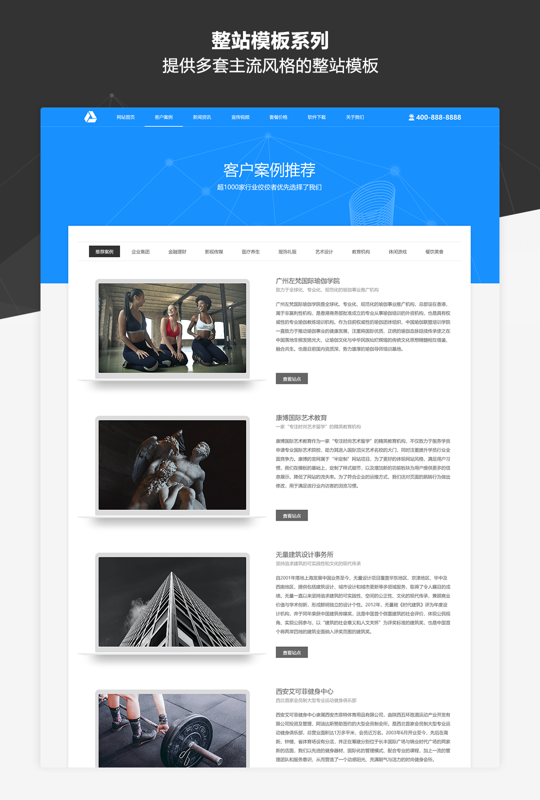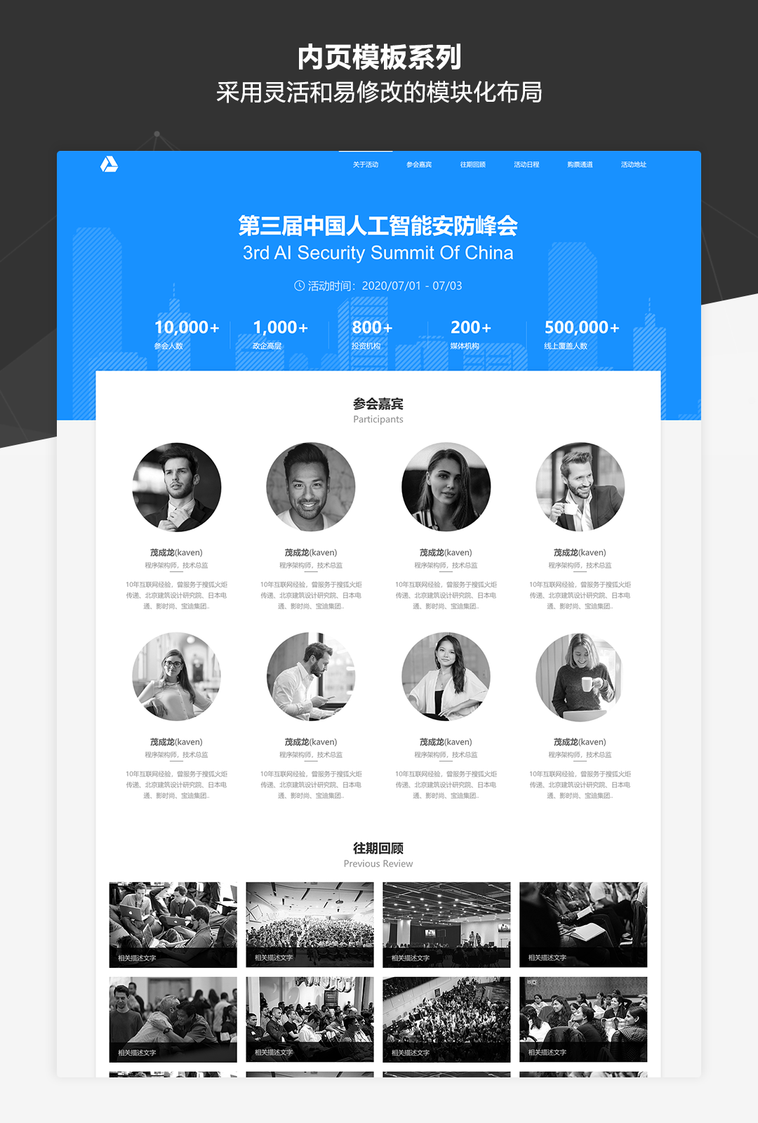 本作品是一套专为业务展示类网站而推出的原型模板库,适用于制作企业品牌官网、公司业务介绍、产品展示及营销等各类网站。作品中包含了符合目前主流展示类网站设计风格的丰富模板及素材,并以UI设计稿级别的高保真标准和符合Web规范的输出要求进行制作。即使不需要掌握太强的UI设计功底,通过本作品也可以快速搭建美观规范的业务展示类网站原型。