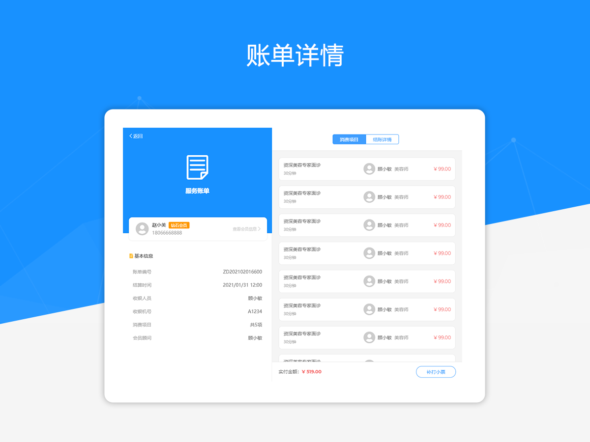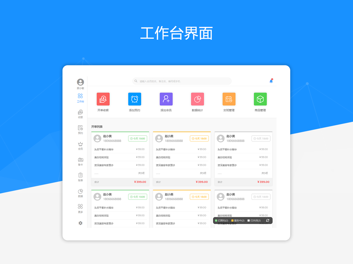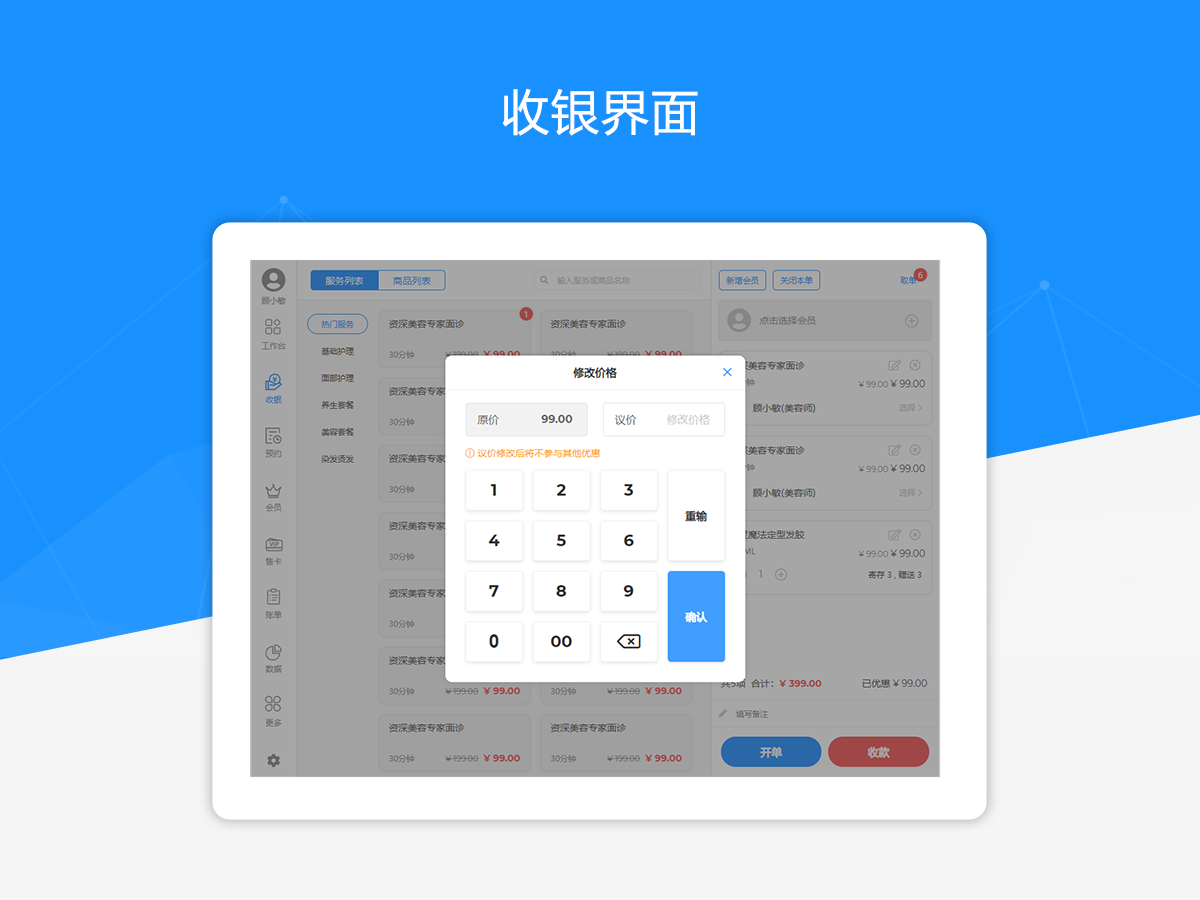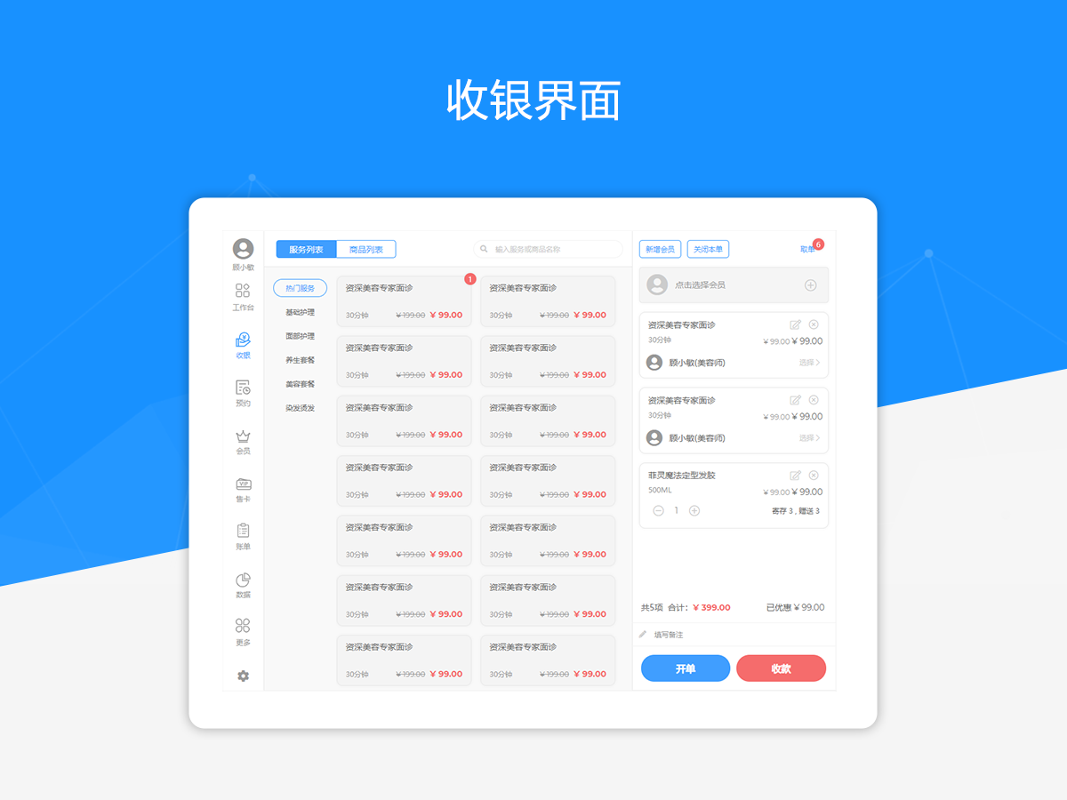数字门店系统主要用于帮助传统线下服务门店转型为移动互联网门店,通过线下和线上的结合,提高门店经营效率,并通过会员制管理帮助门店精细化管理和服务好顾客,提升顾客回头率,打造忠实客户,从而提升门店的营收和利润。一套优秀的门店解决方案,可以轻松实现门店高效运营管理,本作品是一套数字门店POS端的高保真交互原型模板,主要由收银开单、预约服务、会员管理、账单管理、数据统计、商品管理、库存管理等核心功能模块组成。本模板主要以美业经营业务场景设计,主要适用于美容美体、美甲美睫、医疗美容、美发造型、医疗诊所、中医理疗、宠物服务等服务行业,而模板中的收银、账单、会员、库存等管理功能同样适用于各种典型的门店系统,可以根据实际的行业和产品需求的进行扩展。本作品仅为数字门店系统中的一个终端模板,在后续我们将还可能继续推出配套的管理端WEB后台系统和用户端小程序的原型设计模板。