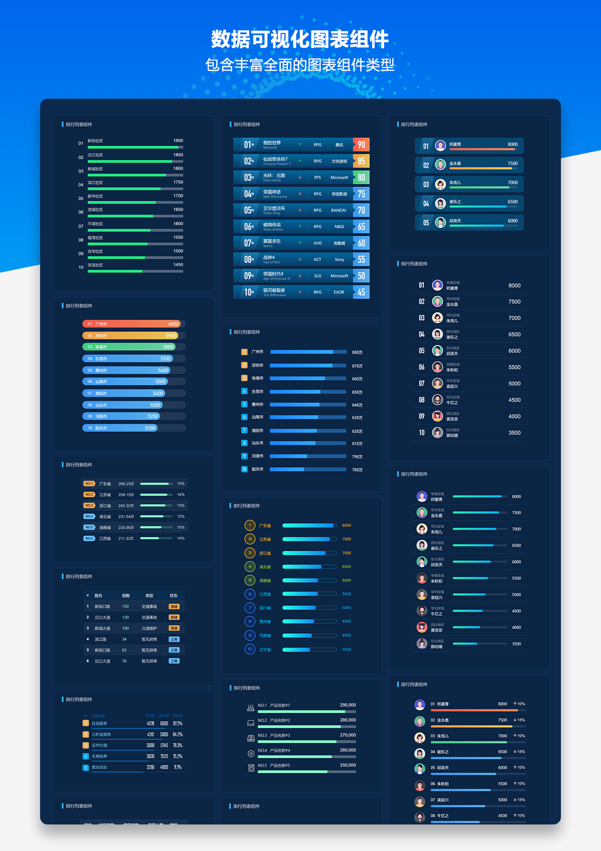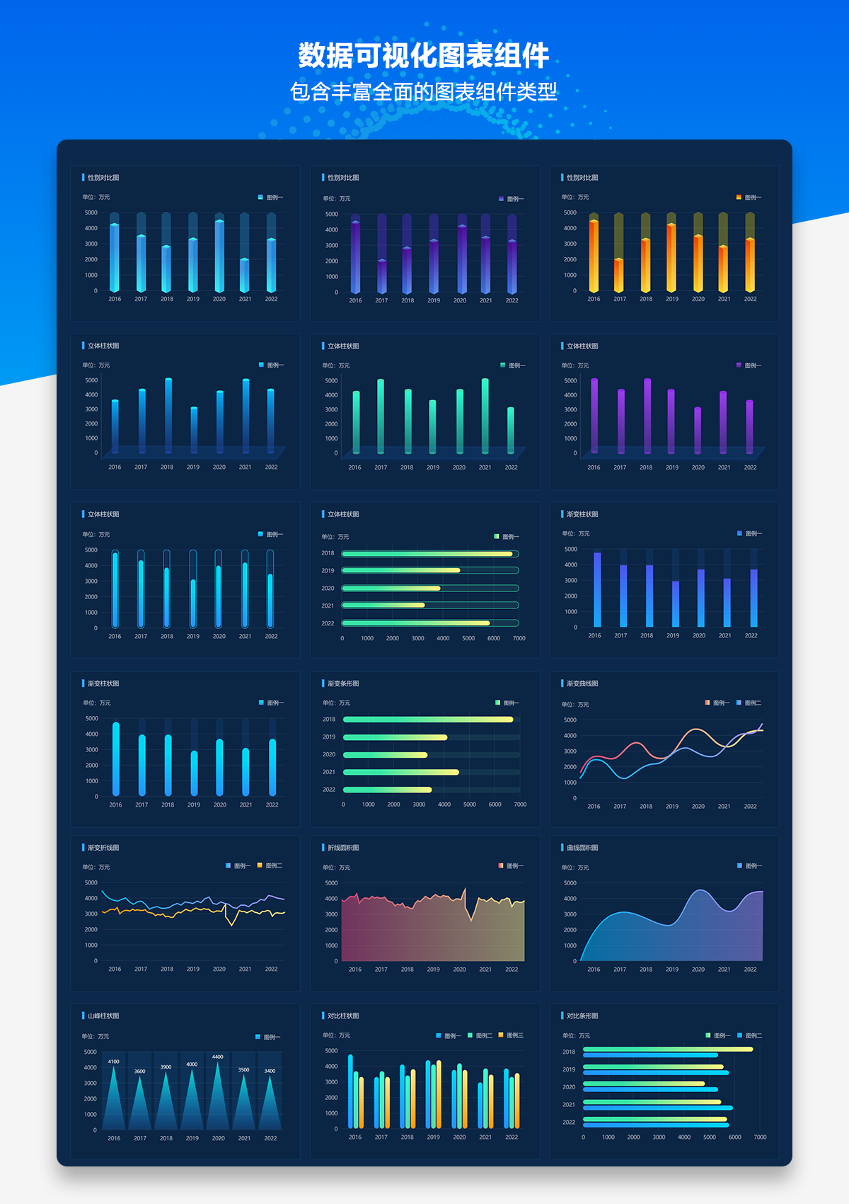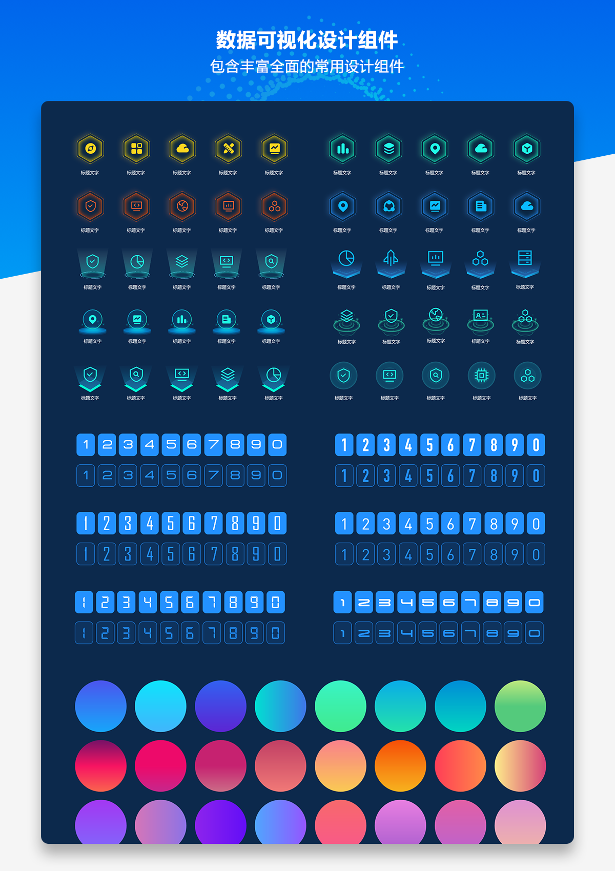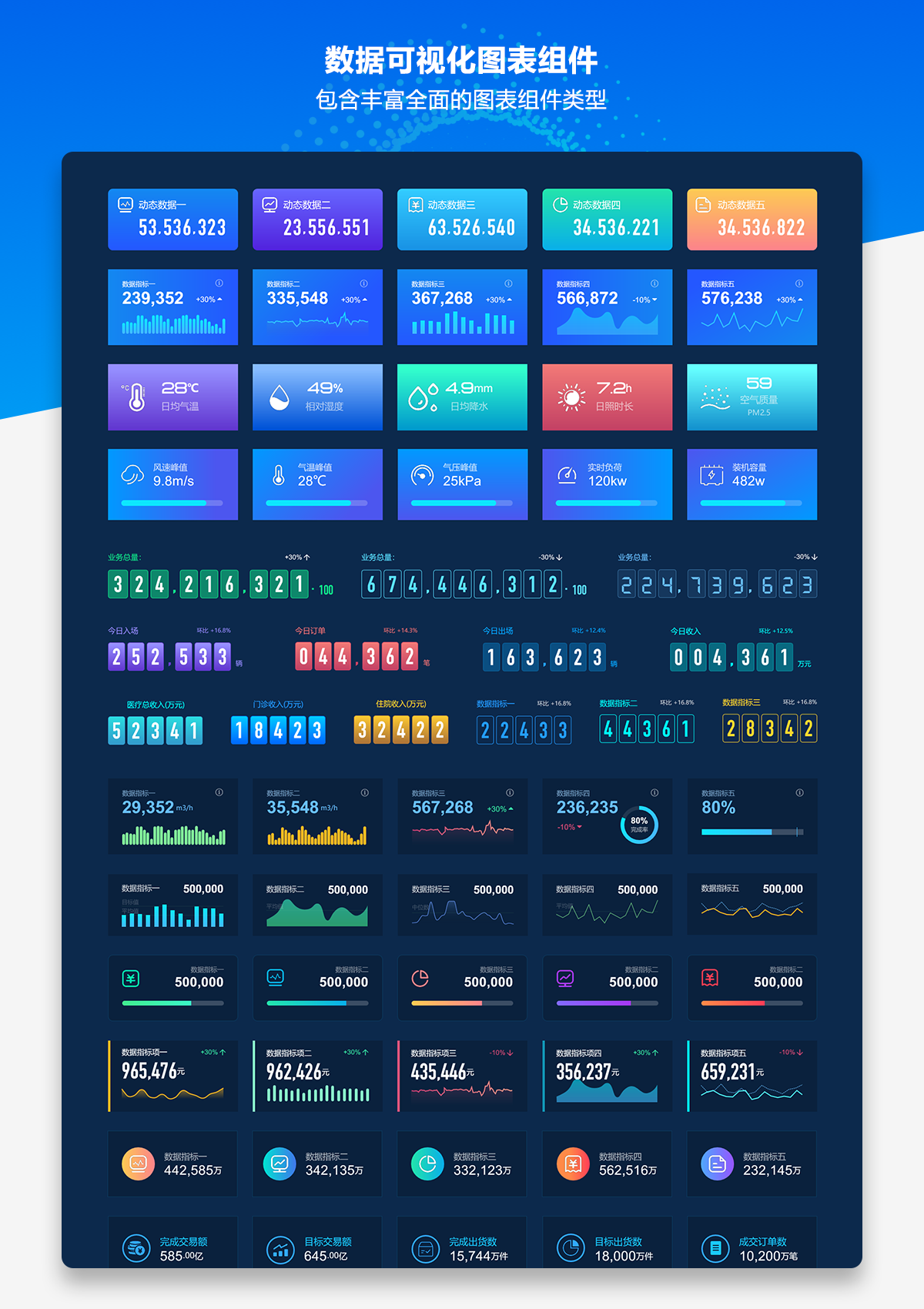除了提供现成的可视化模板案例,“授之以渔”也是我们在制作这套作品的一个重要思路,作品中分享的初始框架和图表设计组件,可以让大家有更多自由设计的发挥空间,而不仅仅只是在现有模板上进行修改。为了满足了更多的应用场景,作品中提供了数据百个各种类型和风格的图表组件,以及数值展示、排行展示、地图元素等图表相关的设计组件。大家在使用时可以尽情的发挥自己的创意和灵感,对作品中提供框架和组件进行组合扩展,制作出更炫酷的大屏可视化效果。
