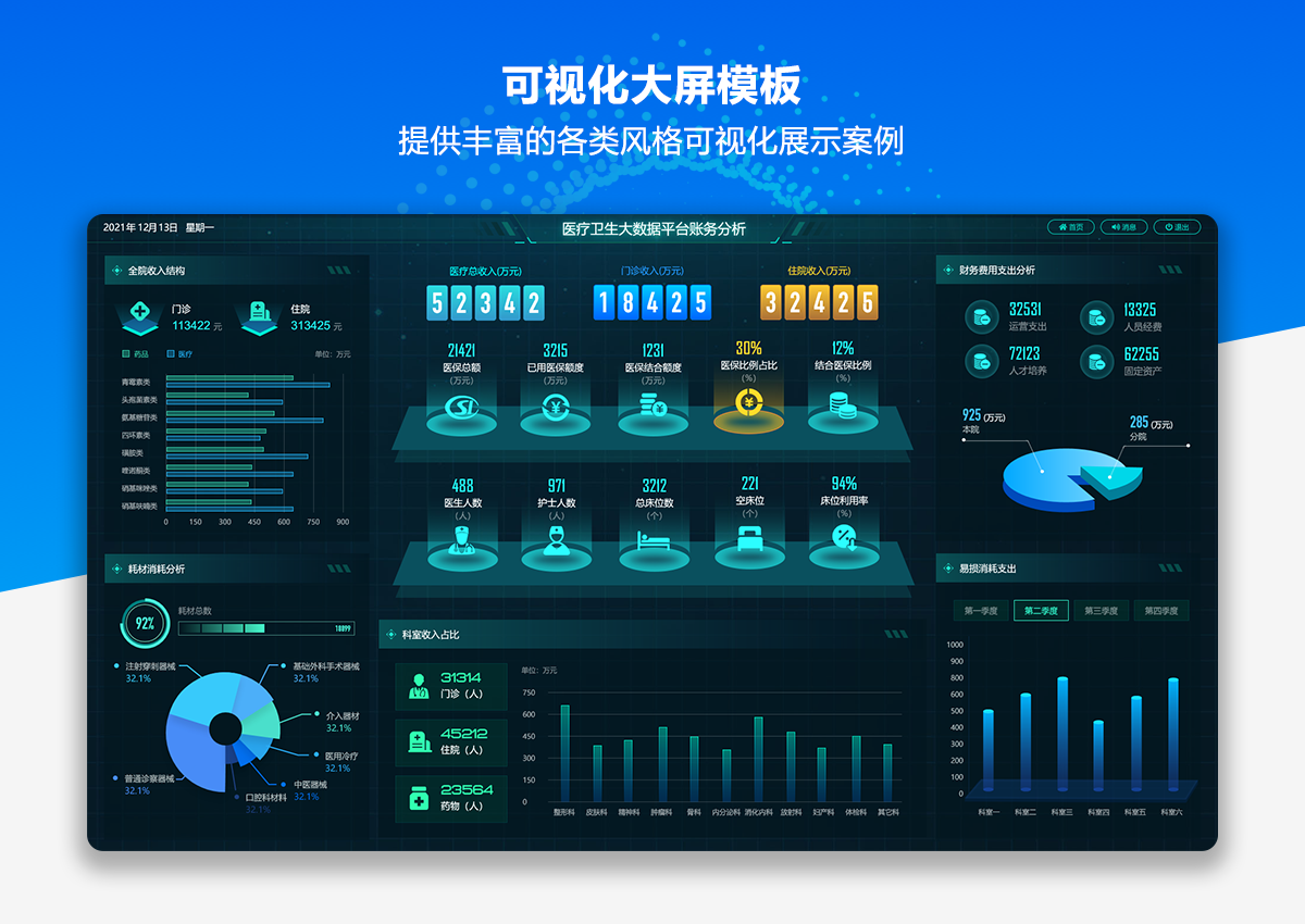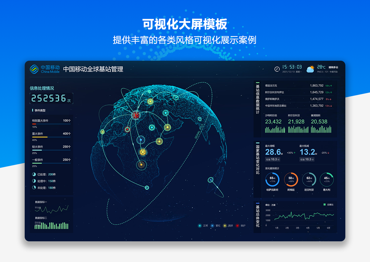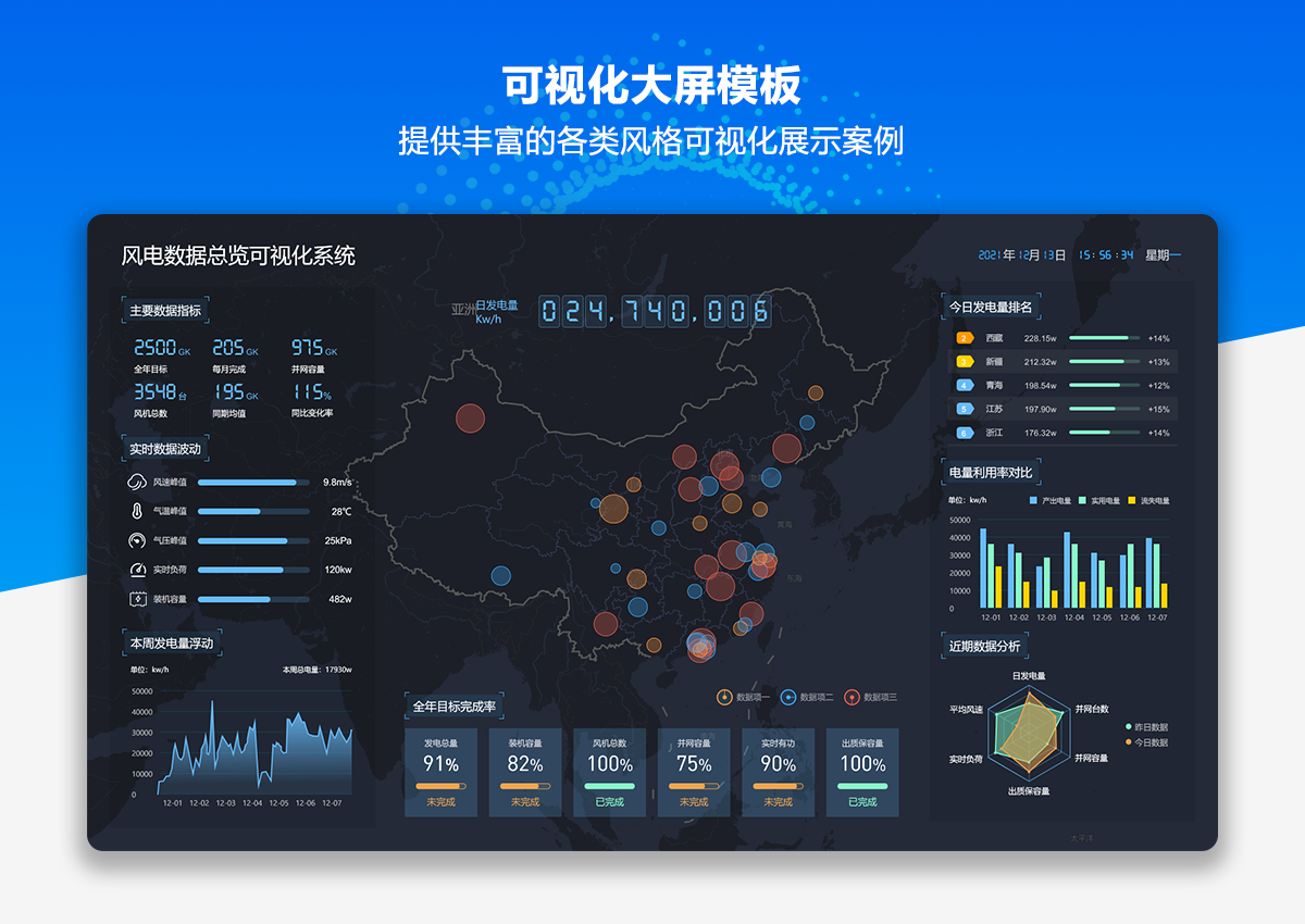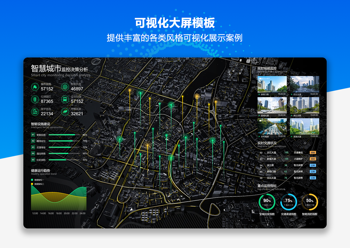 除了提供现成的可视化模板案例,“授之以渔”也是我们在制作这套作品的一个重要思路,作品中分享的初始框架和图表设计组件,可以让大家有更多自由设计的发挥空间,而不仅仅只是在现有模板上进行修改。为了满足了更多的应用场景,作品中提供了数据百个各种类型和风格的图表组件,以及数值展示、排行展示、地图元素等图表相关的设计组件。大家在使用时可以尽情的发挥自己的创意和灵感,对作品中提供框架和组件进行组合扩展,制作出更炫酷的大屏可视化效果。