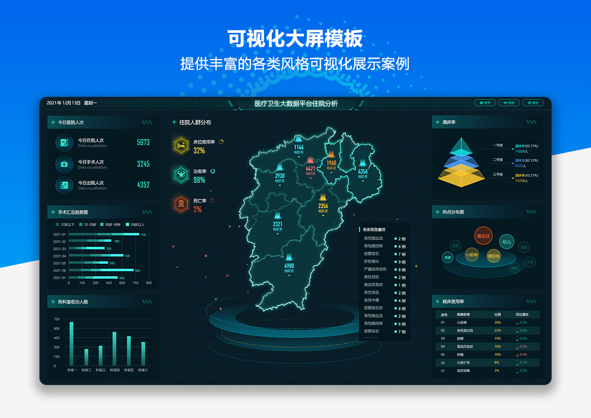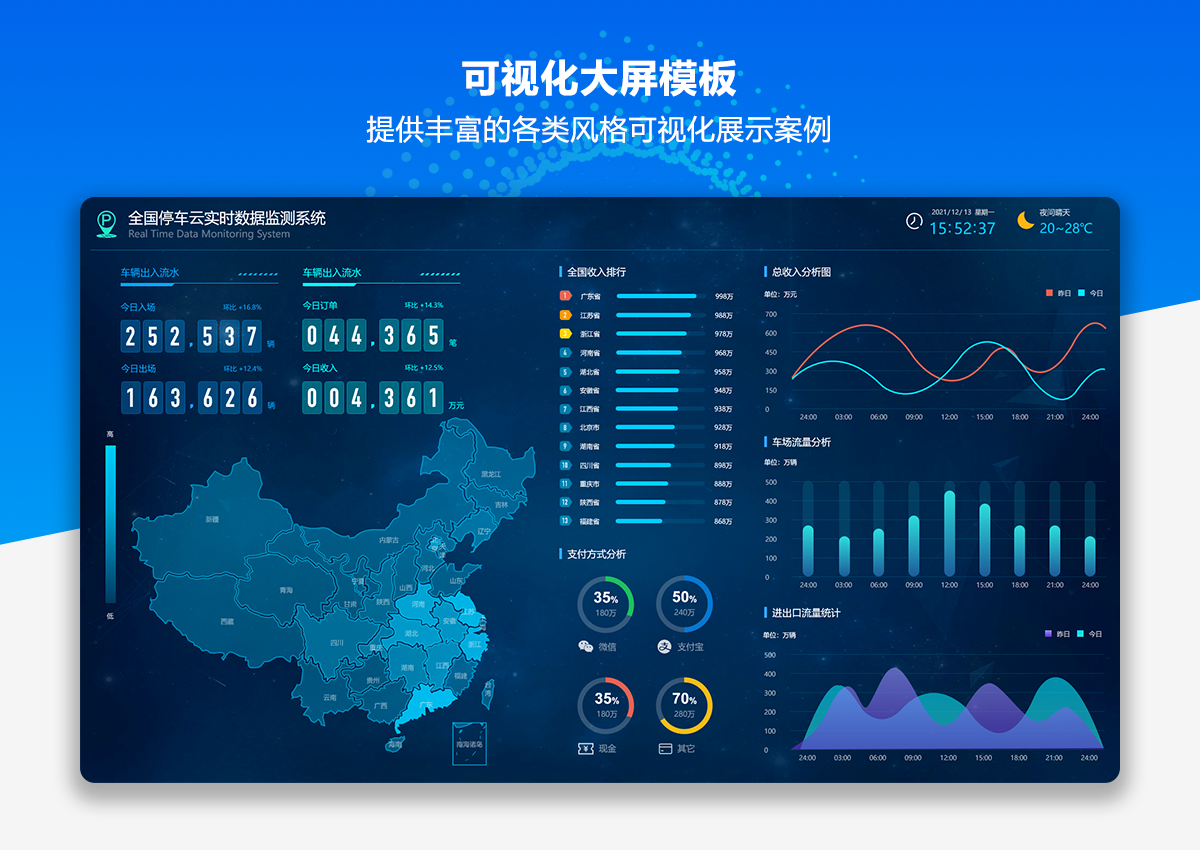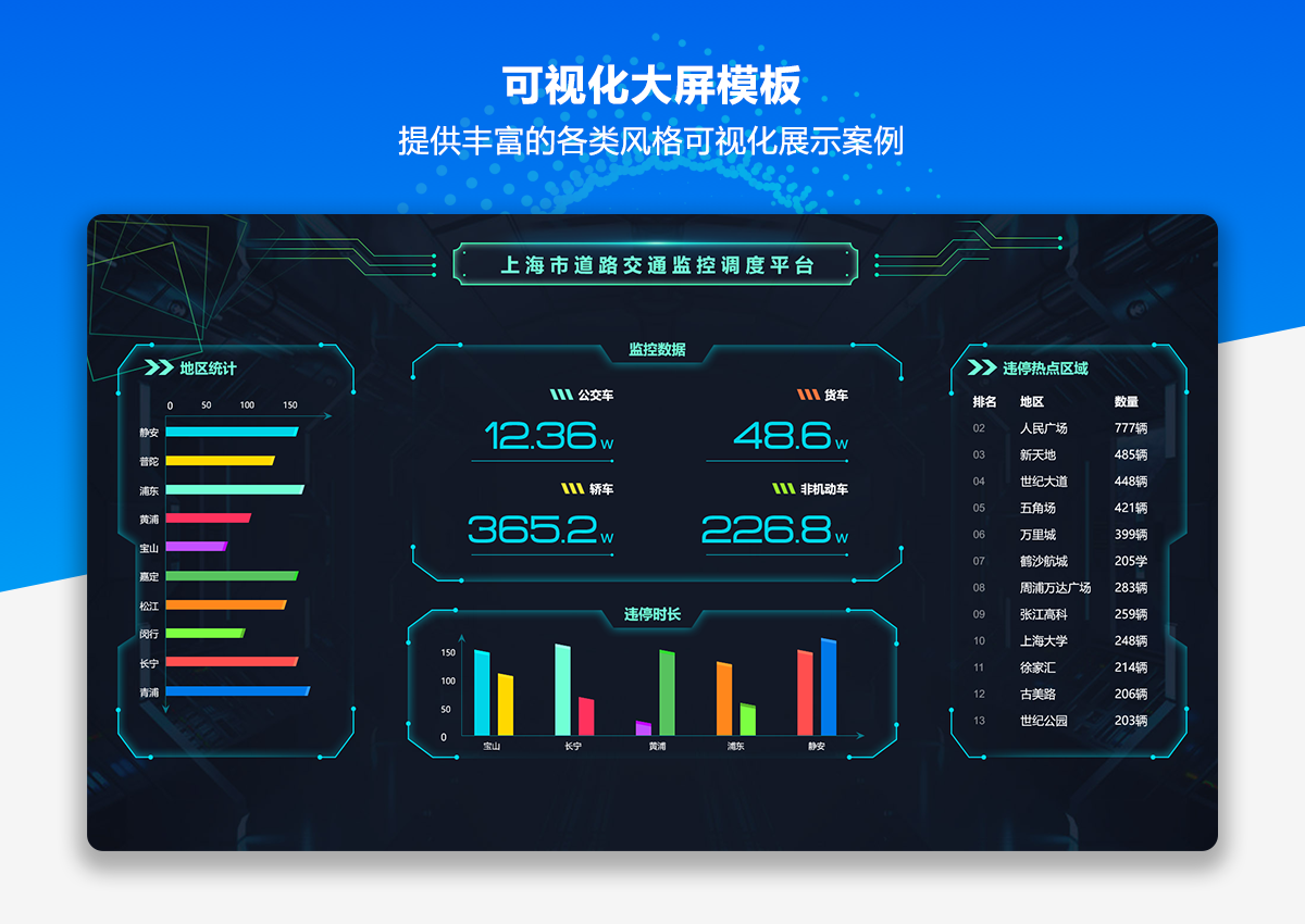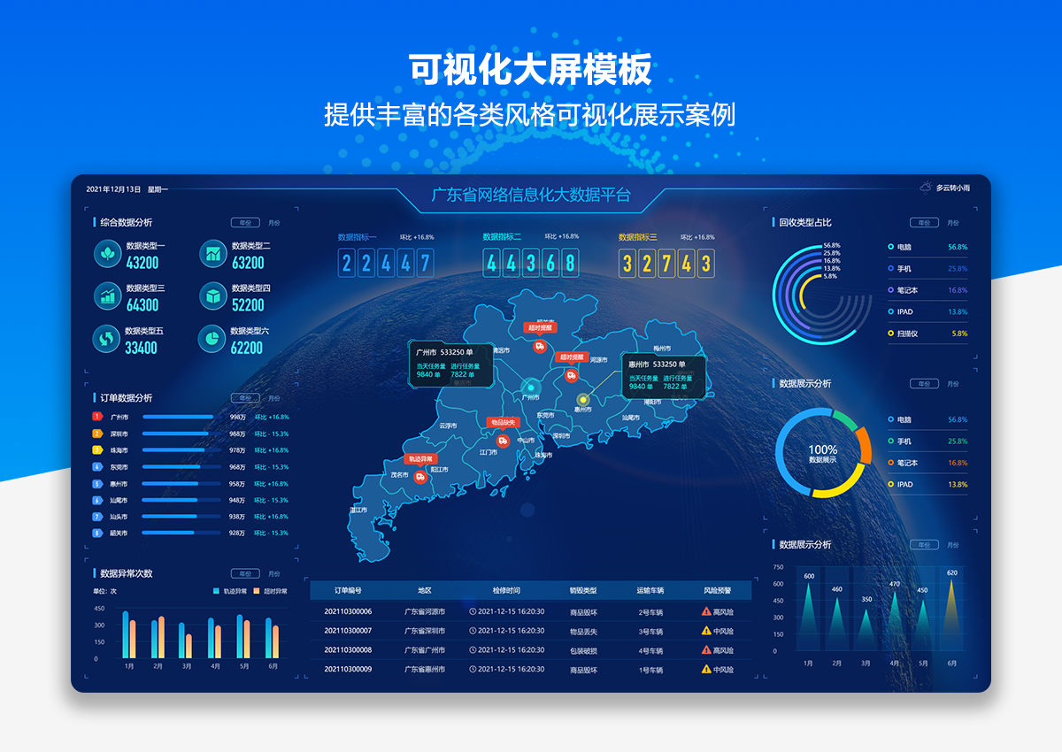 除了提供现成的可视化模板案例,“授之以渔”也是我们在制作这套作品的一个重要思路,作品中分享的初始框架和图表设计组件,可以让大家有更多自由设计的发挥空间,而不仅仅只是在现有模板上进行修改。为了满足了更多的应用场景,作品中提供了数据百个各种类型和风格的图表组件,以及数值展示、排行展示、地图元素等图表相关的设计组件。大家在使用时可以尽情的发挥自己的创意和灵感,对作品中提供框架和组件进行组合扩展,制作出更炫酷的大屏可视化效果。