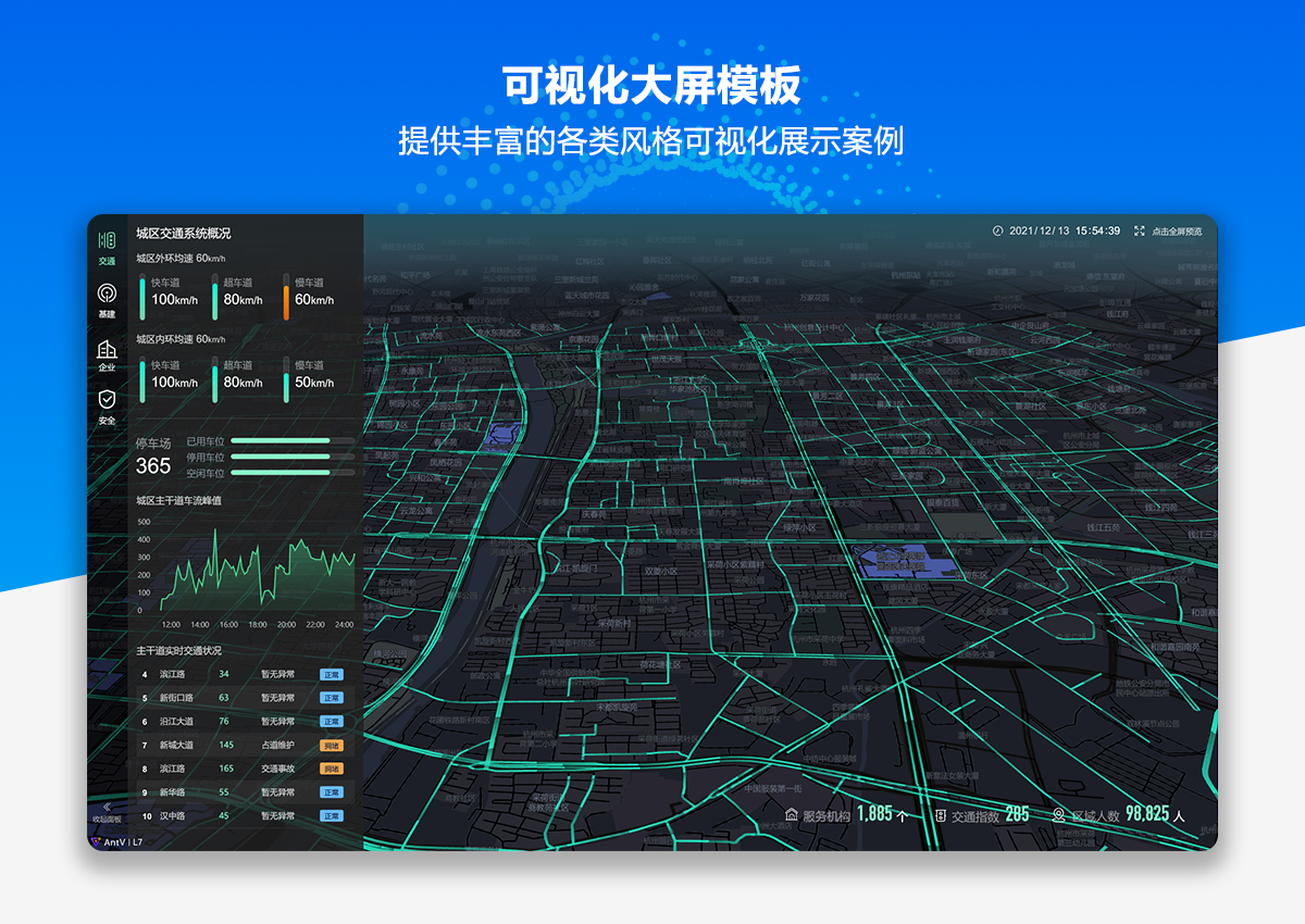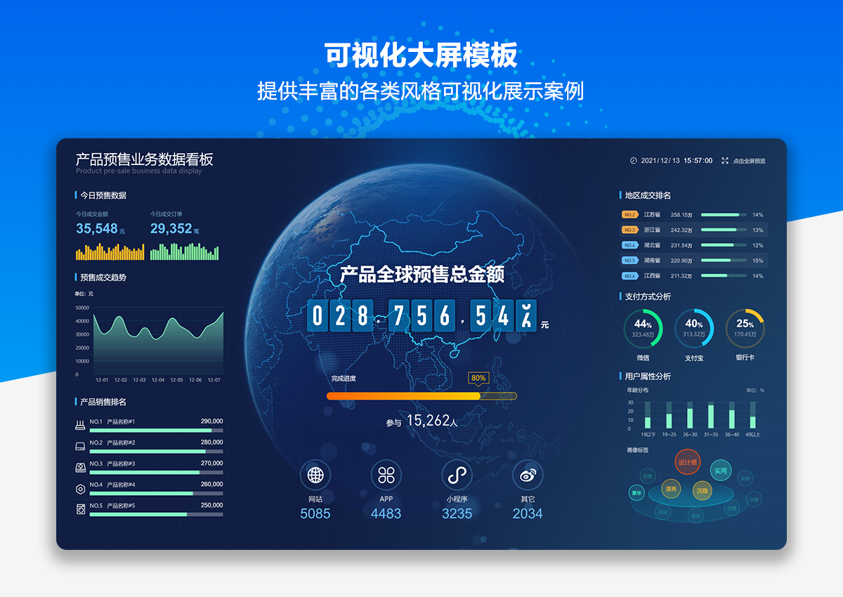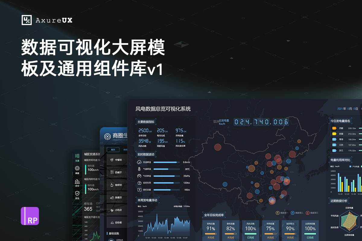 这是AxureUX推出的第一套数据可视化大屏模板作品,也是我们目前发布的所有作品中制作成本最高的一套。虽然目前市面上数据可视化大屏的作品已经有不少了,其中也不乏一些有亮点和特色的作品,但是这个主题依然有很多挖掘和探索的空间。为了力争给大家呈现一套更丰富和实用的数据可视化作品,而不仅是重复造轮子式的模仿和复制,我们从素材收集、内容梳理、设计制作等几个方面都投入了大量的时间和精力,最终完成了这套秉承“敏捷易用”设计理念的作品。
