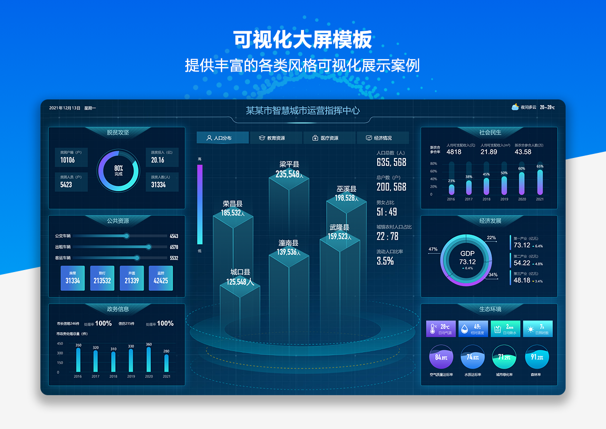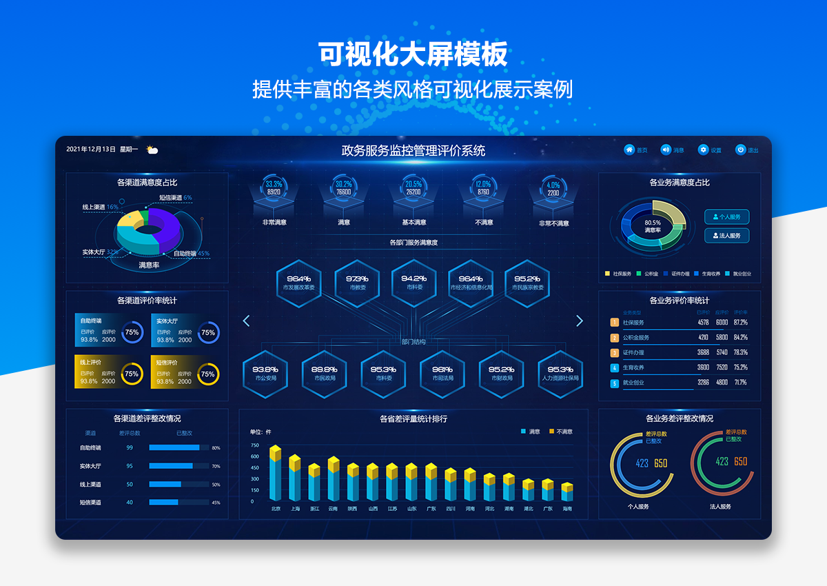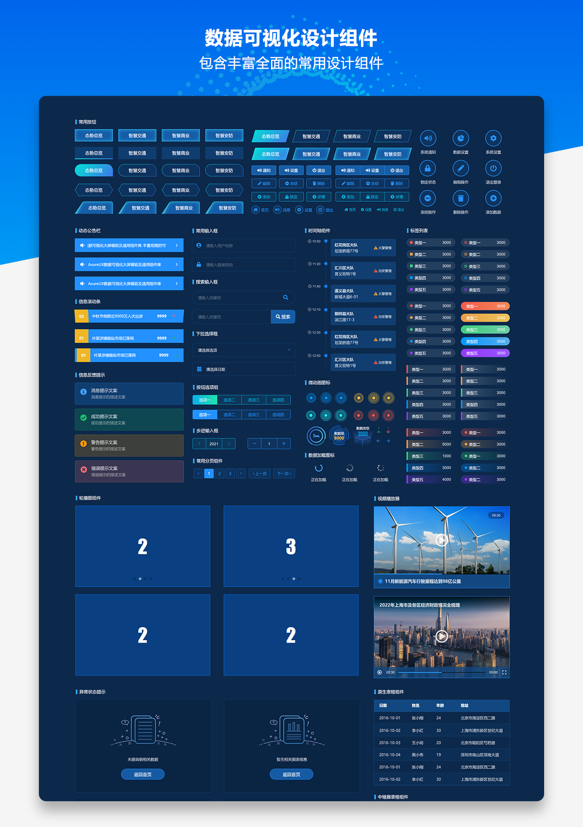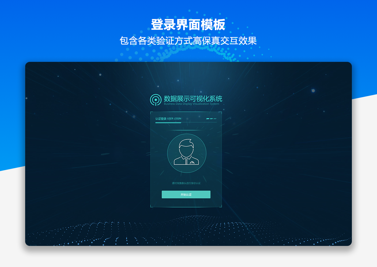 本作品的主要结构由大屏模板、登录界面、入口界面、初始框架、图表组件、设计组件等六大部分组成,其中前4部分为界面模板,后2部分为通用组件。在大屏模板中提供了各类风格和业务场景的大数据可视化展示案例,使用时可在模板的基础上直接进行修改,制作出相同风格的炫酷大屏呈现效果,目前其中提供的大屏模板数量为40套,后续我们还将持续进行更新完善。除此之外,其中还提供了多套各类风格的登录界面和入口界面模板,包含账号验证、验证码及滑块验证、人脸识别等各种高保真交互效果,可配合输出结构完整的数据可视化原型方案。